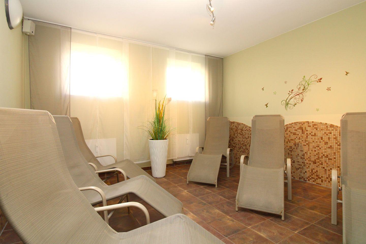 Das Wohn-/Esszimmer ist mit einer hochwertigen Ledersitzgruppe, einem Esstisch für vier Personen und einem Flachbildfernseher ausgestattet. Vom Wohnzimmer aus gelangen Sie direkt auf die großzügige, teilweise überdachte Terrasse (nach Westen ausgerichtet) mit Terrassenmöbeln, wo Sie die Natur und die grüne Umgebung genießen können.