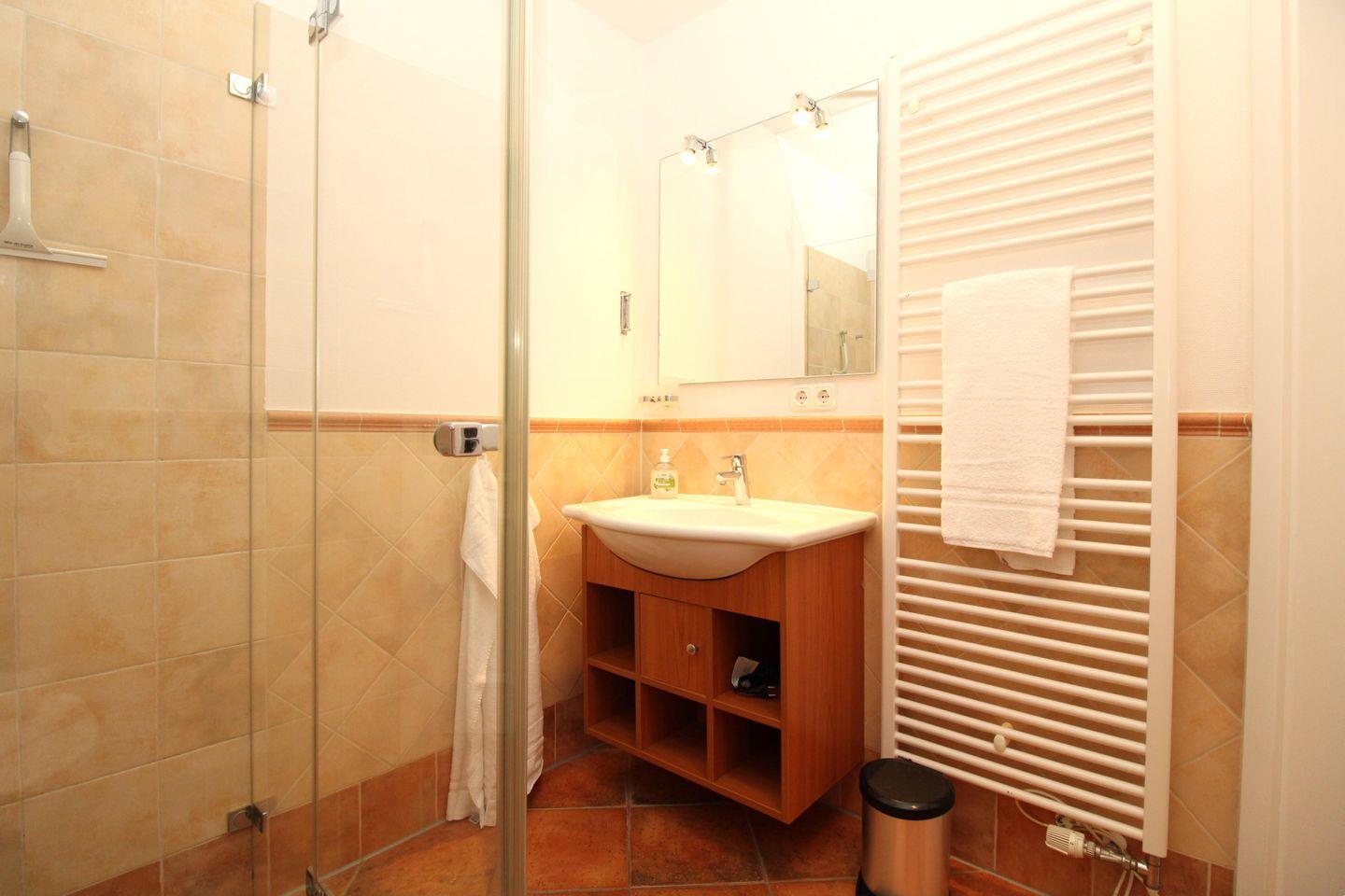 Das großzügige Badezimmer verfügt über eine barrierefreie Dusche, ein Waschbecken mit Unterschrank, ein WC, einen Föhn und einen beheizten Handtuchhalter.