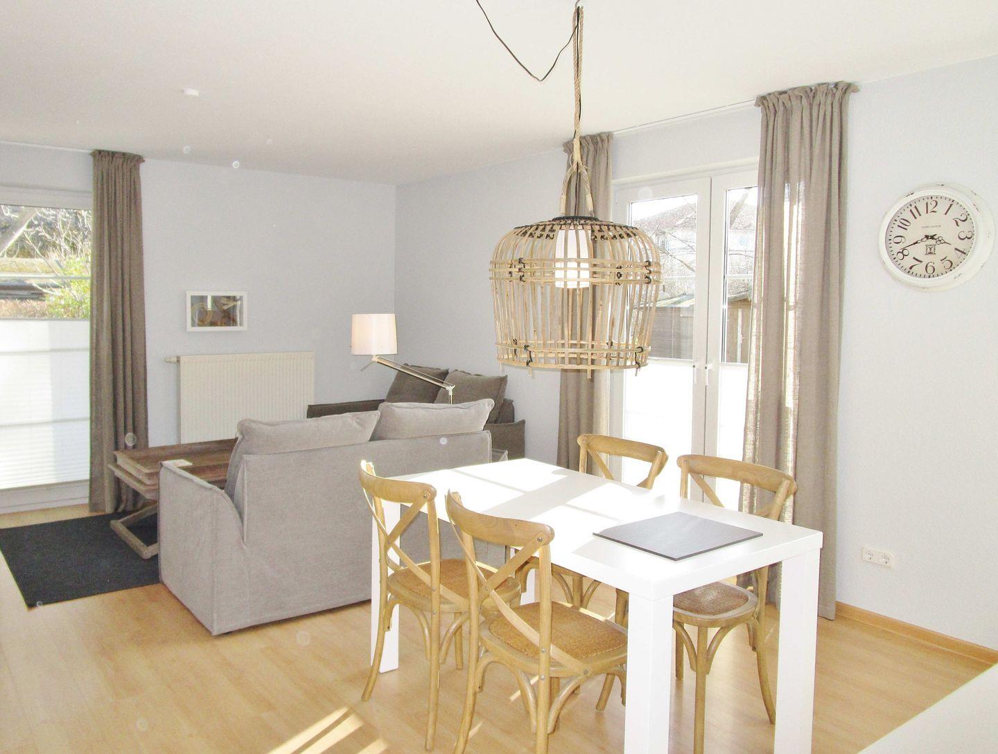 Das lichtdurchflutete, moderne und hochwertig eingerichtete Wohn-/Esszimmer verfügt über eine separate Sitzgruppe mit 2 bequemen 2-Sitzer-Sofas, einen Couchtisch, einen separaten Esstisch mit 4 Stühlen sowie ein Sideboard. Vom Wohnzimmer aus haben Sie direkten Zugang zu der ca. 10 m² großen, sonnigen sowie überdachten Terrasse (nach Süden und Westen ausgerichtet) mit Terrassenmöbeln. Hier sitzen Sie entspannt und gemütlich mitten im Grünen und können bei einem guten Glas Wein die lauen Sommernächte genießen …!