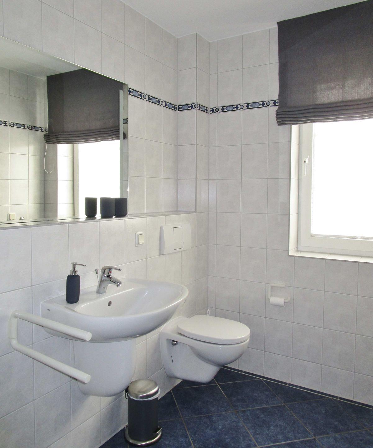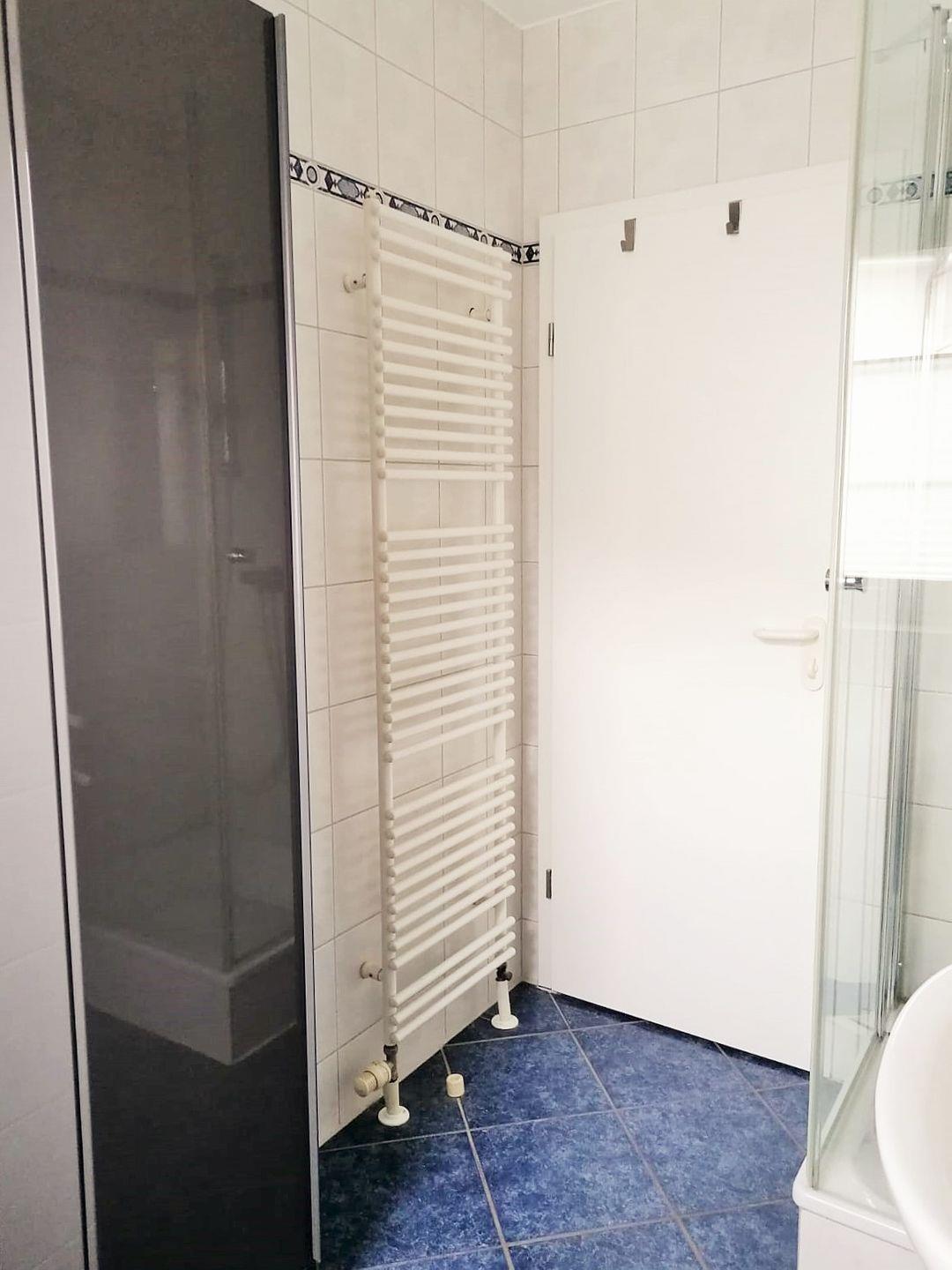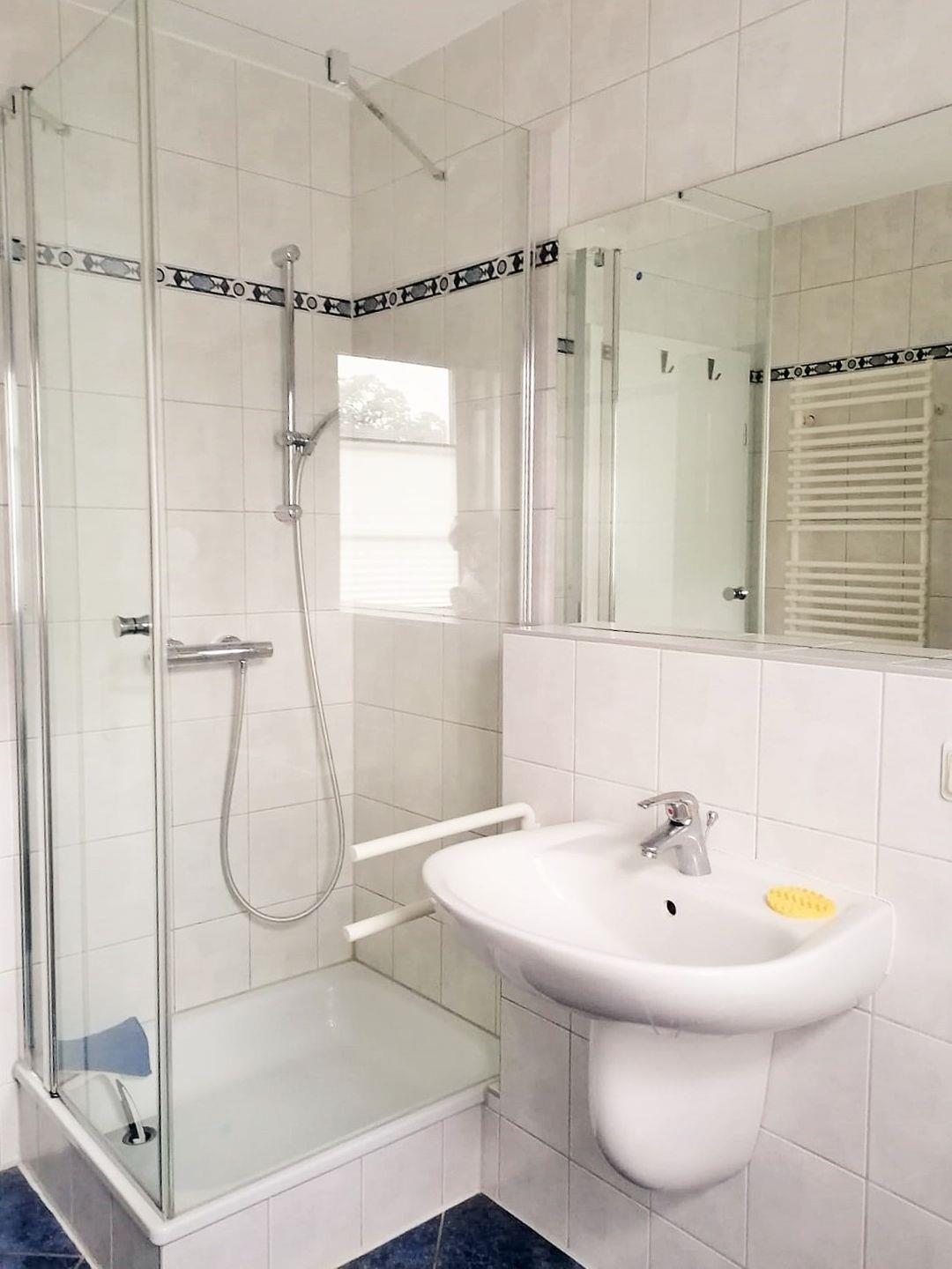 Das helle und geräumige Badezimmer (mit Tageslicht / Fenster) verfügt über eine Dusche, Waschbecken und WC, einen Handtuch-Heizkörper sowie ausreichend Ablagemöglichkeiten.