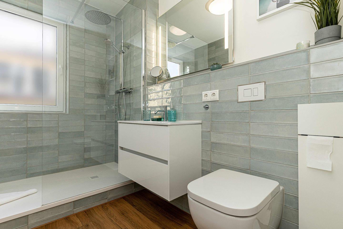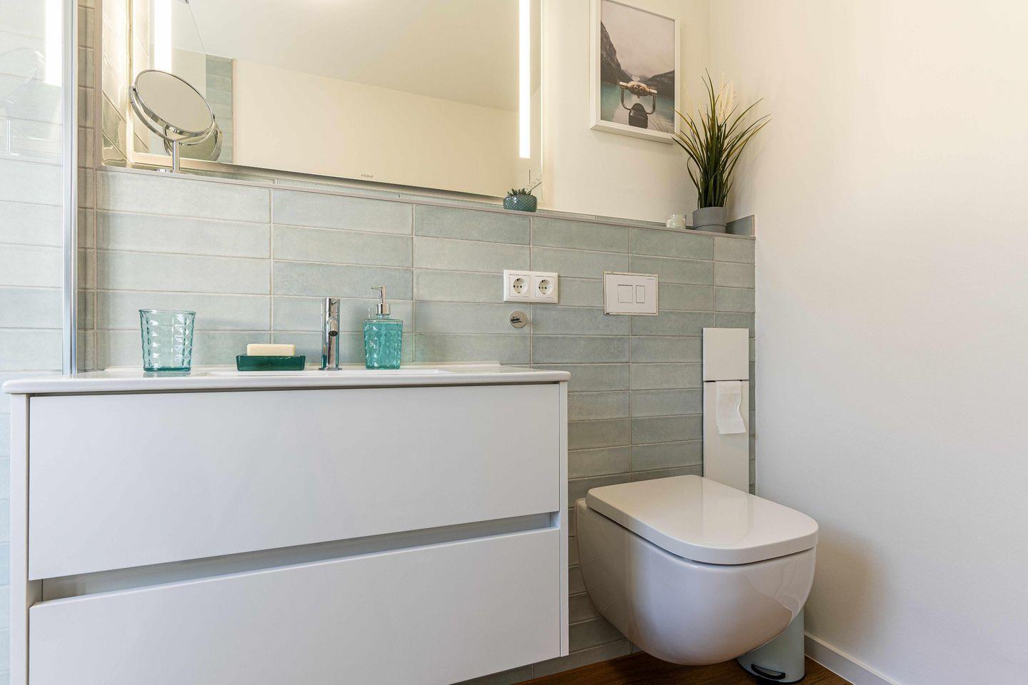 Das helle und geräumige Badezimmer (mit Tageslicht / Fenster) verfügt über eine moderne Dusche, Waschbecken und WC, einen Badezimmerschrank, einen Handtuch-Heizkörper sowie ausreichend Ablagemöglichkeiten.