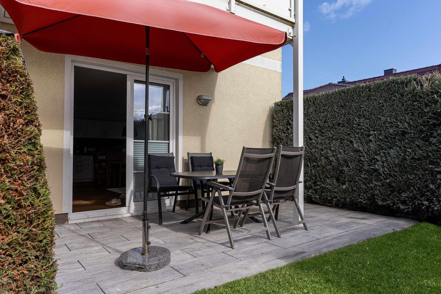 Das exklusiv eingerichtete und sehr gemütliche Wohn-/Esszimmer verfügt über eine separate Sitzgruppe mit einer bequemen Eck-Ledercouch und Couchtisch, einen separaten Esstisch mit 6 Stühlen sowie ein Sideboard und verschiedene Regale. Vom Wohnzimmer aus haben Sie direkten Zugang zu der ca. 8 m² großen und sonnigen sowie teilweise überdachten Terrasse (nach Süden ausgerichtet) mit Terrassenmöbeln und einem Kohlegrill - hier sitzen Sie entspannt und gemütlich mitten im Grünen und können bei einem guten Glas Wein die lauen Sommernächte genießen …!