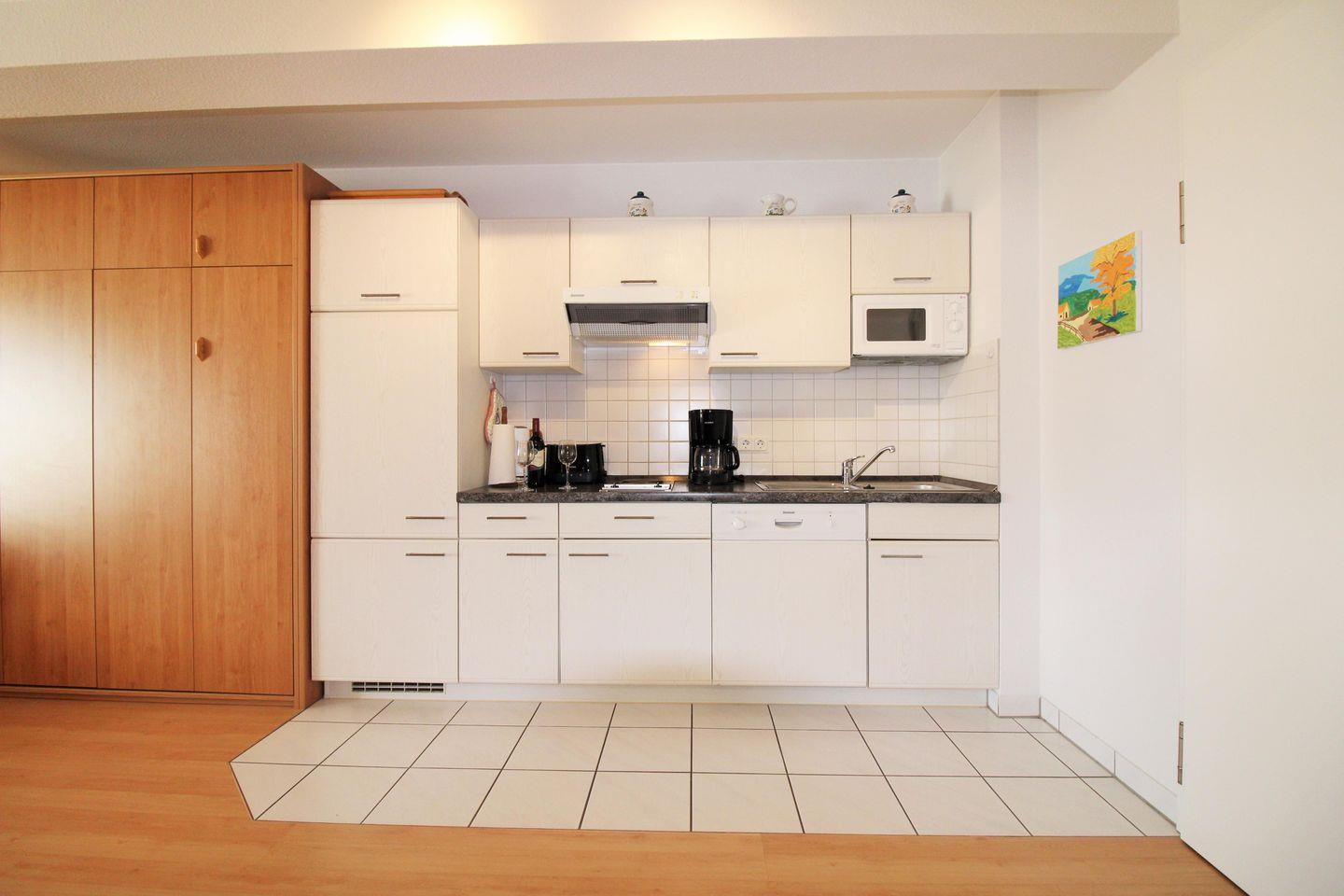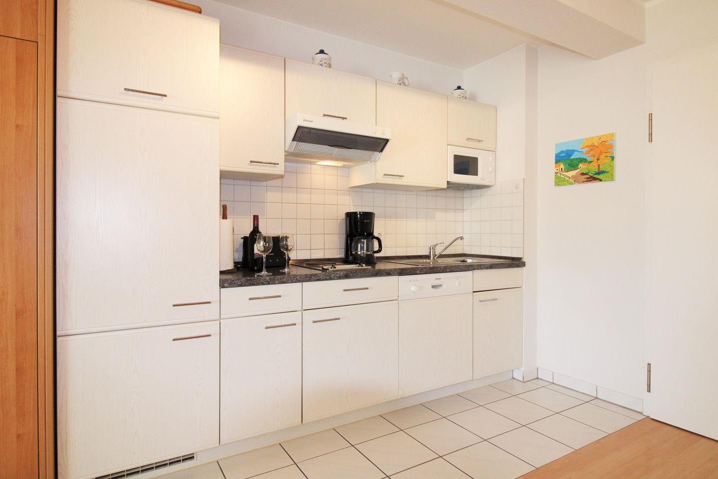 Die moderne offene Küche beinhaltet eine voll ausgestattete Einbauküchenzeile mit 2-Platten-Herd, Mikrowelle, Dunstabzug, Kühlschrank, Geschirrspülmaschine, Kaffeemaschine, Wasserkocher und Toaster. Die Küche ist mit Geschirr, Gläsern, Besteck und Töpfen bestens und ausreichend ausgestattet.