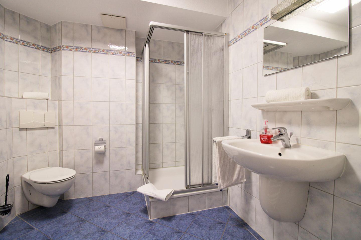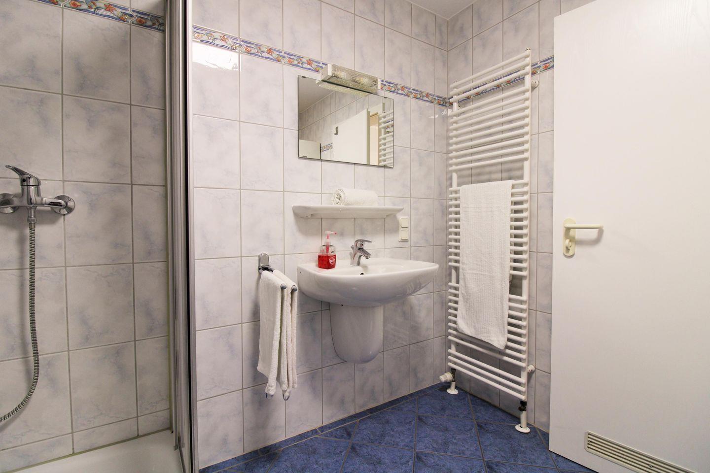 Das helle und freundliche Badezimmer verfügt über eine Dusche, Waschbecken, WC, einen kleinen Badezimmerschrank, einen Handtuch-Heizkörper sowie ausreichend Ablage-möglichkeiten.
