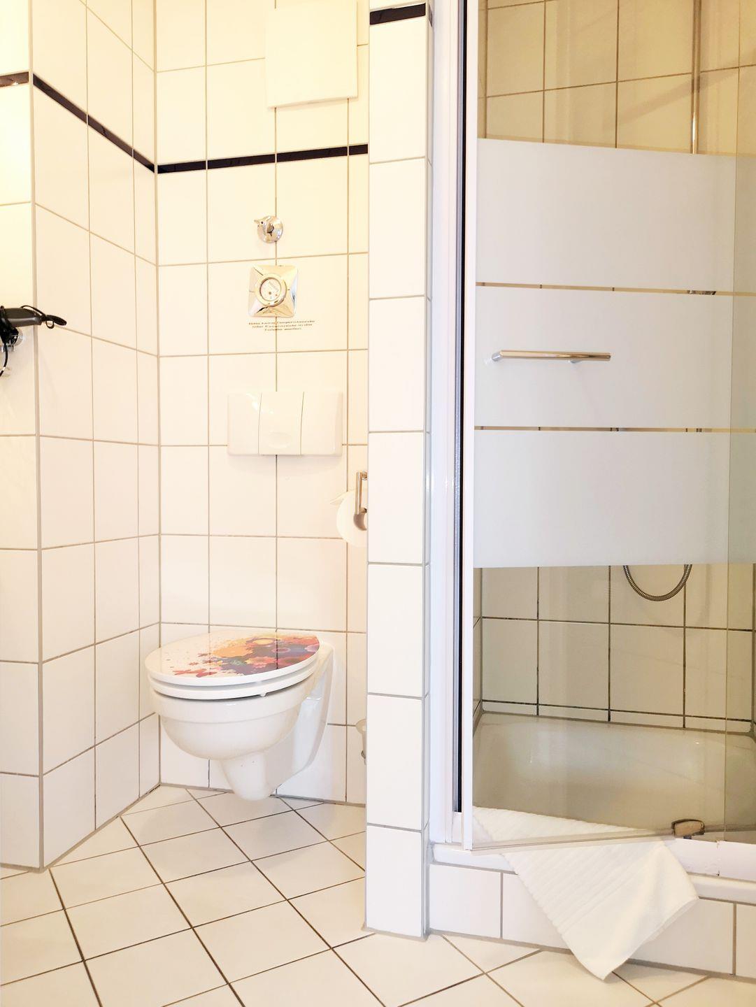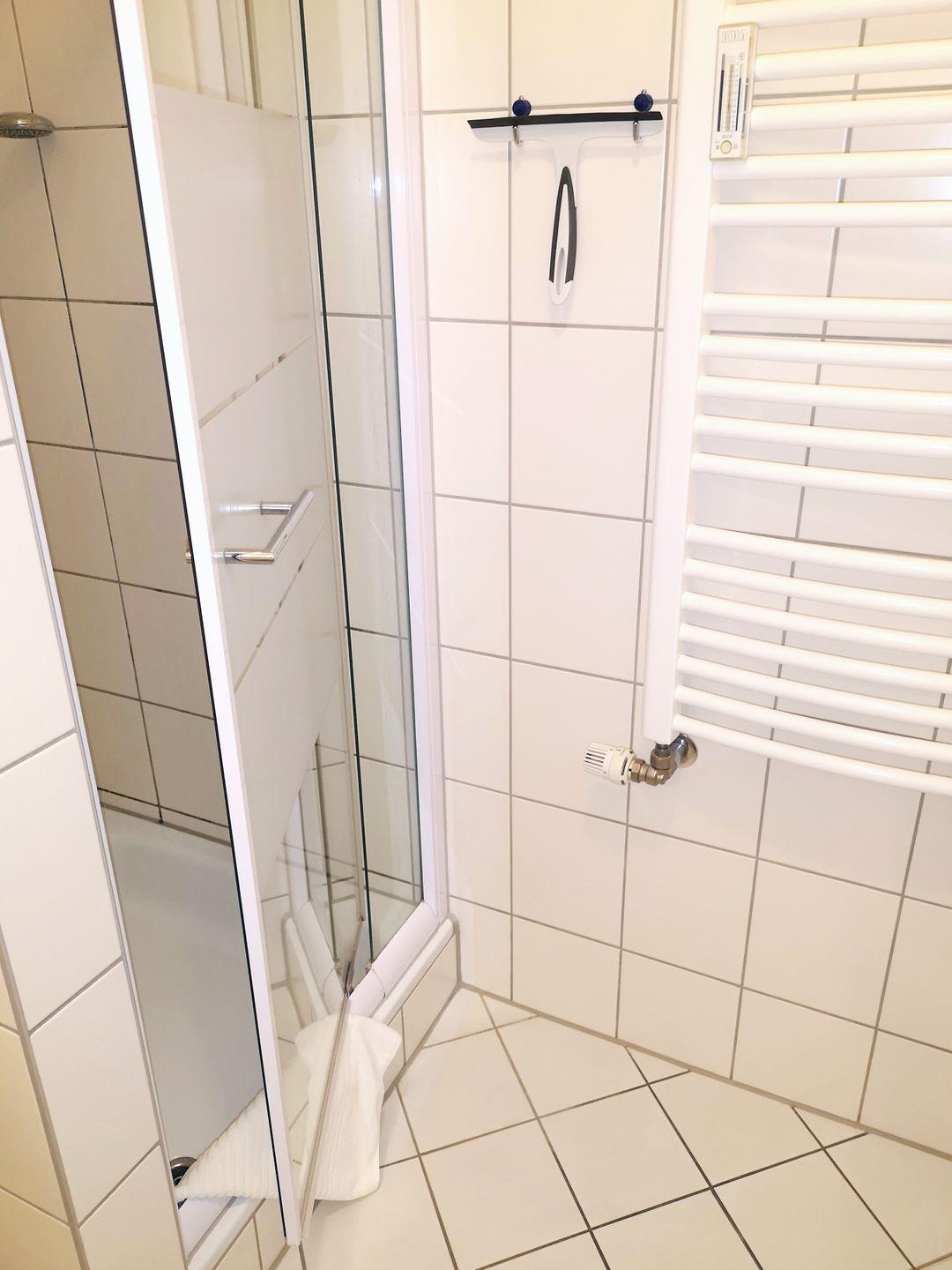 Das Badezimmer verfügt über eine Dusche, Waschbecken und WC, einen Föhn sowie ausreichend Ablagemöglichkeiten.