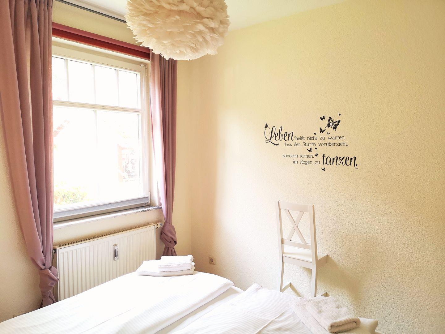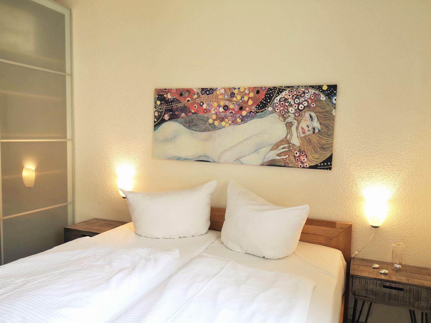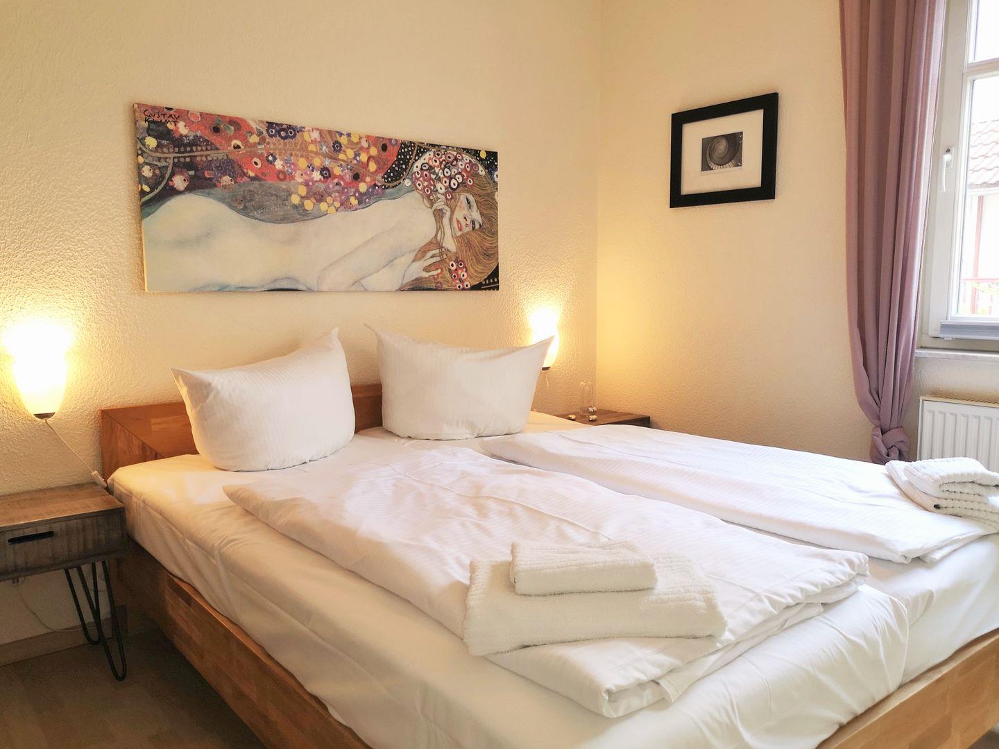 Das moderne und freundliche Schlafzimmer ist mit einem bequemen Doppelbett (1,60 m), Nachttisch, einem geräumigen Kleiderschrank sowie einer Kommode eingerichtet. Für einen erholsamen Schlaf ist das Fenster mit einem Verdunkelungsrollo ausgestattet. Eine zusätzliche bequeme Schlafmöglichkeit für eine weitere 3. bzw. 4. Person bietet die ausziehbare Schlafcouch im Wohnzimmer.