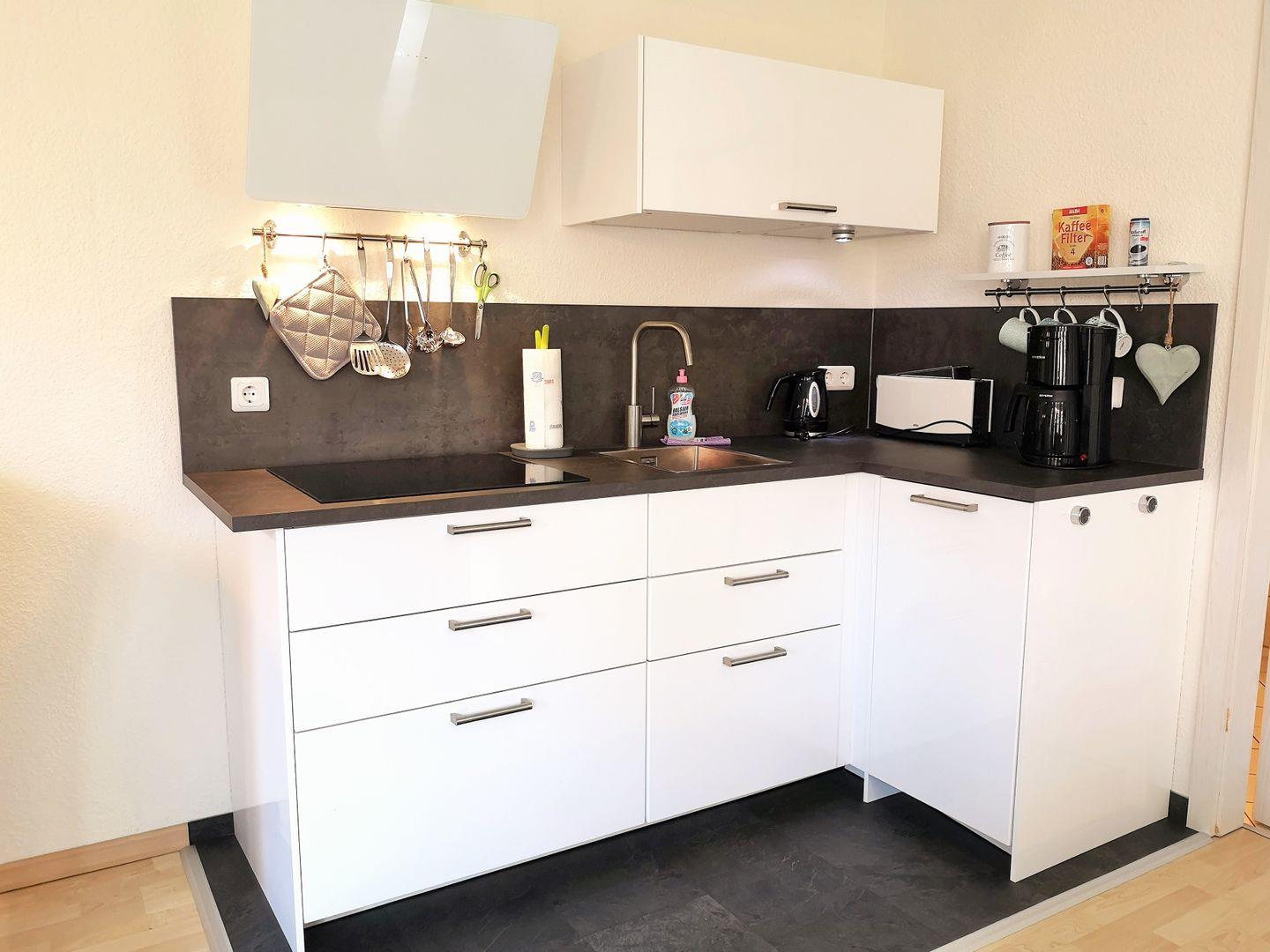 Die offene Küche beinhaltet eine voll ausgestattete Einbauküchenzeile mit 4-Platten-Ceran-Kochfeld, Dunstabzug, Backofen, Kühlschrank mit Gefrierfach, Kaffeemaschine, Wasserkocher und Toaster. Die Küche ist mit Geschirr, Gläsern, Besteck und Töpfen bestens und ausreichend ausgestattet.