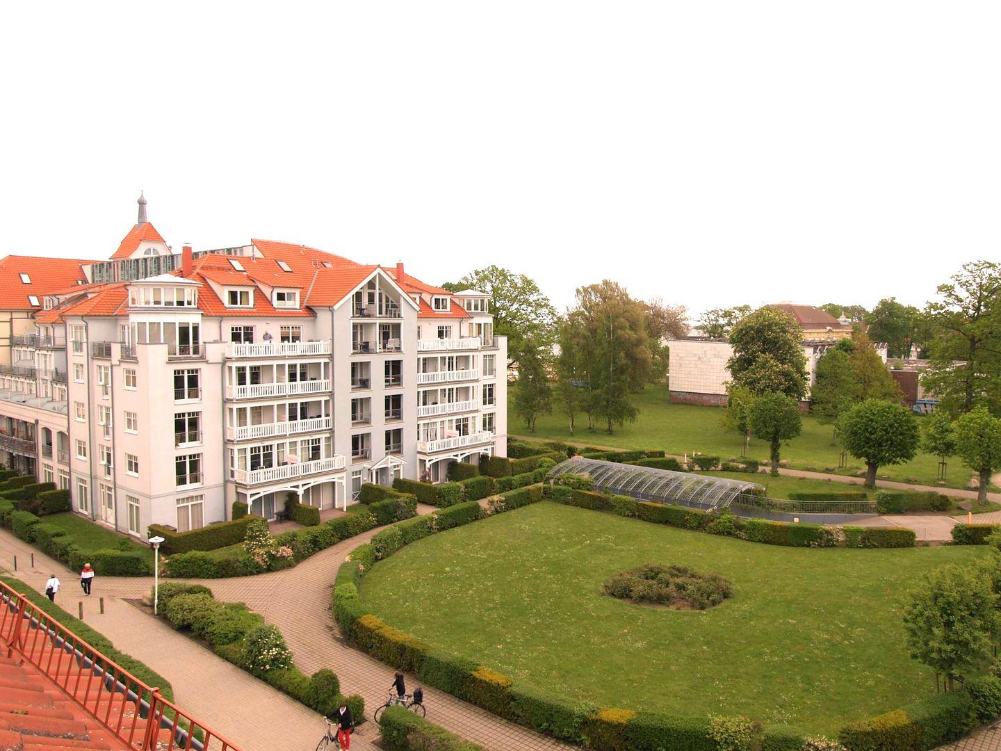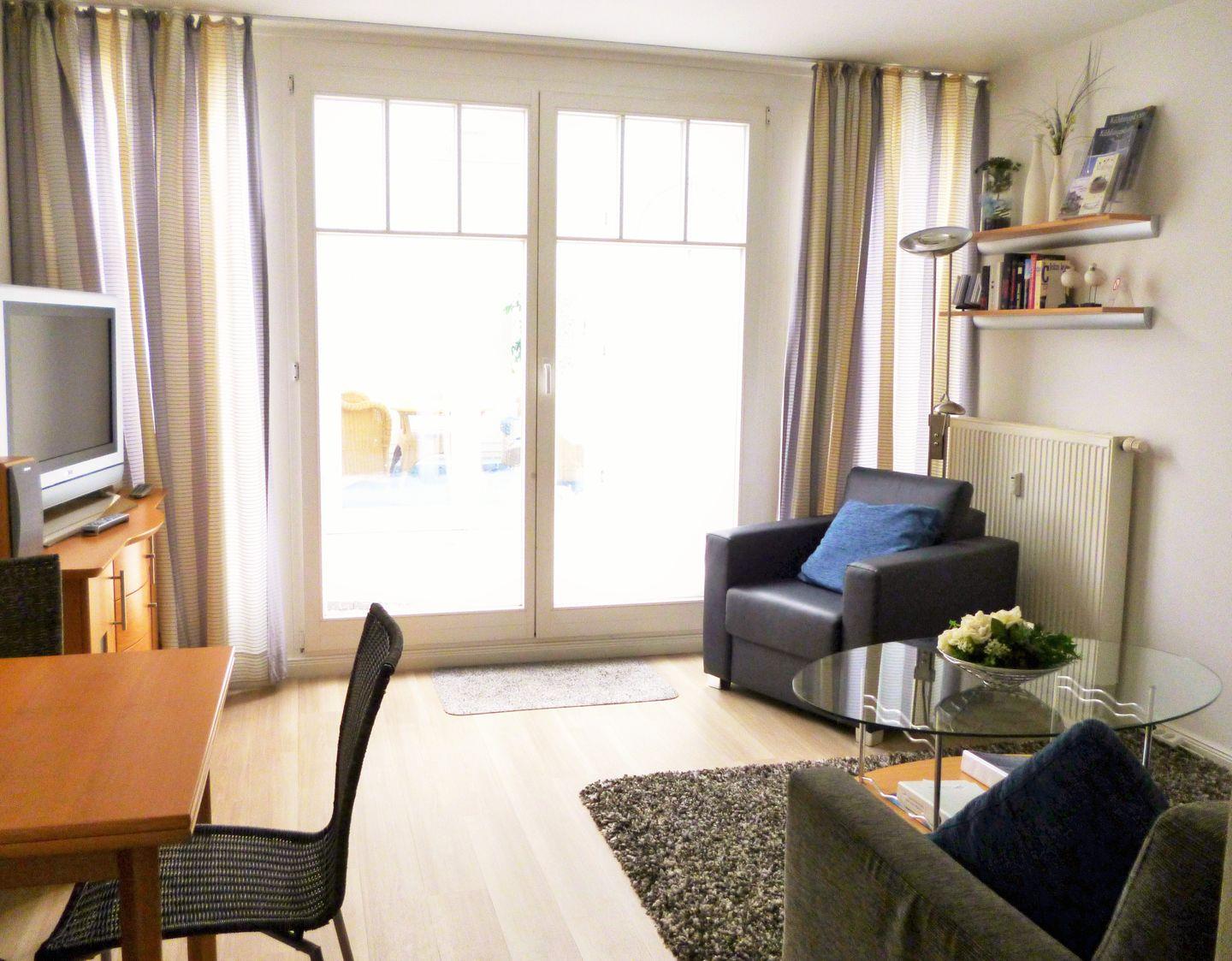 Das freundliche und moderne Wohn-/Esszimmer verfügt über eine separate Sitzgruppe mit bequemer (Schlaf-)Couch, Sessel und Couchtisch, einen separaten Esstisch mit 3 Stühlen sowie ein Sideboard. Vom Wohnzimmer aus haben Sie direkten Zugang zu dem ca. 8 m² großen Balkon (nach Osten ausgerichtet). Von hier gelangen Sie zum dem beheizten Pavillon (ca. 16 m²) mit einem traumhaften Blick auf die Ostsee und den direkt gegenüber liegenden Baltic-Park. Hier sitzen Sie auf der bequemen Korbmöbel-Sitzgruppe entspannt und gemütlich mitten im Grünen und können abends bei einem guten Glas Wein in Ruhe die lauen Sommernächte genießen!