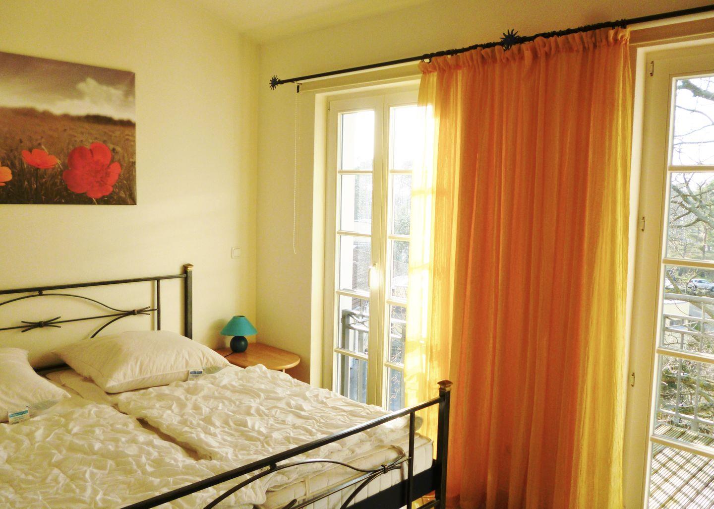 Das freundliche Schlafzimmer ist mit einem bequemen Doppelbett, Nachttischen sowie einem geräumigen Kleiderschrank eingerichtet und bietet ebenfalls Zugang zum Balkon.