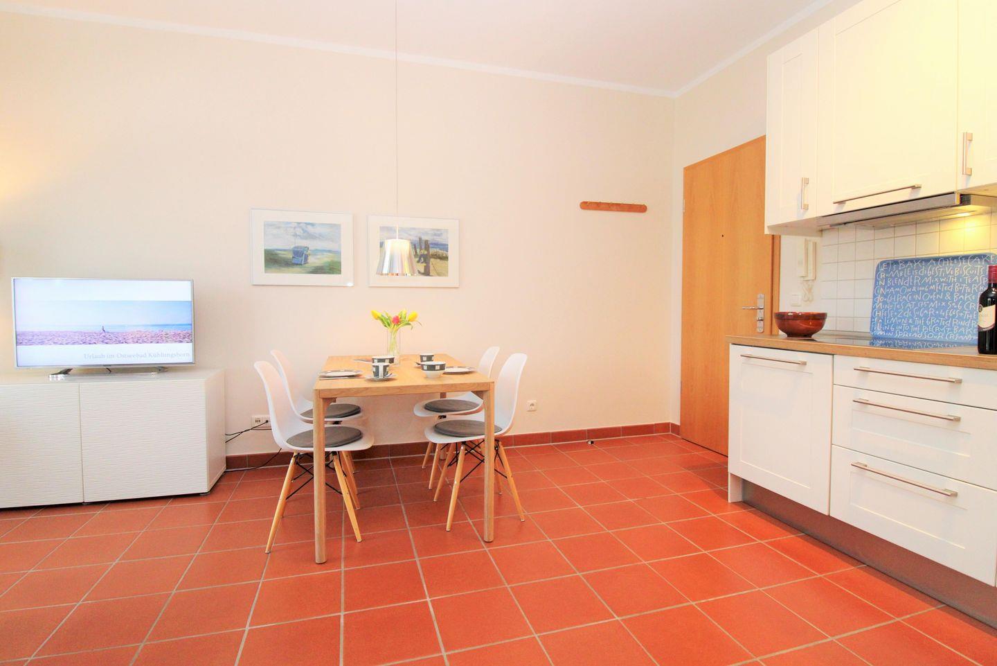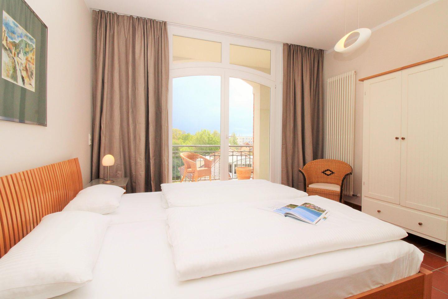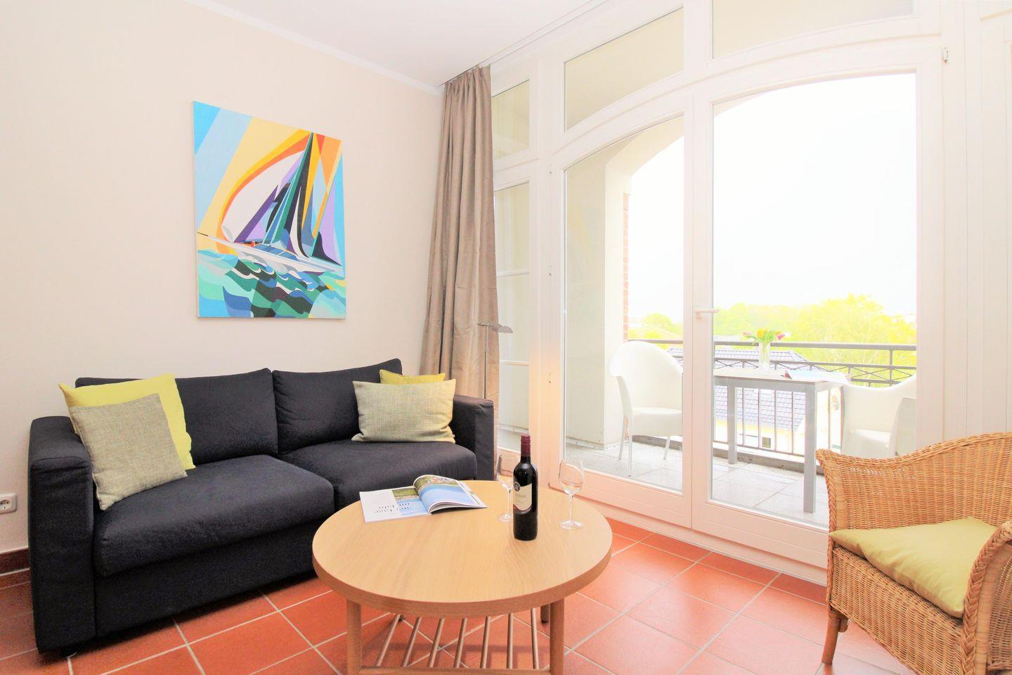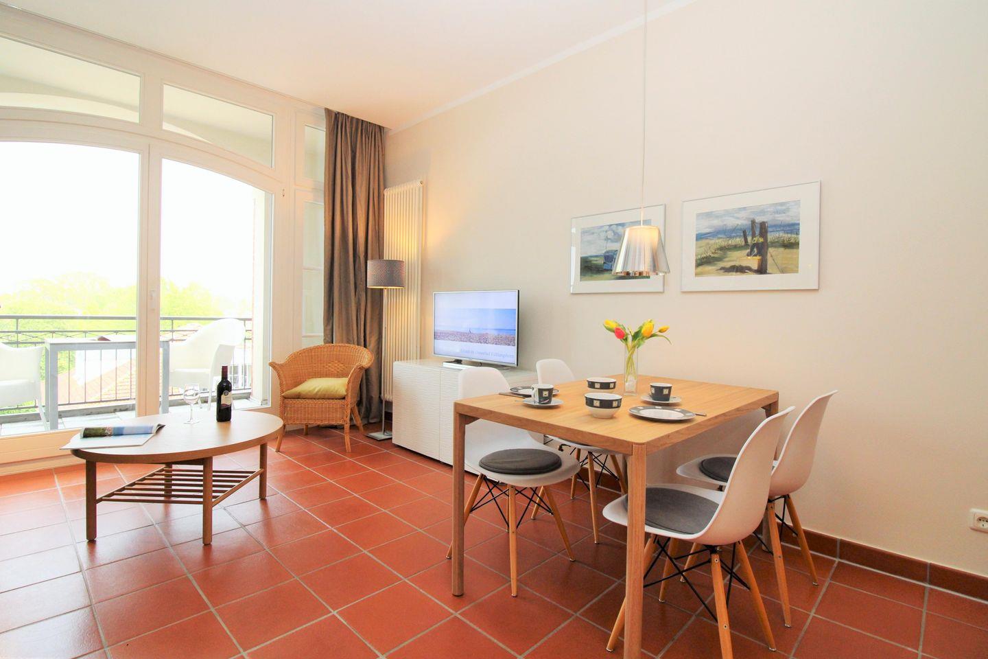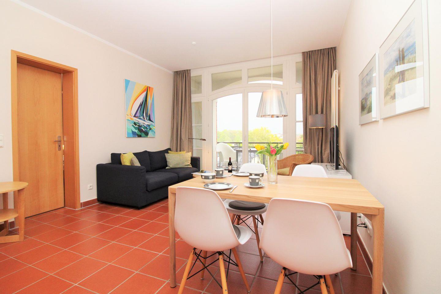 Das moderne und sehr geräumige Wohn-/Esszimmer verfügt über eine separate Sitzgruppe mit bequemer Couch, 2 Sesseln und Couchtisch, einen separaten Esstisch mit 4 Stühlen sowie 2 Sideboards. Vom Wohnzimmer aus haben Sie direkten Zugang zu der großen und sonnigen Loggia (nach Süd-Osten ausgerichtet) mit herrlichem Blick auf die nahe Ostsee. Hier sitzen Sie entspannt beim Frühstück oder können abends bei einem guten Glas Wein die lauen Sommernächte genießen …!