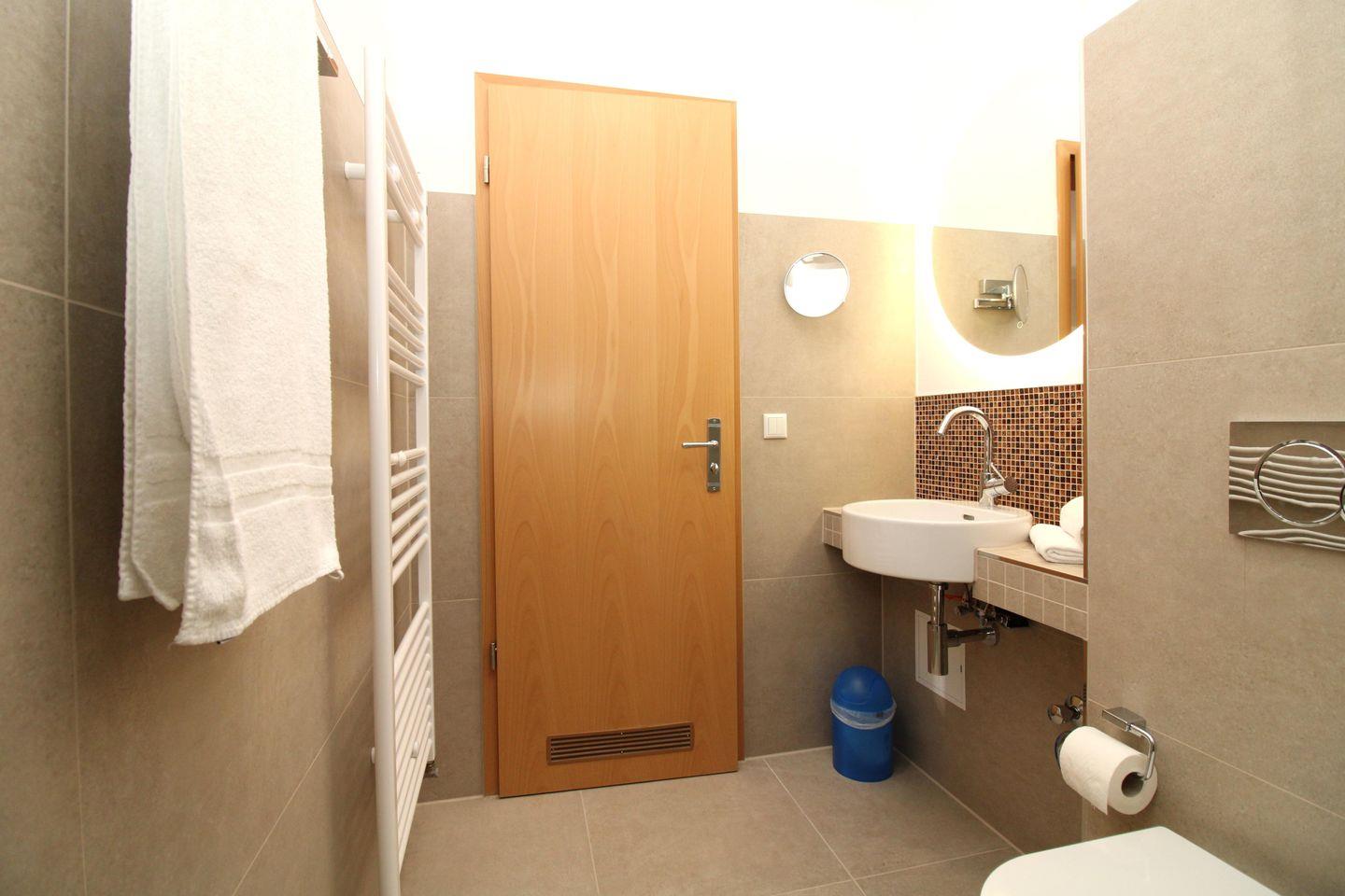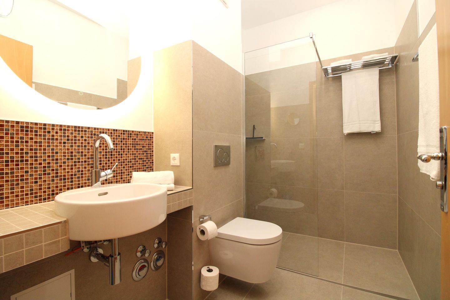 Das helle und moderne Badezimmer verfügt über eine bodentiefe Dusche mit Echtglas-Duschabtrennung, Waschbecken, Kosmetikspiegel, WC, Handtuch-Heizkörper sowie ausreichend Ablagemöglichkeiten.
