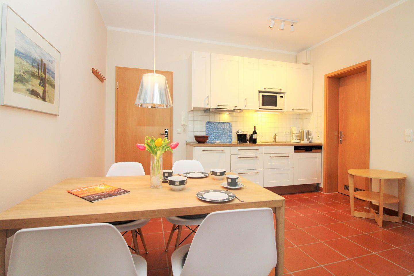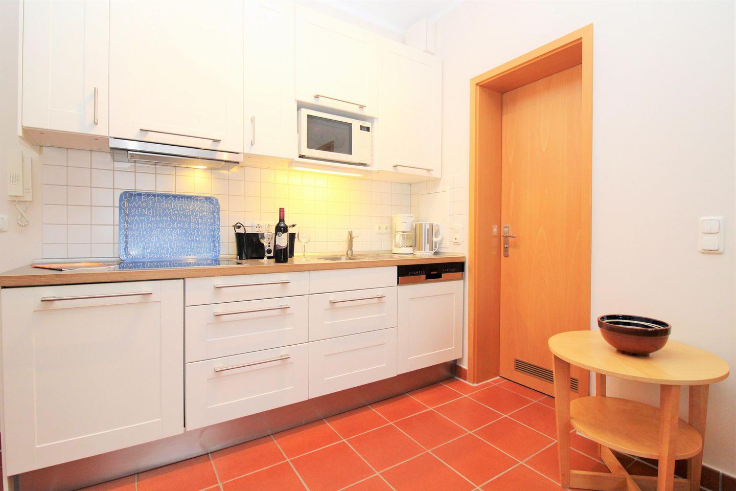 Die offene Küche beinhaltet eine voll ausgestattete Einbauküchenzeile mit 4-Platten-Ceran-Kochfeld, Mikrowelle, Dunstabzugshaube, Kühlschrank, Geschirrspülmaschine, Kaffeemaschine, Wasserkocher und Toaster. Die Küche ist mit Geschirr, Gläsern, Besteck und Töpfen bestens und ausreichend ausgestattet.
