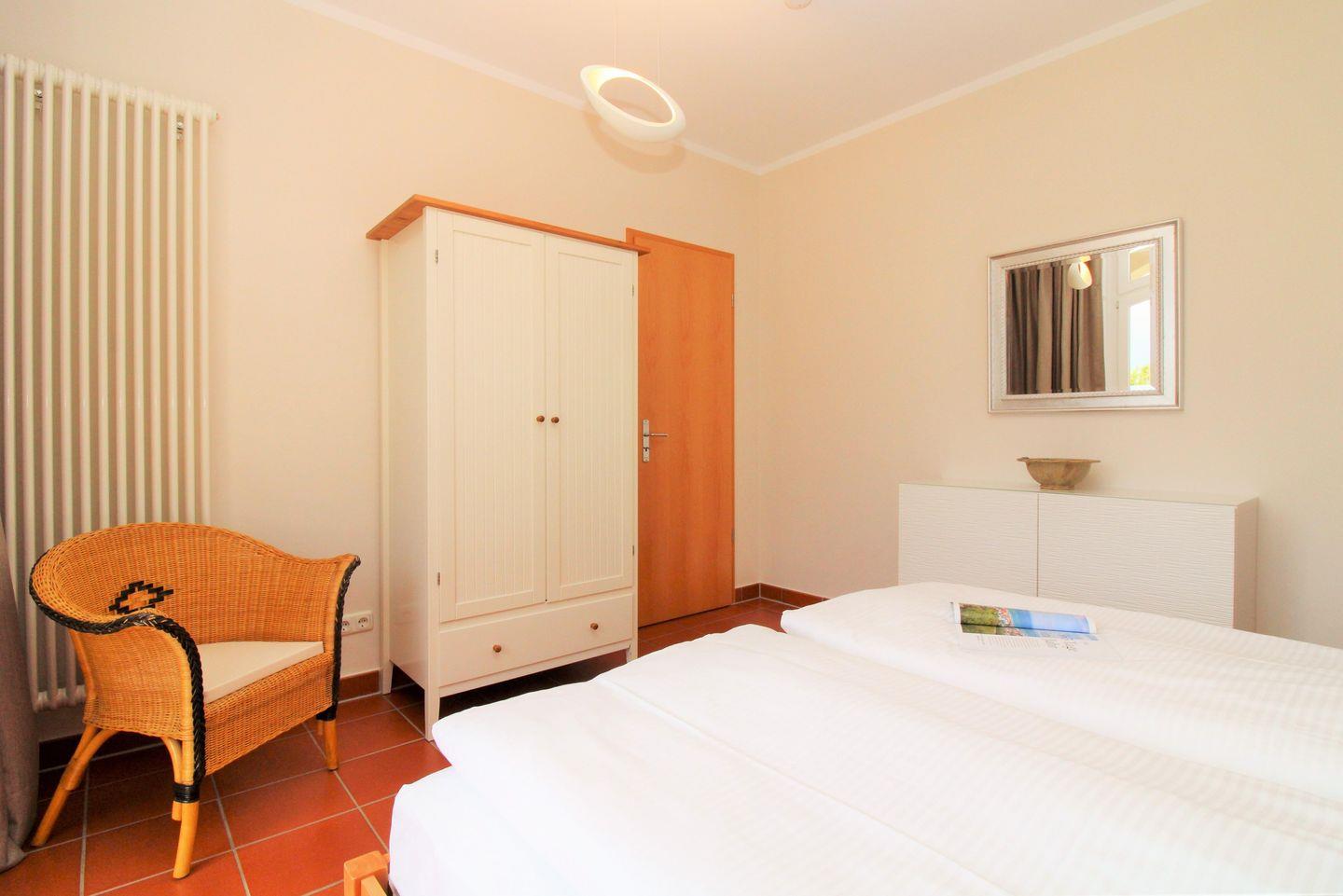 Das großzügige und helle Schlafzimmer ist mit einem bequemen Doppelbett, Nachttischen, einer Kommode sowie einem geräumigen Kleiderschrank eingerichtet. Von hier aus haben Sie ebenfalls Zugang zur Loggia. Eine zusätzliche bequeme Schlafmöglichkeit für eine weitere 3. Person bietet die ausziehbare Schlafcouch im Wohnzimmer.