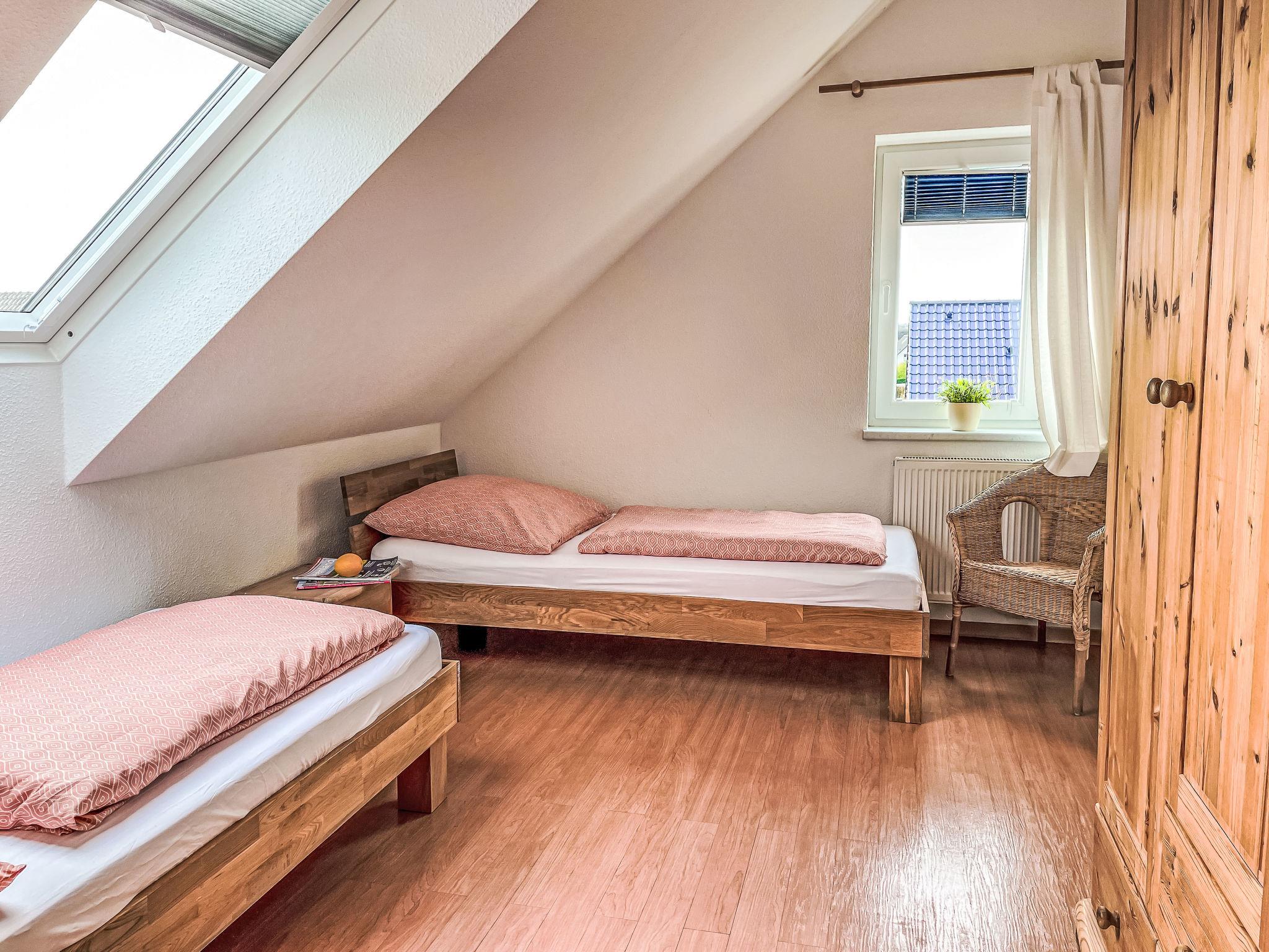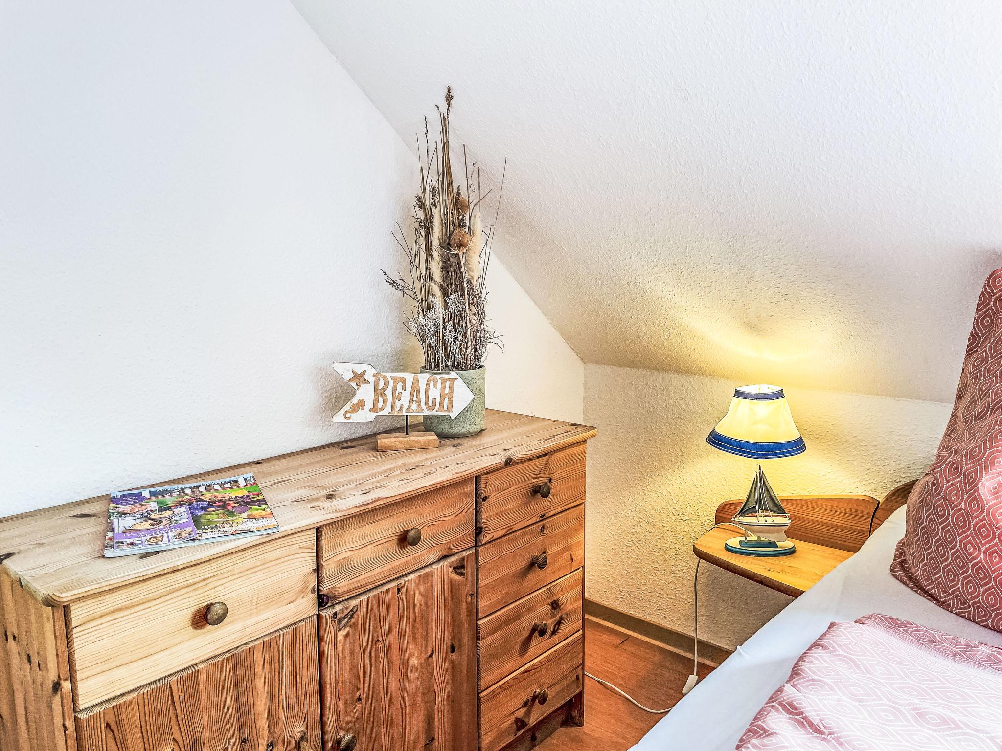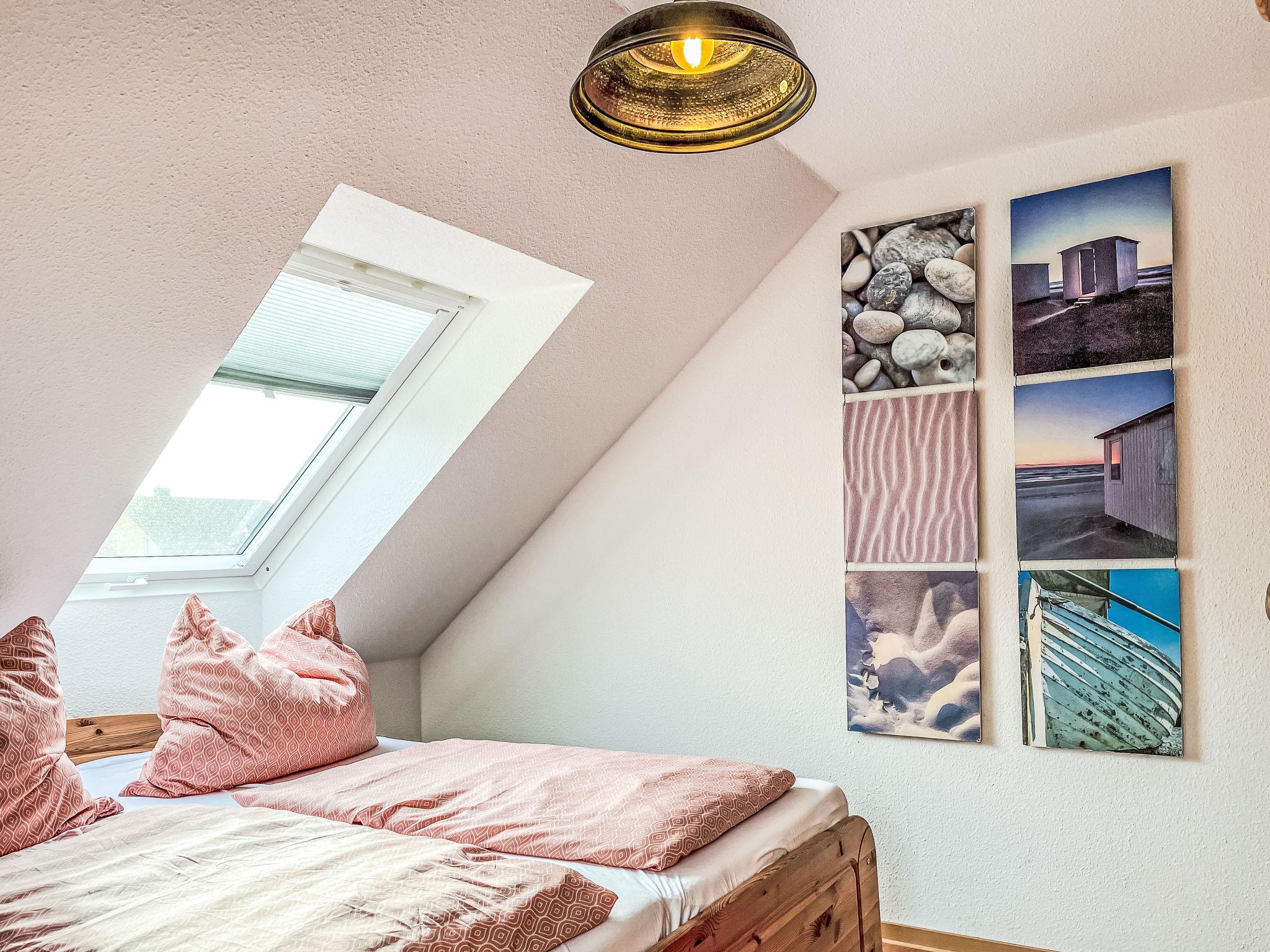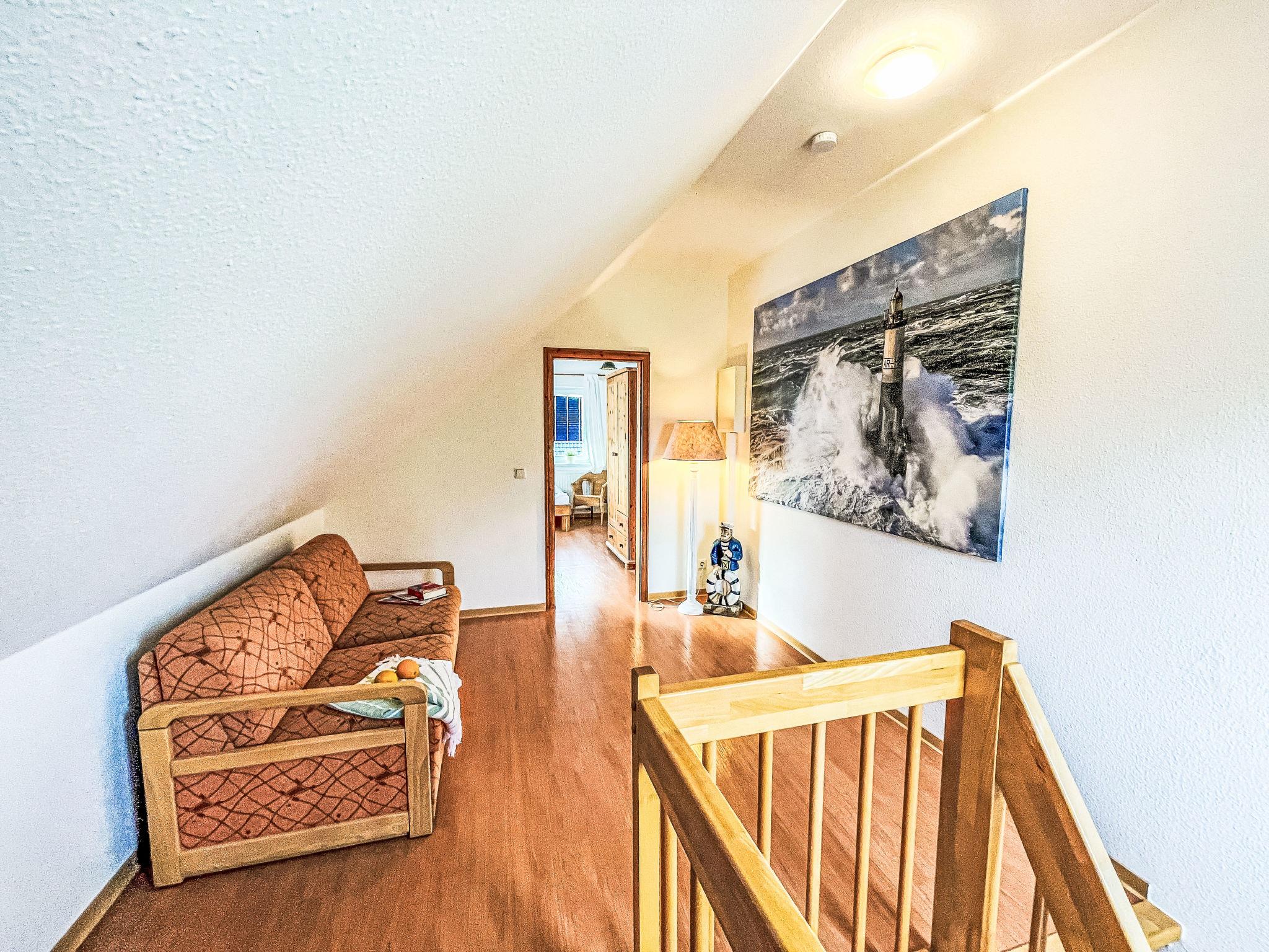 "Möwenblick", 3-room apartment 69 m2 on 2 levels. Bright, partly with sloping ceilings, beautiful and cosy furnishings: upper floor: living/dining room with dining nook and satellite TV (flat screen), radio. 1 room with 1 double bed (180 cm, length 200 cm). Open kitchen (dishwasher, 4 ceramic glass hob hotplates, toaster, kettle, electric coffee machine). Shower/WC. Top floor: open walk-through room with 1 double sofabed (140 cm, length 200 cm). 1 room with 1 double bed (180 cm, length 200 cm). Gas heating. Patio. Terrace furniture. Facilities: Internet (WiFi, free). Parking (1 car) at the house. Please note: non-smokers only. Smoke alarm.