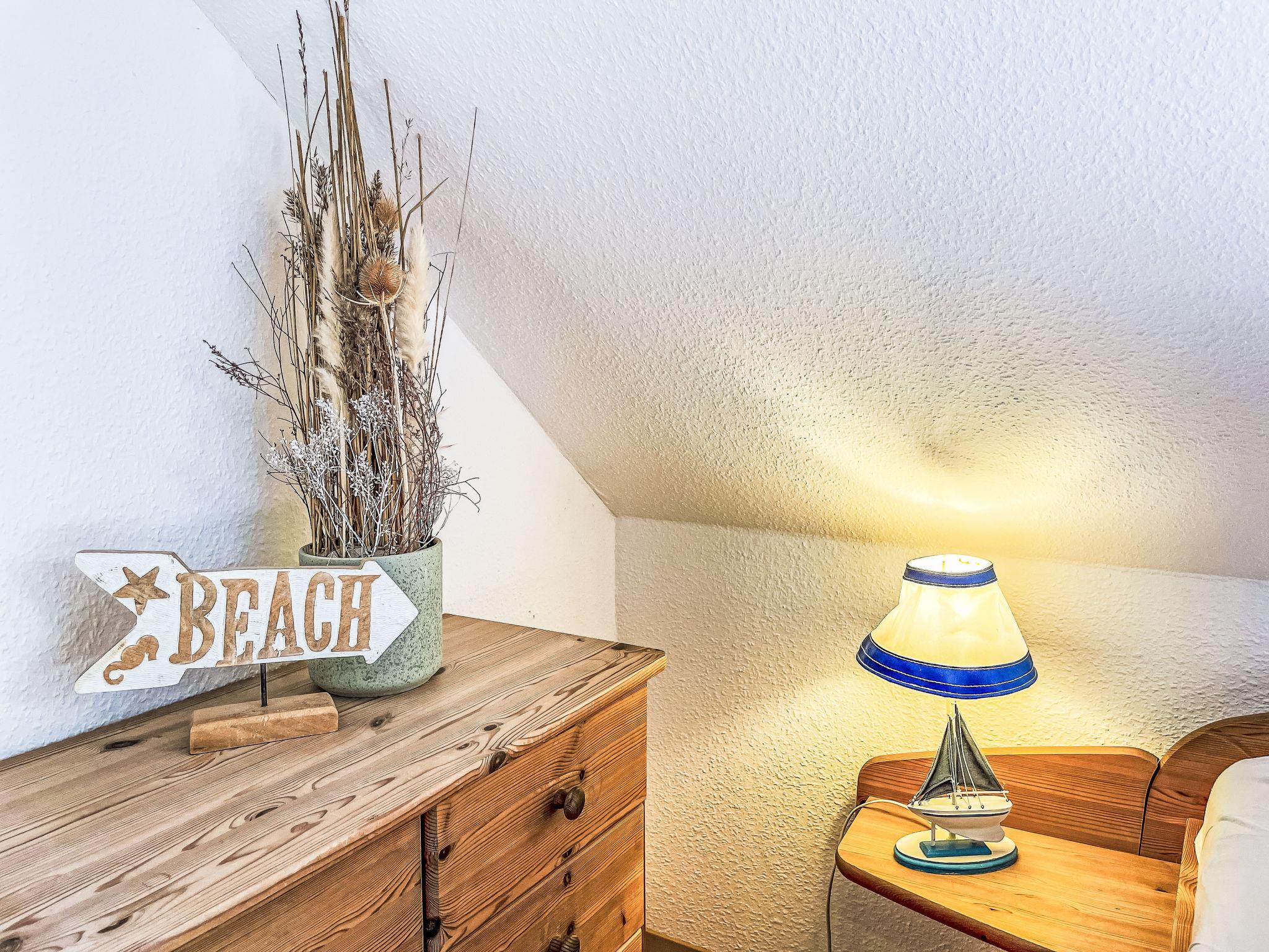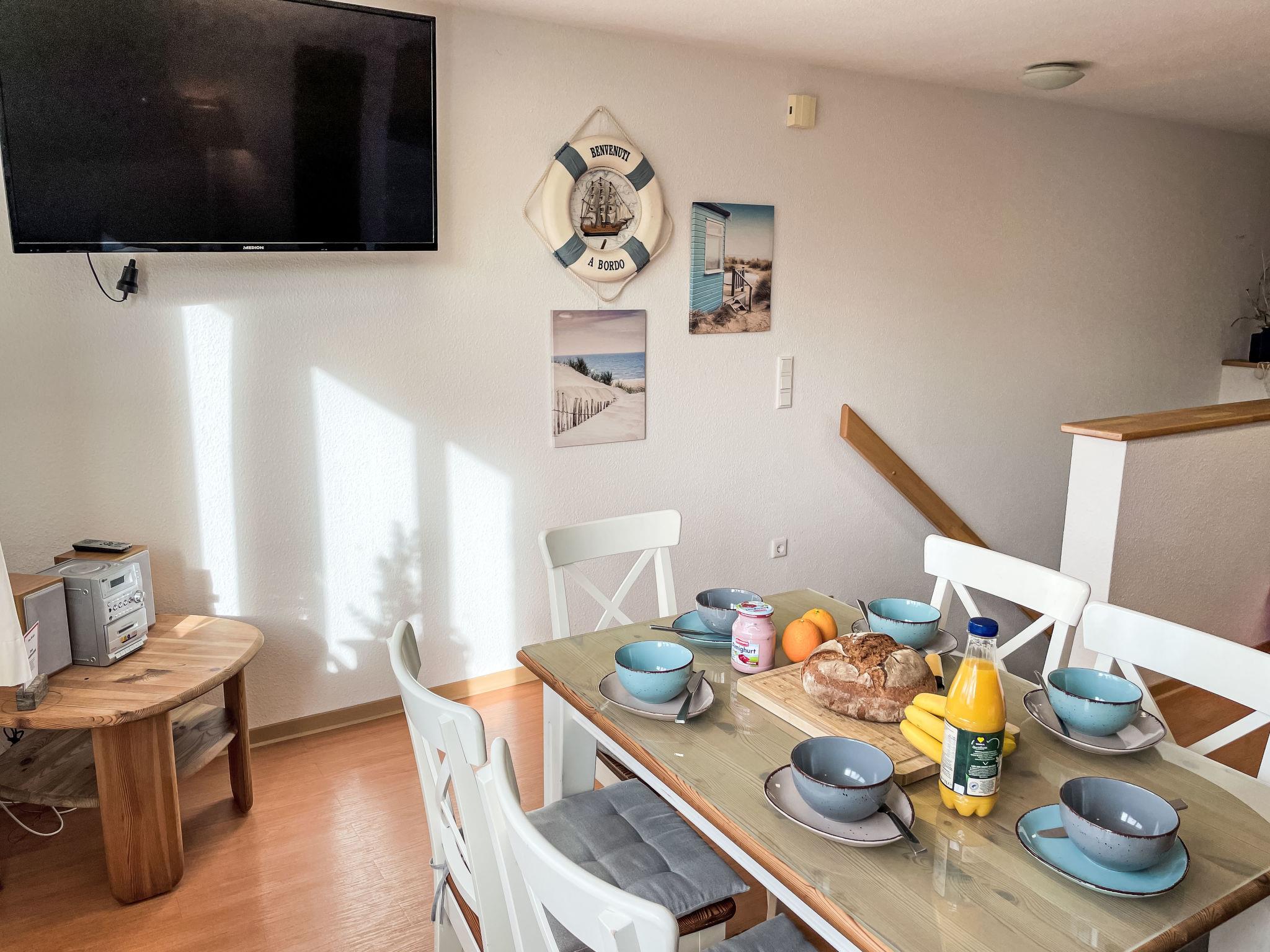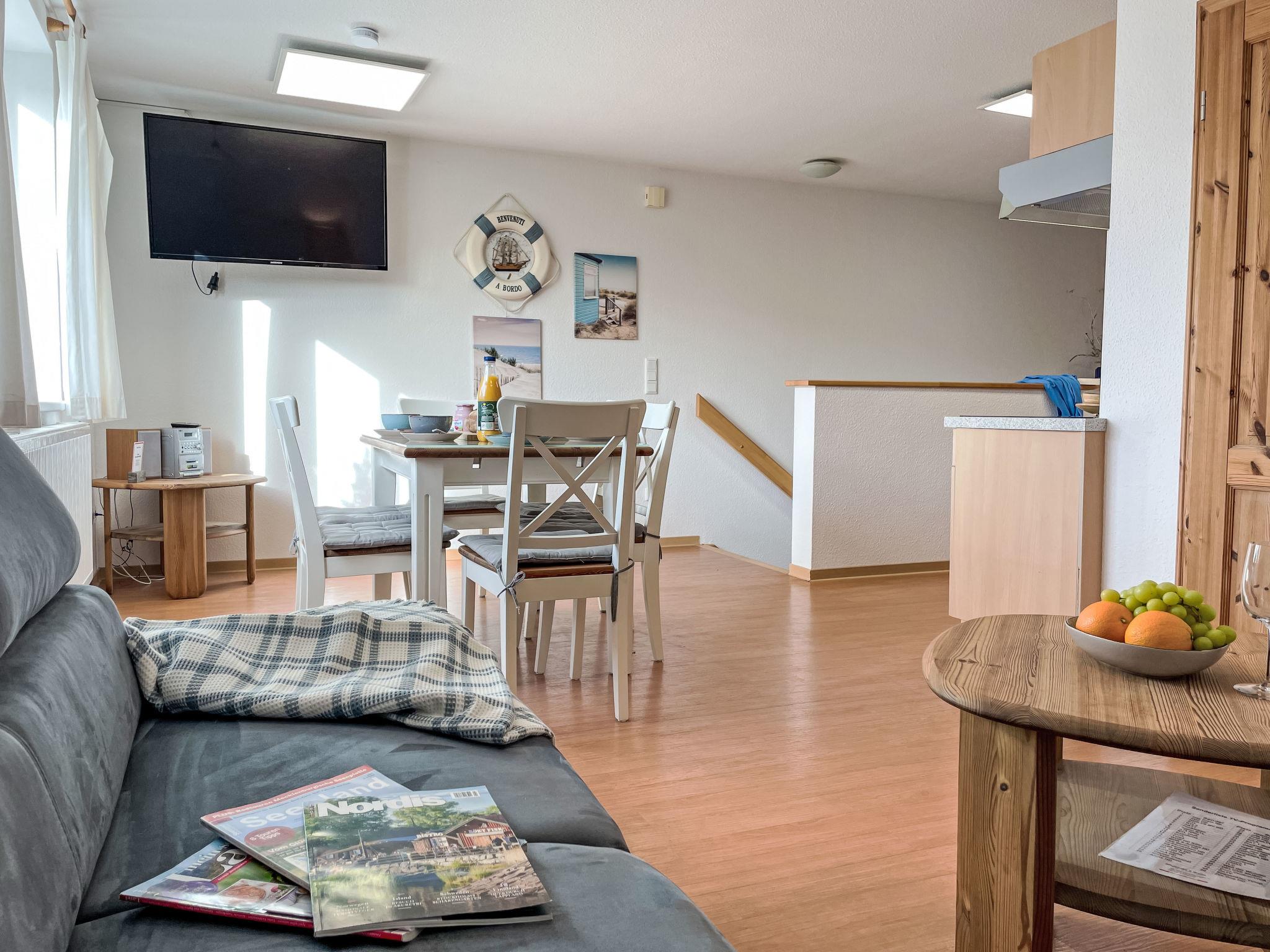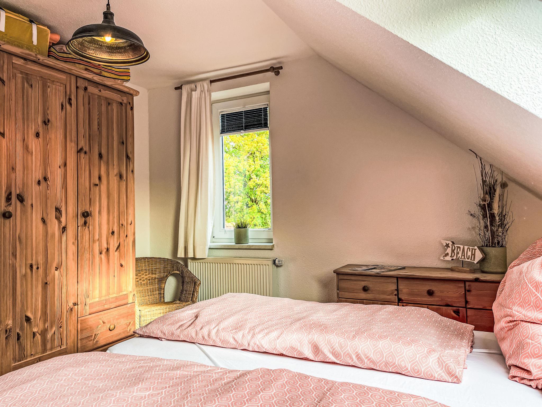 "Möwenblick", 3-room apartment 69 m2 on 2 levels. Bright, partly with sloping ceilings, beautiful and cosy furnishings: upper floor: living/dining room with dining nook and satellite TV (flat screen), radio. 1 room with 1 double bed (180 cm, length 200 cm). Open kitchen (dishwasher, 4 ceramic glass hob hotplates, toaster, kettle, electric coffee machine). Shower/WC. Top floor: open walk-through room with 1 double sofabed (140 cm, length 200 cm). 1 room with 1 double bed (180 cm, length 200 cm). Gas heating. Patio. Terrace furniture. Facilities: Internet (WiFi, free). Parking (1 car) at the house. Please note: non-smokers only. Smoke alarm.
