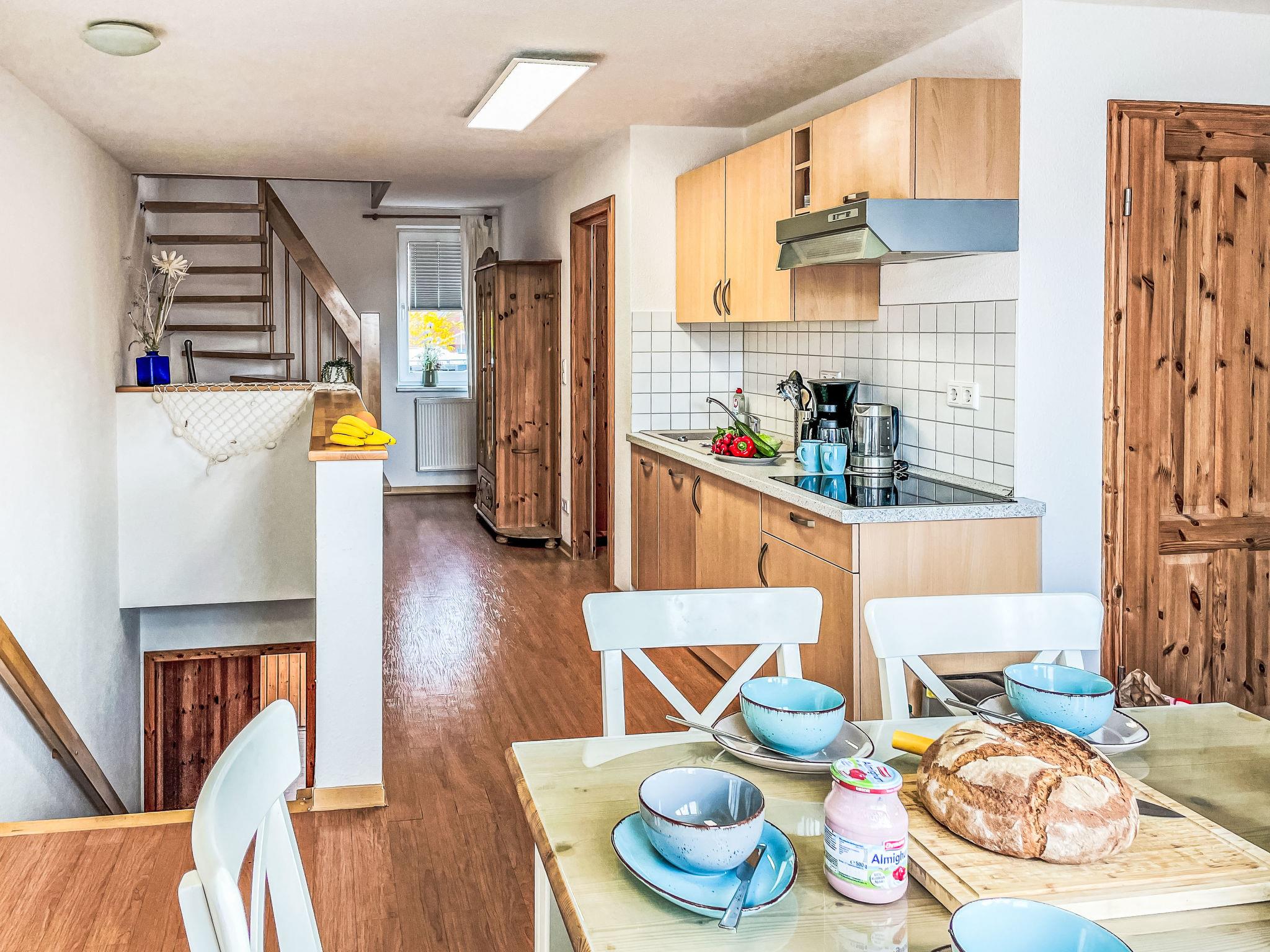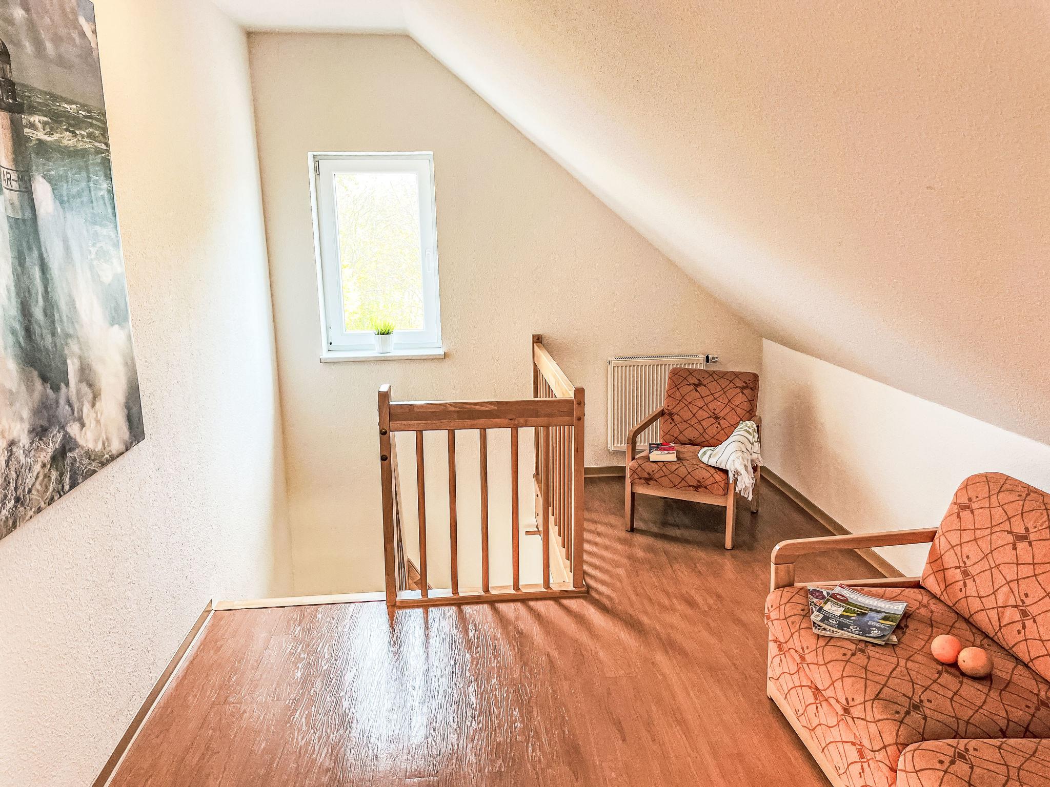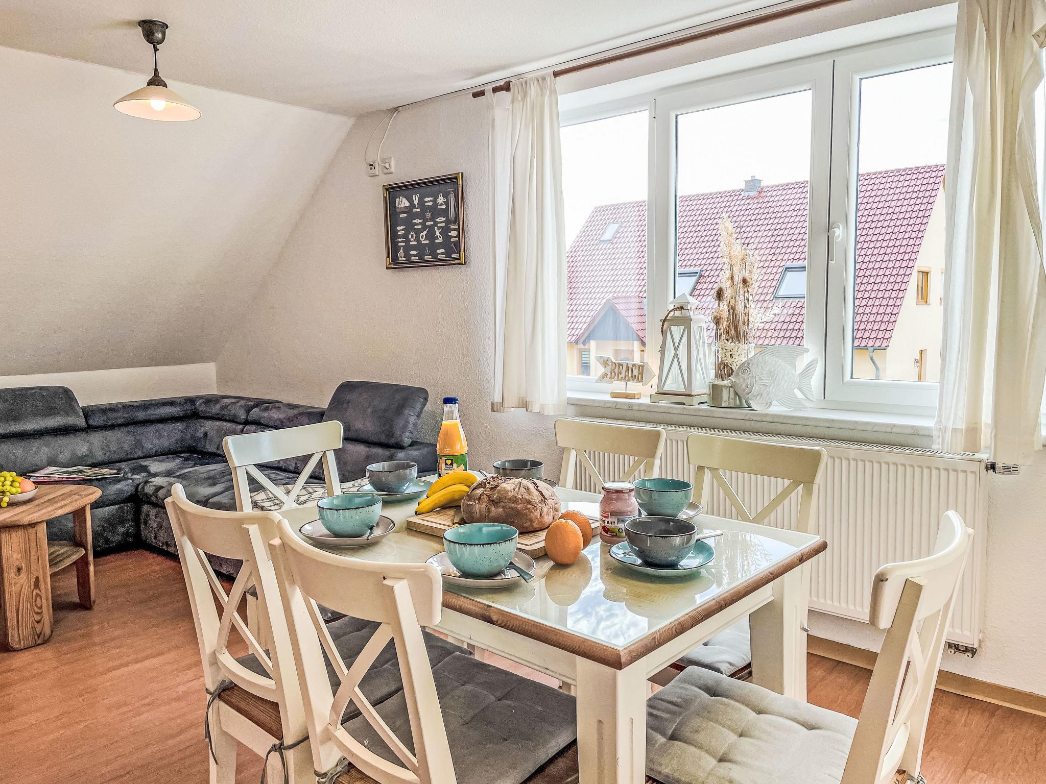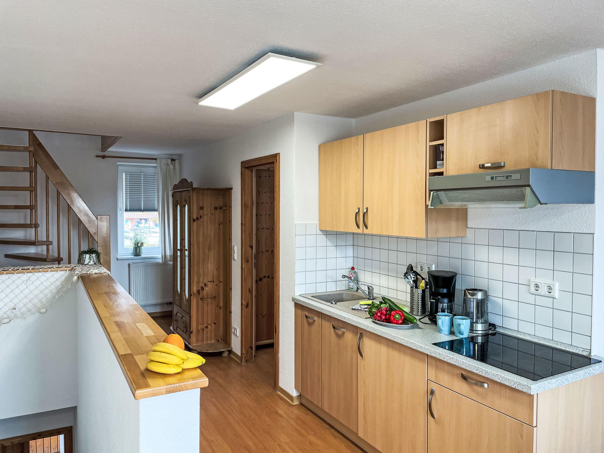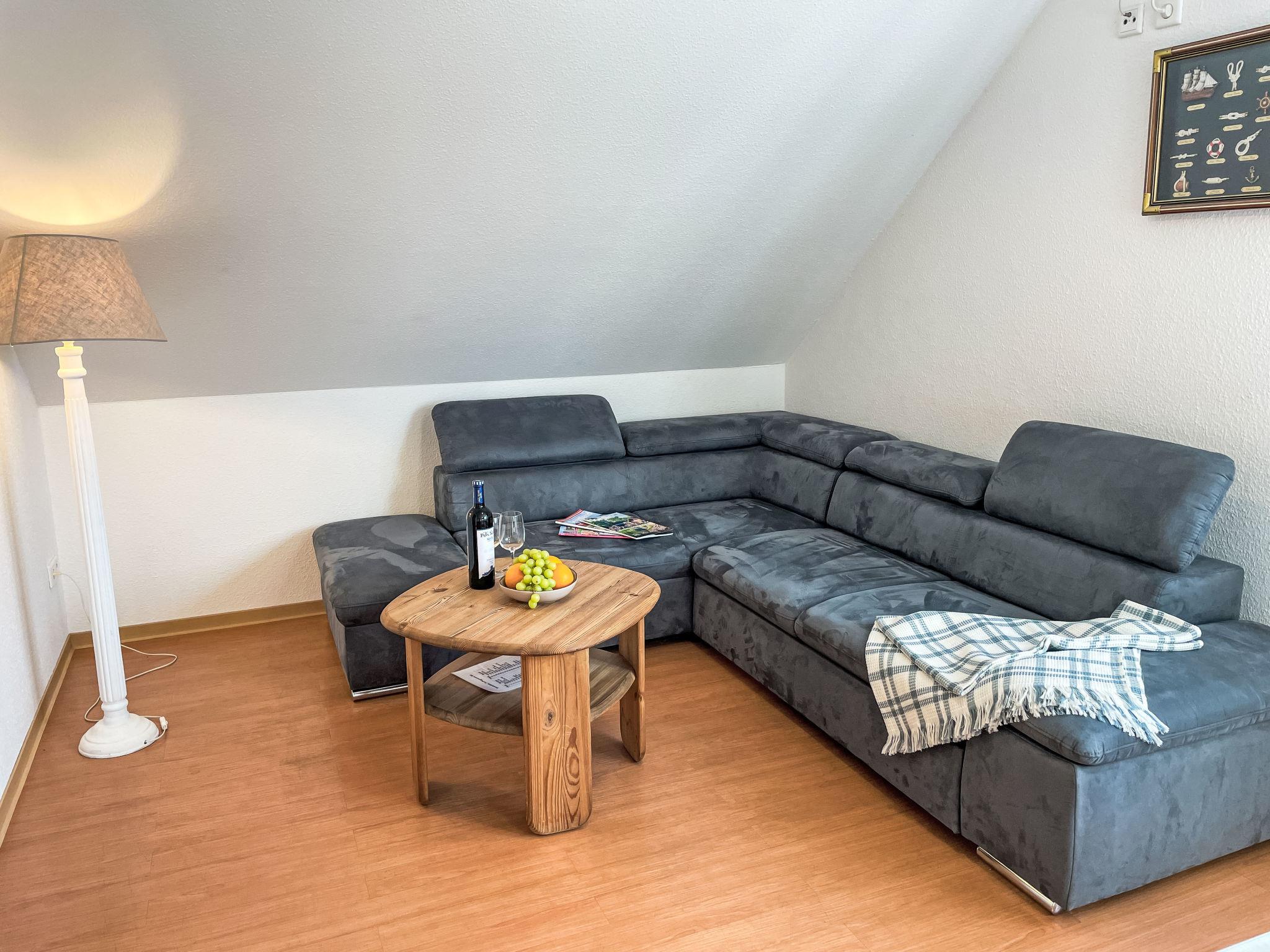"Möwenblick", 3-room apartment 69 m2 on 2 levels. Bright, partly with sloping ceilings, beautiful and cosy furnishings: upper floor: living/dining room with dining nook and satellite TV (flat screen), radio. 1 room with 1 double bed (180 cm, length 200 cm). Open kitchen (dishwasher, 4 ceramic glass hob hotplates, toaster, kettle, electric coffee machine). Shower/WC. Top floor: open walk-through room with 1 double sofabed (140 cm, length 200 cm). 1 room with 1 double bed (180 cm, length 200 cm). Gas heating. Patio. Terrace furniture. Facilities: Internet (WiFi, free). Parking (1 car) at the house. Please note: non-smokers only. Smoke alarm.
