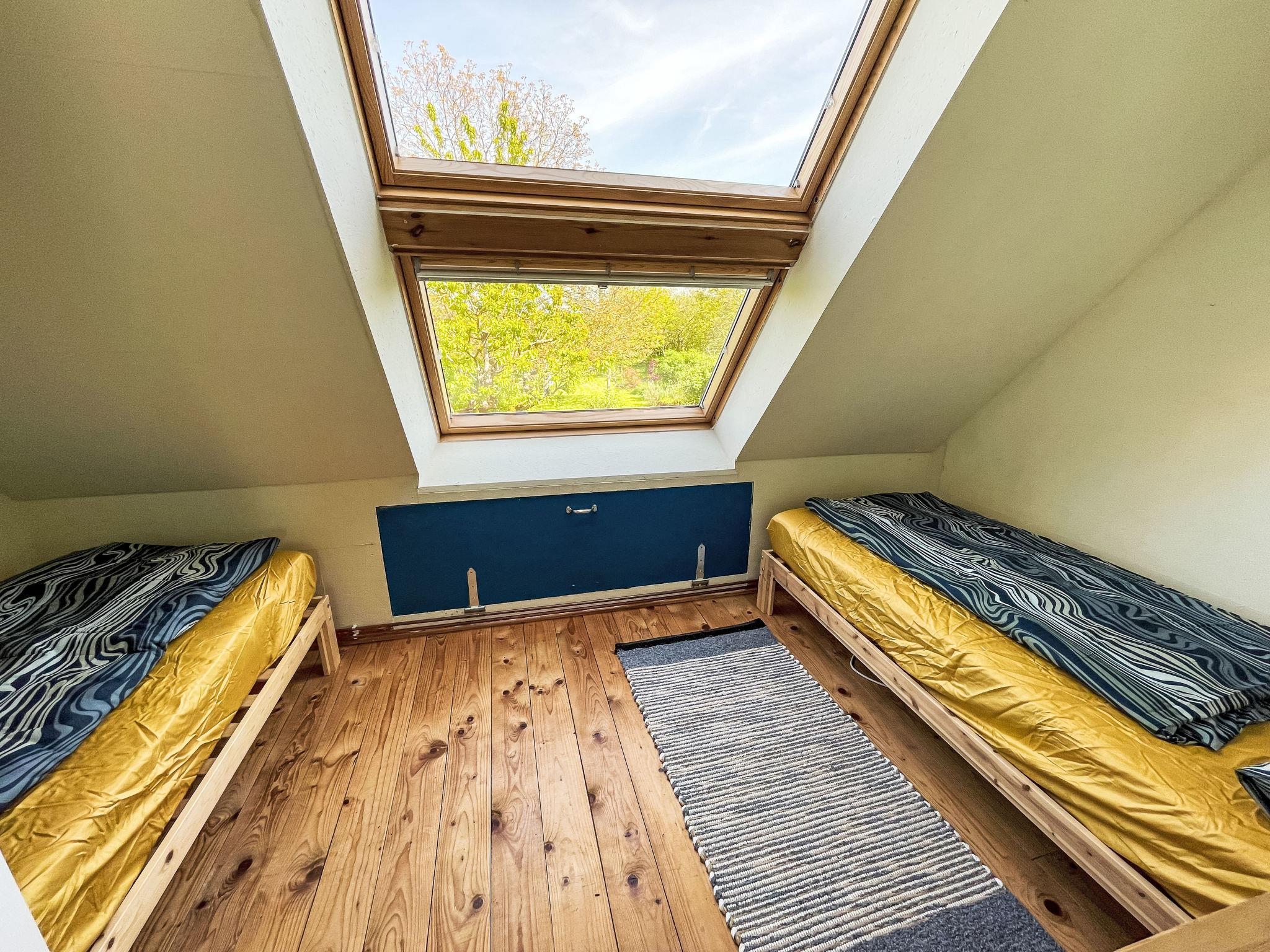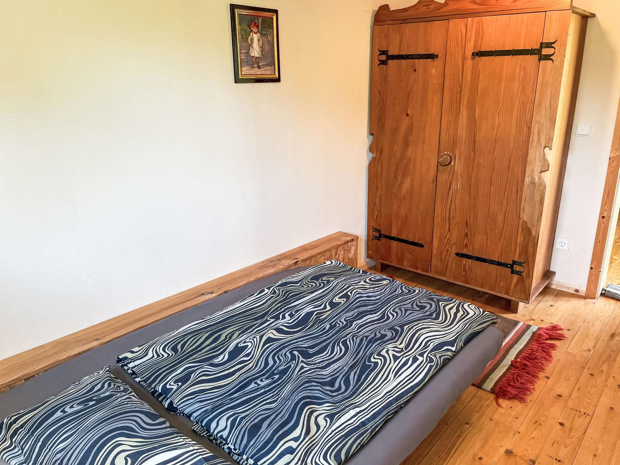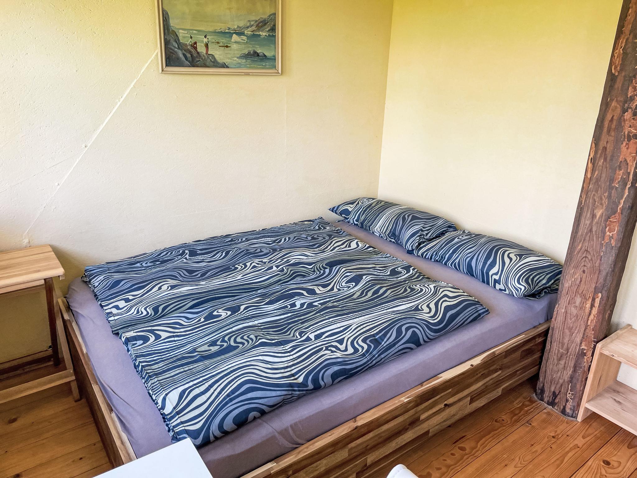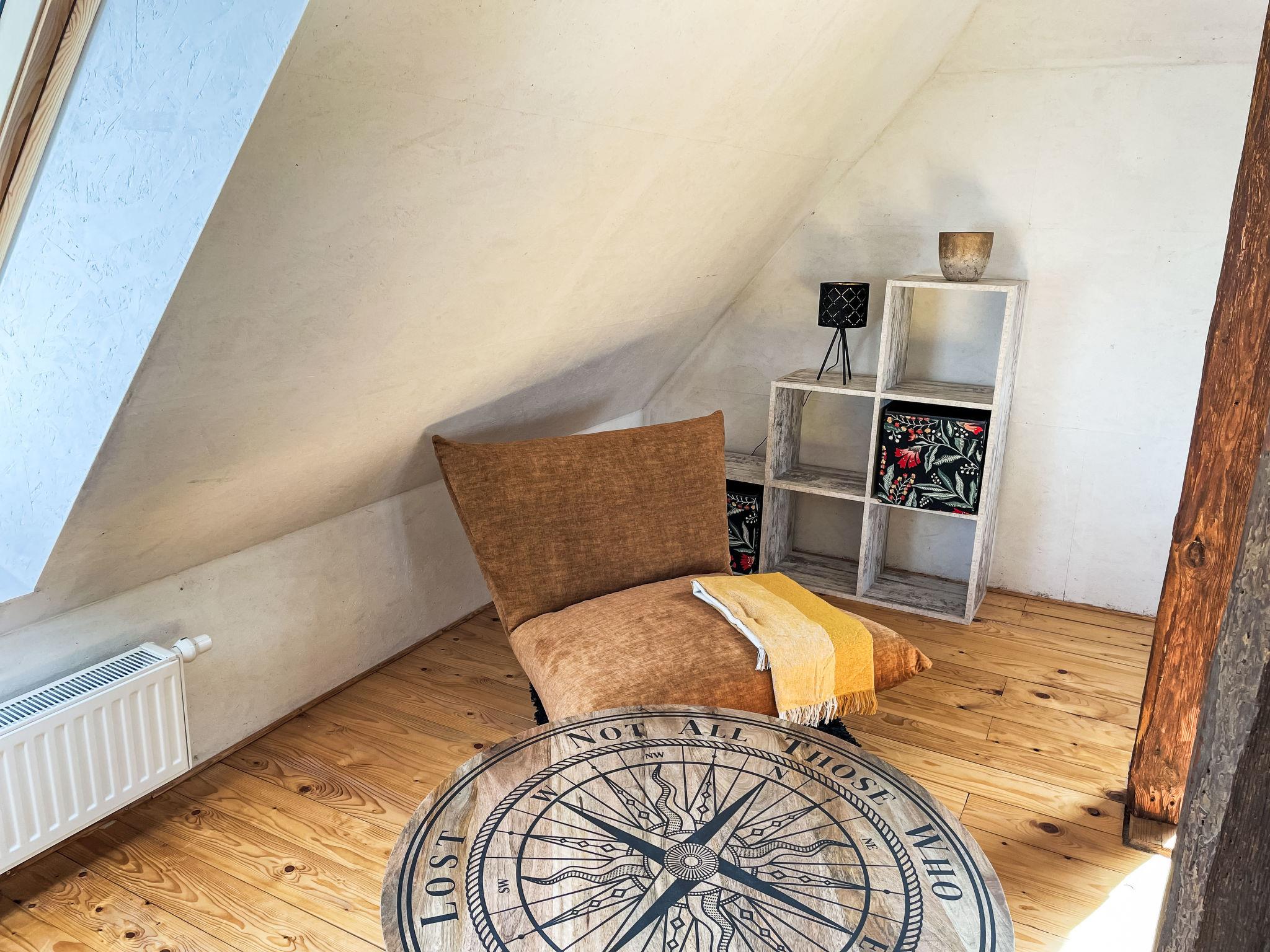 9-room cottage 120 m2 on 3 levels. Spacious, partly with sloping ceilings, rustic and wooden furniture furnishings: large living/dining room with open-hearth fireplace (only for decoration). Exit to the garden, to the terrace. 1 room with 1 sofabed (120 cm, length 190 cm). Playroom. Open kitchen (oven, dishwasher, freezer, pizza oven) with dining table. Shower/WC. Upper floor: 1 room with sloping ceilings with panoramic window with 1 bed (90 cm, length 200 cm), 1 double bed (140 cm, length 200 cm). 1 room with sloping ceilings with panoramic window with 2 beds (90 cm, length 200 cm). (steep stair) gallery with TV. Bath/shower/WC. 2nd upper floor: (ladder), 1 room with sloping ceilings, ceiling height 75 - 180 cm with 1 double bed (180 cm, length 200 cm). (ladder), 1 room with sloping ceilings, ceiling height 75 - 180 cm with 2 beds (80 cm, length 200 cm). Large terrace 30 m2. Terrace furniture, barbecue, deck chairs (2). Very beautiful view of the garden. Facilities: washing machine, dryer, children's high chair, hair dryer, logs (extra), baby changing unit. Internet (WiFi, free). Please note: suitable for families. Non-smoking house. Smoke alarm, fire extinguisher.