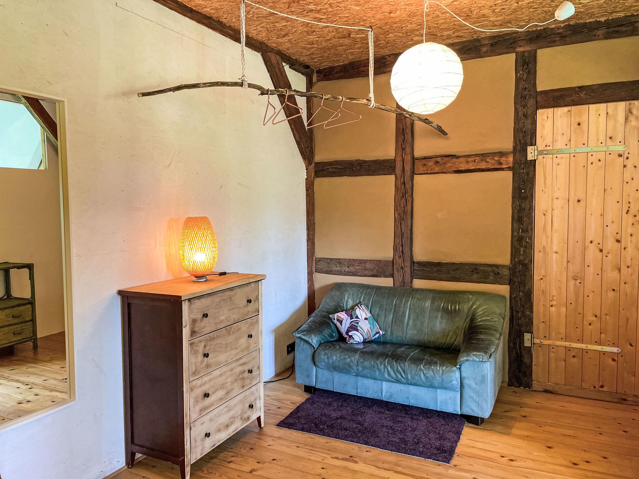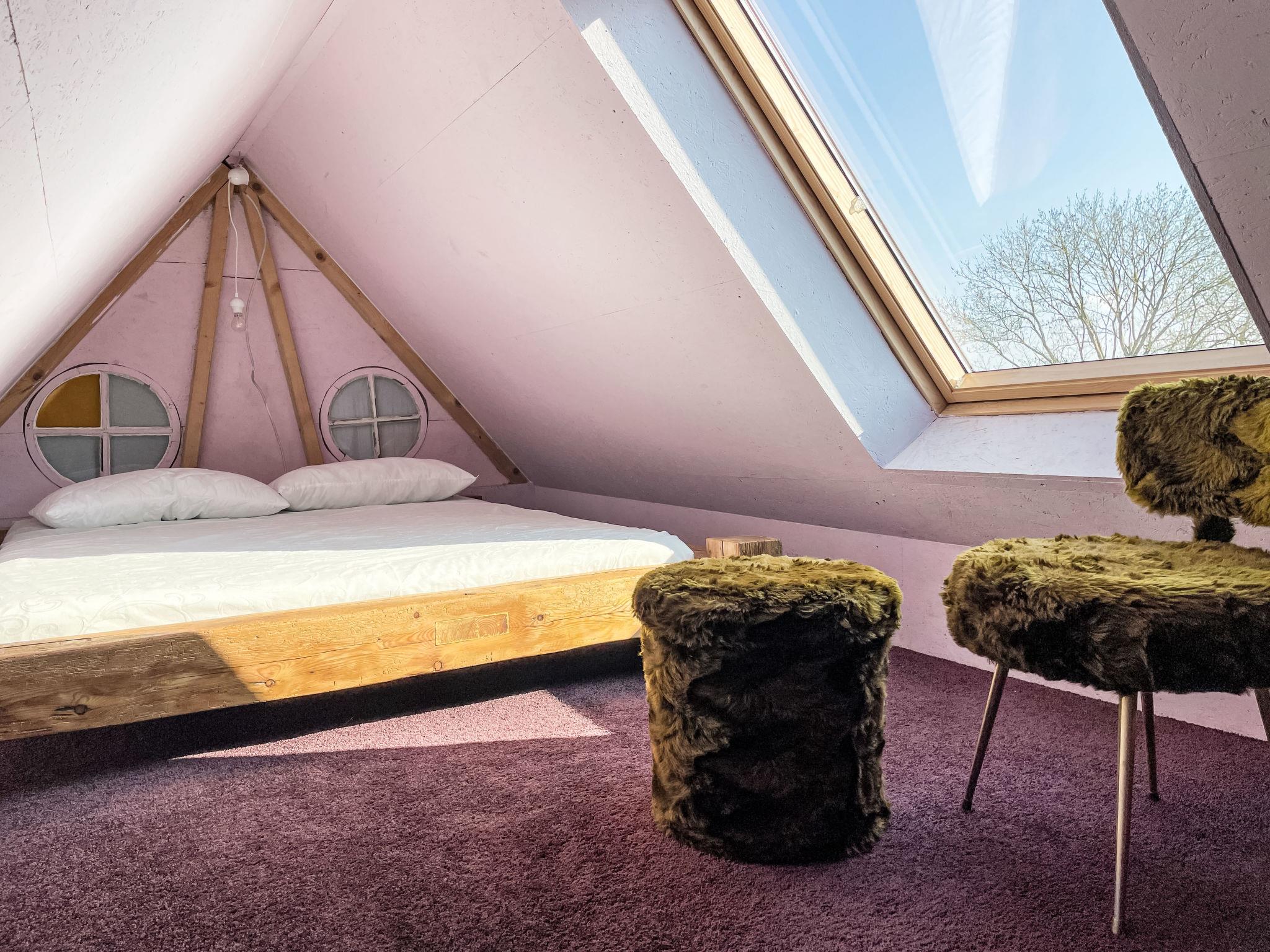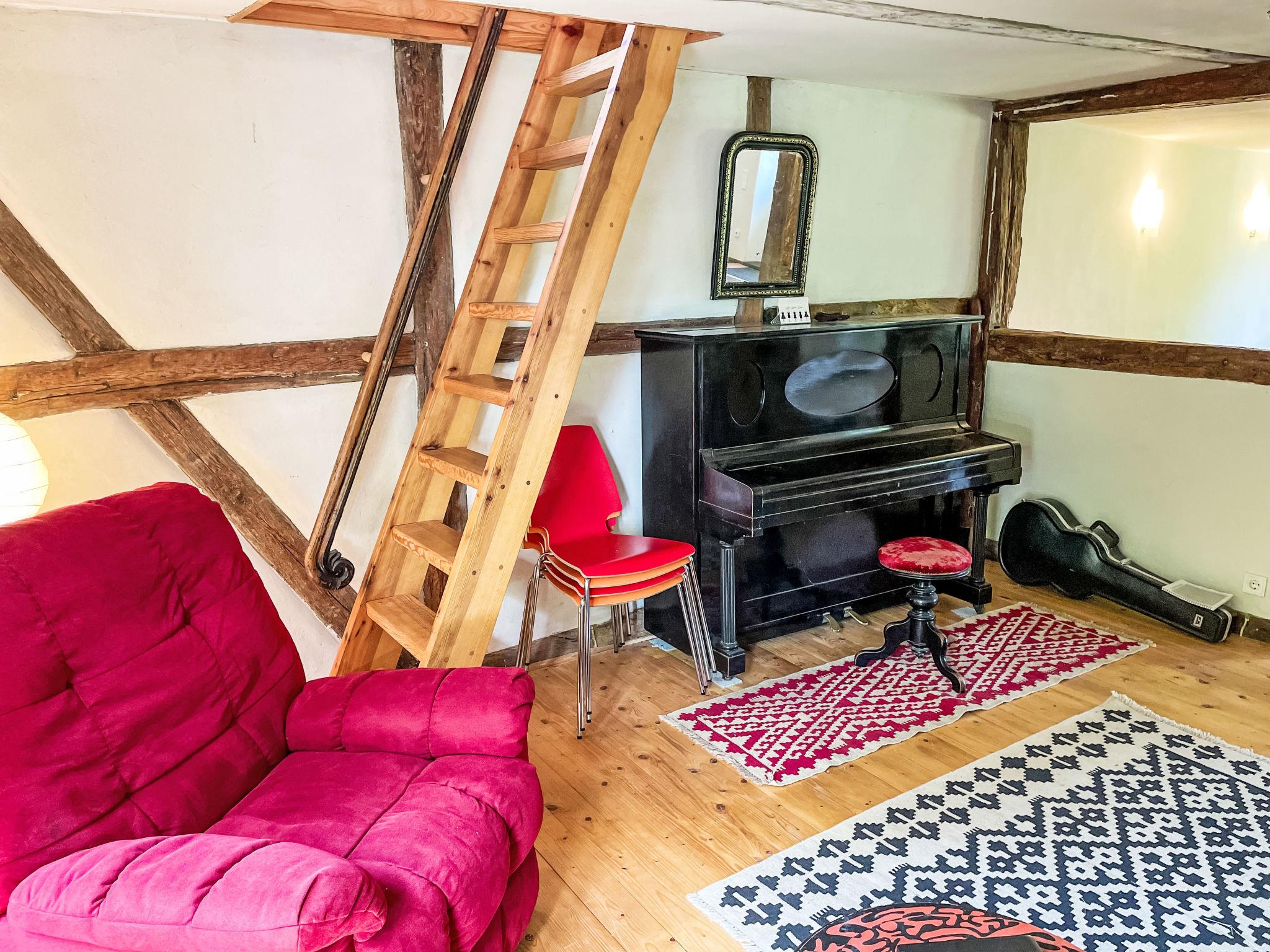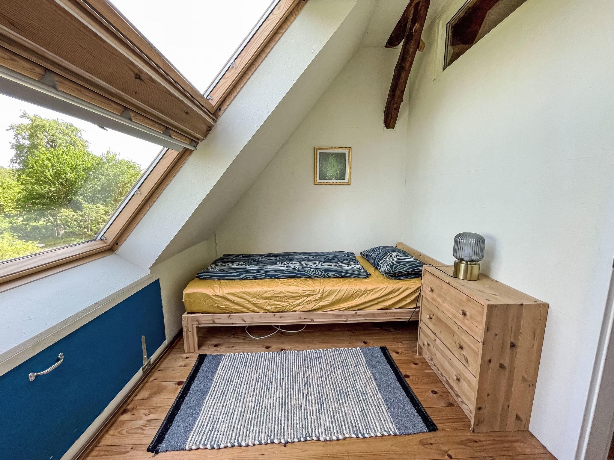 9-room cottage 120 m2 on 3 levels. Spacious, partly with sloping ceilings, rustic and wooden furniture furnishings: large living/dining room with open-hearth fireplace (only for decoration). Exit to the garden, to the terrace. 1 room with 1 sofabed (120 cm, length 190 cm). Playroom. Open kitchen (oven, dishwasher, freezer, pizza oven) with dining table. Shower/WC. Upper floor: 1 room with sloping ceilings with panoramic window with 1 bed (90 cm, length 200 cm), 1 double bed (140 cm, length 200 cm). 1 room with sloping ceilings with panoramic window with 2 beds (90 cm, length 200 cm). (steep stair) gallery with TV. Bath/shower/WC. 2nd upper floor: (ladder), 1 room with sloping ceilings, ceiling height 75 - 180 cm with 1 double bed (180 cm, length 200 cm). (ladder), 1 room with sloping ceilings, ceiling height 75 - 180 cm with 2 beds (80 cm, length 200 cm). Large terrace 30 m2. Terrace furniture, barbecue, deck chairs (2). Very beautiful view of the garden. Facilities: washing machine, dryer, children's high chair, hair dryer, logs (extra), baby changing unit. Internet (WiFi, free). Please note: suitable for families. Non-smoking house. Smoke alarm, fire extinguisher.