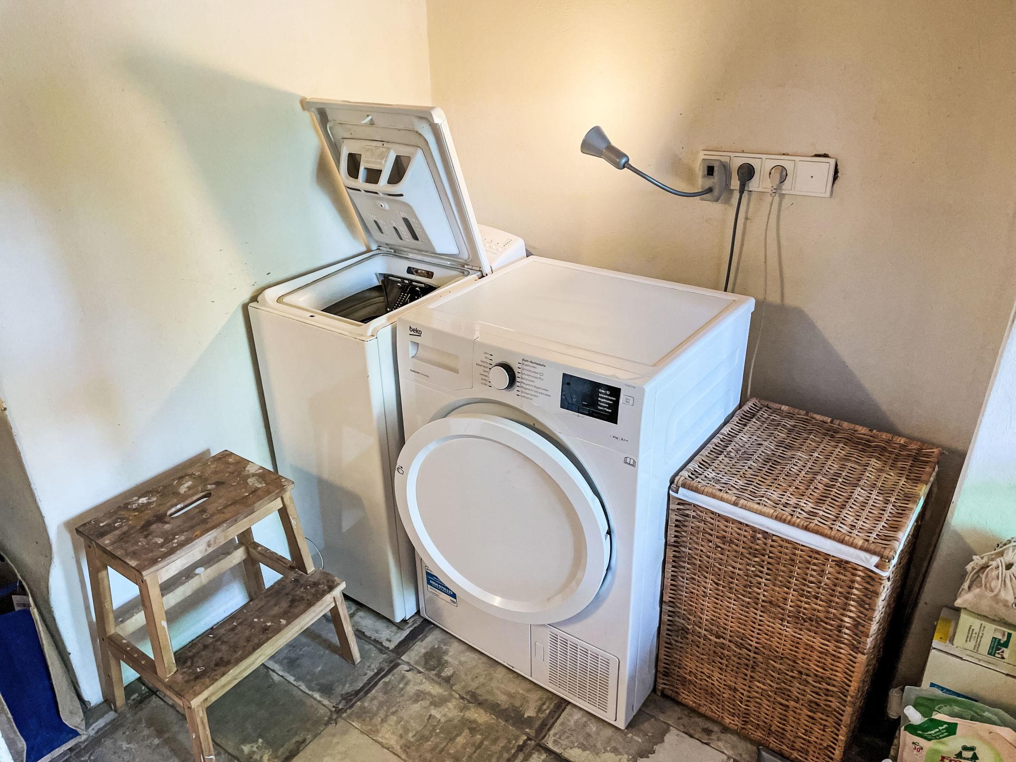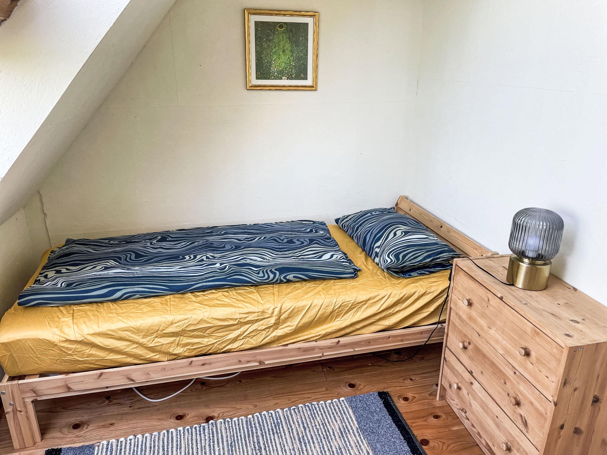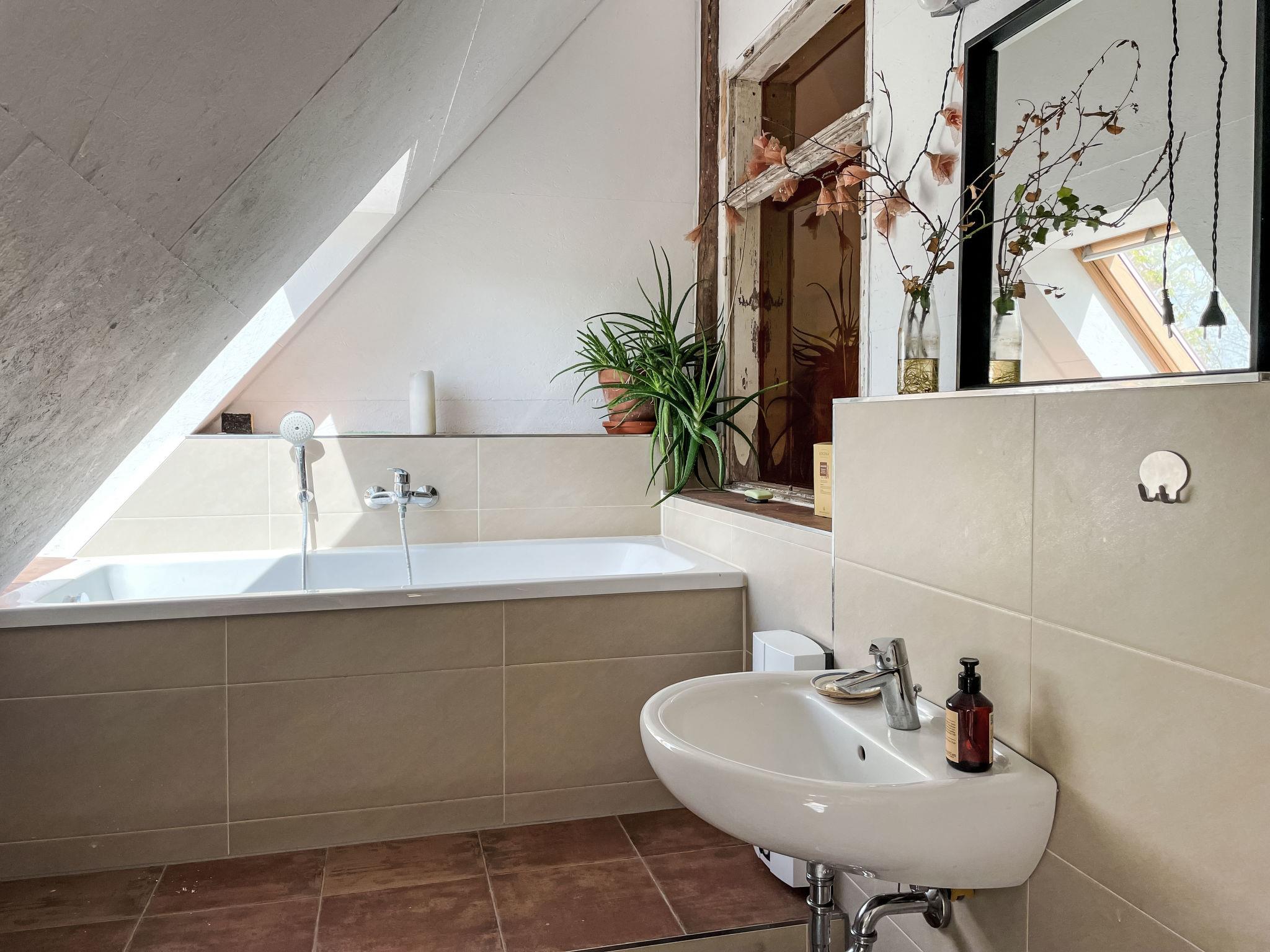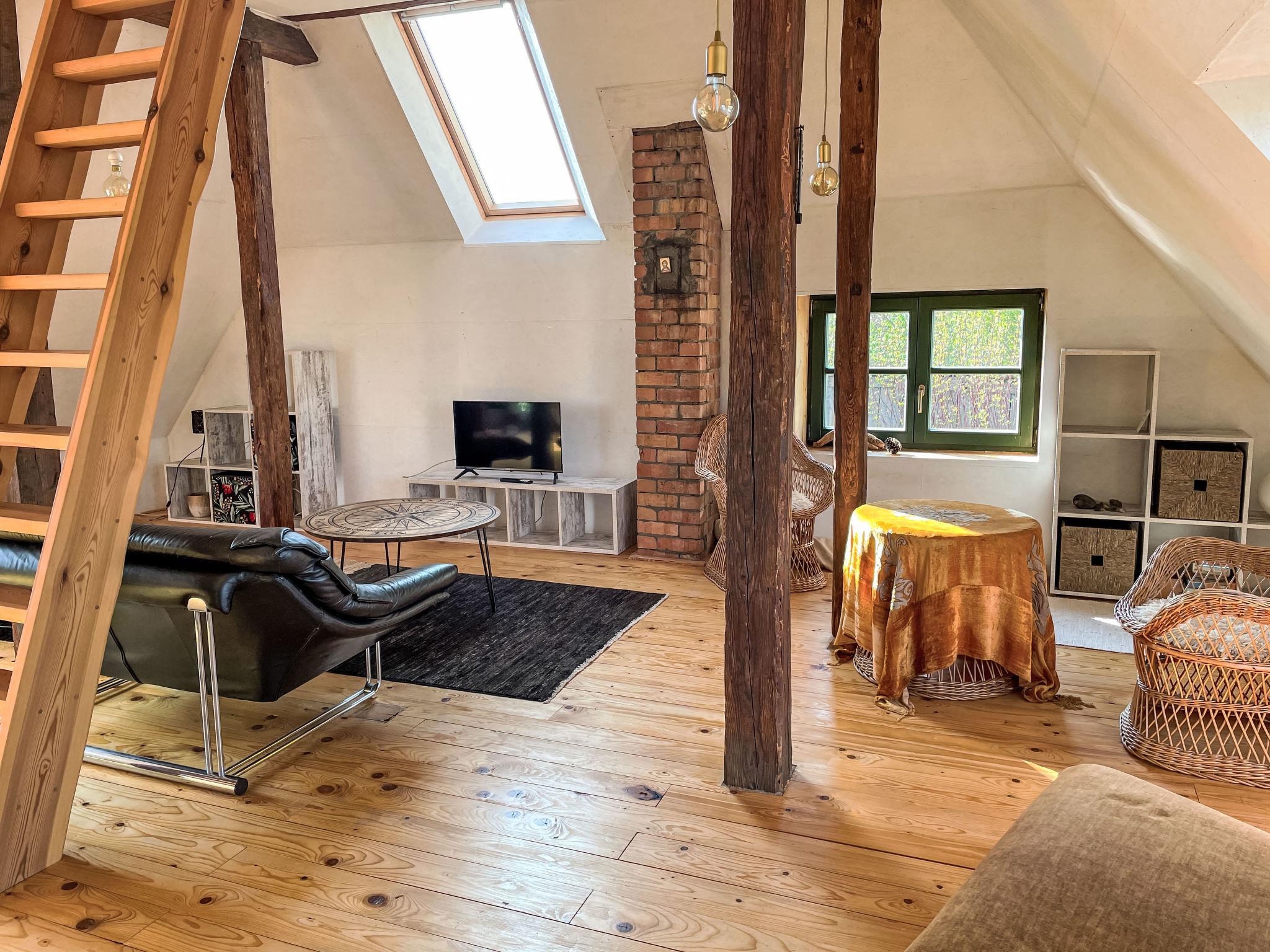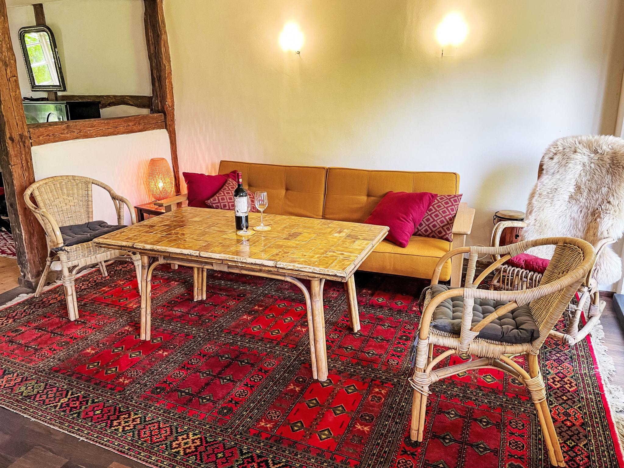 9-room cottage 120 m2 on 3 levels. Spacious, partly with sloping ceilings, rustic and wooden furniture furnishings: large living/dining room with open-hearth fireplace (only for decoration). Exit to the garden, to the terrace. 1 room with 1 sofabed (120 cm, length 190 cm). Playroom. Open kitchen (oven, dishwasher, freezer, pizza oven) with dining table. Shower/WC. Upper floor: 1 room with sloping ceilings with panoramic window with 1 bed (90 cm, length 200 cm), 1 double bed (140 cm, length 200 cm). 1 room with sloping ceilings with panoramic window with 2 beds (90 cm, length 200 cm). (steep stair) gallery with TV. Bath/shower/WC. 2nd upper floor: (ladder), 1 room with sloping ceilings, ceiling height 75 - 180 cm with 1 double bed (180 cm, length 200 cm). (ladder), 1 room with sloping ceilings, ceiling height 75 - 180 cm with 2 beds (80 cm, length 200 cm). Large terrace 30 m2. Terrace furniture, barbecue, deck chairs (2). Very beautiful view of the garden. Facilities: washing machine, dryer, children's high chair, hair dryer, logs (extra), baby changing unit. Internet (WiFi, free). Please note: suitable for families. Non-smoking house. Smoke alarm, fire extinguisher.