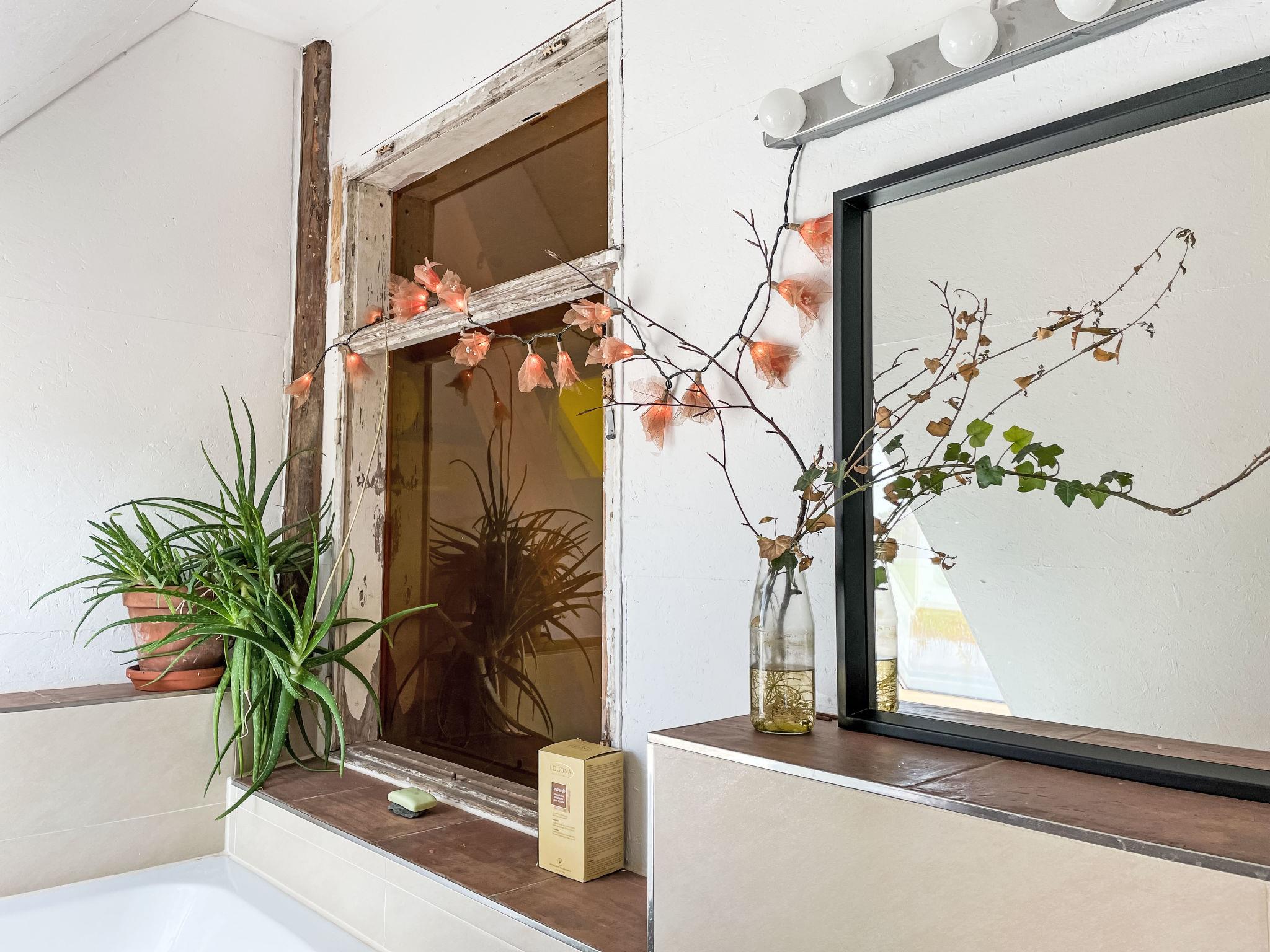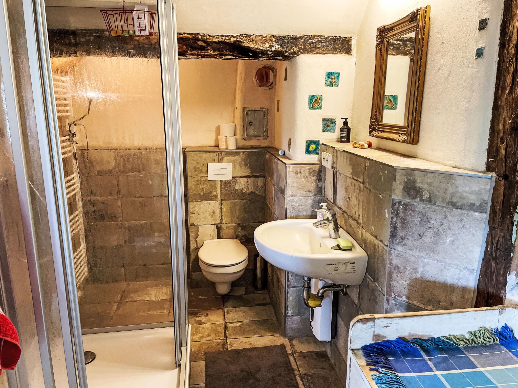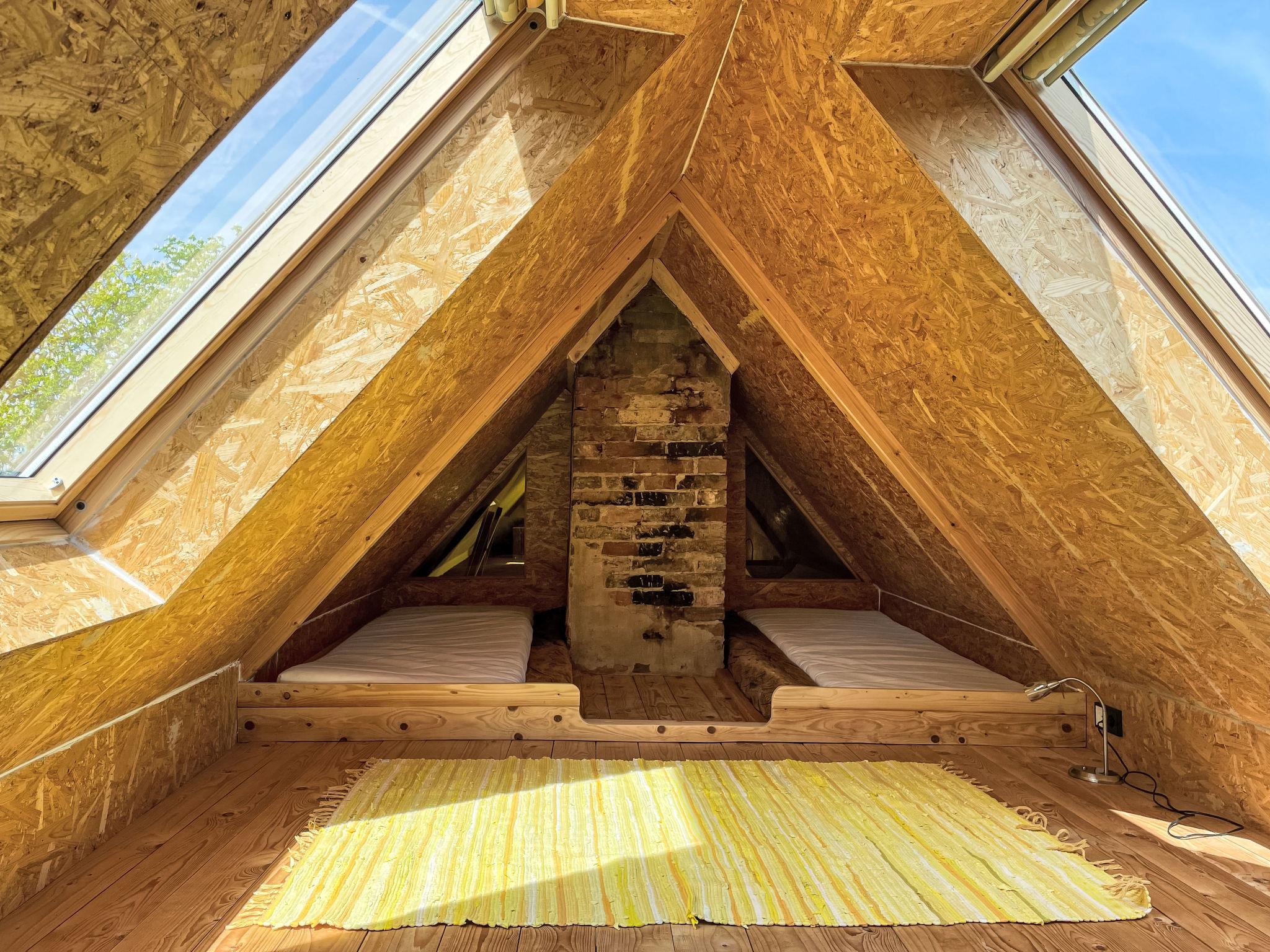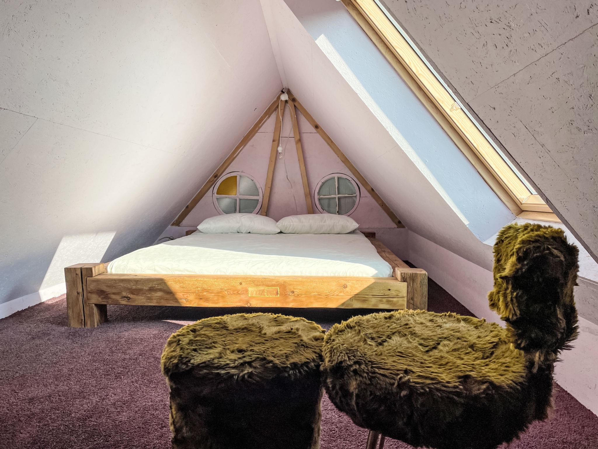 9-room cottage 120 m2 on 3 levels. Spacious, partly with sloping ceilings, rustic and wooden furniture furnishings: large living/dining room with open-hearth fireplace (only for decoration). Exit to the garden, to the terrace. 1 room with 1 sofabed (120 cm, length 190 cm). Playroom. Open kitchen (oven, dishwasher, freezer, pizza oven) with dining table. Shower/WC. Upper floor: 1 room with sloping ceilings with panoramic window with 1 bed (90 cm, length 200 cm), 1 double bed (140 cm, length 200 cm). 1 room with sloping ceilings with panoramic window with 2 beds (90 cm, length 200 cm). (steep stair) gallery with TV. Bath/shower/WC. 2nd upper floor: (ladder), 1 room with sloping ceilings, ceiling height 75 - 180 cm with 1 double bed (180 cm, length 200 cm). (ladder), 1 room with sloping ceilings, ceiling height 75 - 180 cm with 2 beds (80 cm, length 200 cm). Large terrace 30 m2. Terrace furniture, barbecue, deck chairs (2). Very beautiful view of the garden. Facilities: washing machine, dryer, children's high chair, hair dryer, logs (extra), baby changing unit. Internet (WiFi, free). Please note: suitable for families. Non-smoking house. Smoke alarm, fire extinguisher.