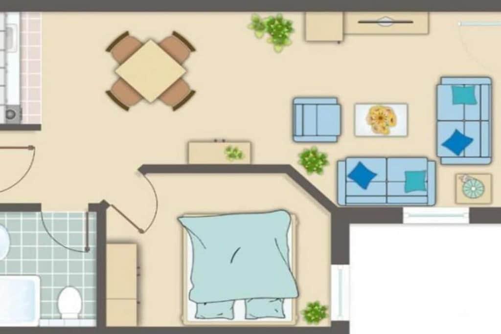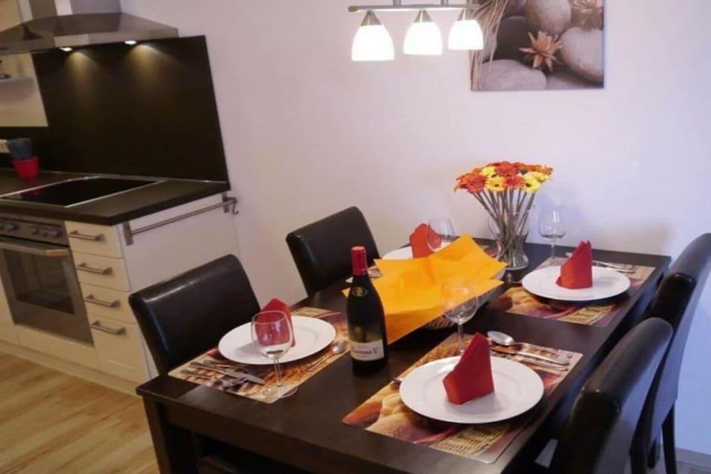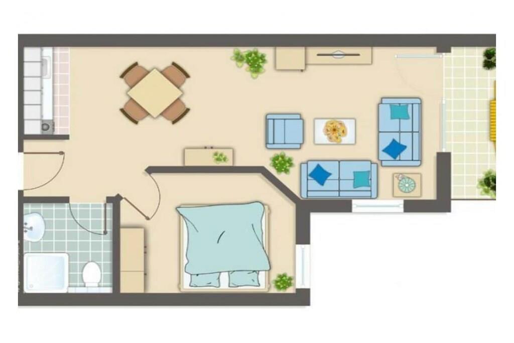 Das gemütliche 2-Raum-Appartement in der ersten Etage bietet Ihnen auf 39m² alles, was Sie für Ihren Urlaub brauchen. Hier können Sie sich in Ihrem eigenen kleinen Reich hervorragend entfalten. Der komfortable Wohnbereich ist mit einer gemütlichen Sofaecke ausgestattet. Nach einem ereignisreichen Urlaubstag legen Sie hier die Füße hoch und entspannen bei einem netten Film und einem Glas Wein. An den Wohnbereich grenzt die hochwertige, voll ausgestattete Küche. Hier finden Sie einen Kühlschrank mit großem Gefrierfach, einen Herd mit Dunstabzugshaube, Ceranfeld und Backofen, sowie Geschirrspülmaschine, Toaster, Kaffeemaschine und Wasserkocher. Das separate Schlafzimmer ist mit einem Doppelbett eingerichtet.