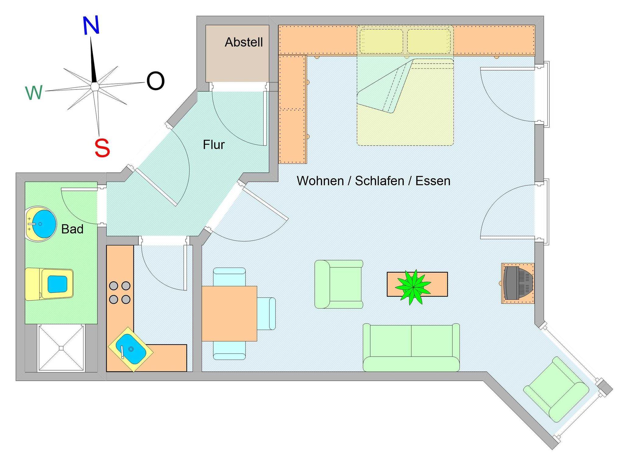 Herzlich willkommen in der Ferienwohnung Nr. 35 im Haus Olymp! Die gemütlich eingerichtete 1-Raum-Ferienwohnung befindet sich im dritten Obergeschoss des Hauses. Auf 42 qm Wohnfläche können hier bis zu 2 Personen erholsame Urlaubstage genießen. Es empfangen Sie ein heller offener Wohn- und Schlafbereich mit einer Küchenzeile sowie ein kleiner Flurbereich, ein Duschbad und ein Abstellraum.