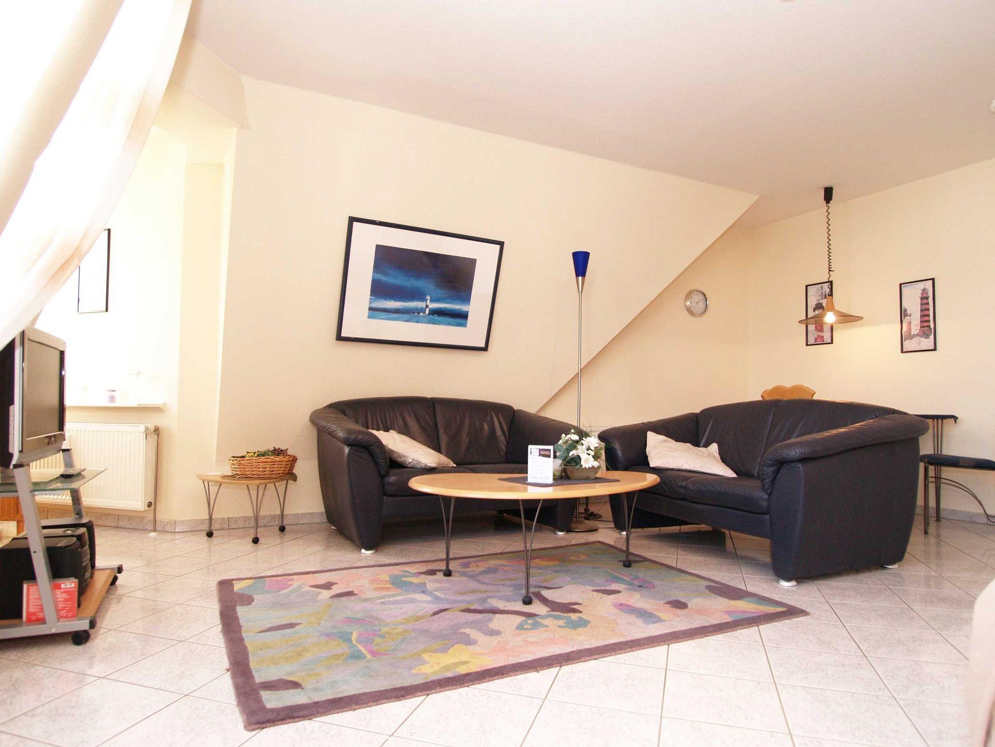 Der gemütliche Wohnbereich der Ferienwohnung ist für Sie mit einer Leder-Couchgarnitur, einer Schrankwand mit Kleiderschrank sowie einem 32-Zoll-Flatscreen-TV und einer Stereoanlage ausgestattet. Ein komfortables Polsterbett (Liegefläche 2 x 80 cm x 200 cm) lädt zur Nachtruhe ein. Aus dem Erker der Wohnung können Sie den Blick zum Meer genießen.
