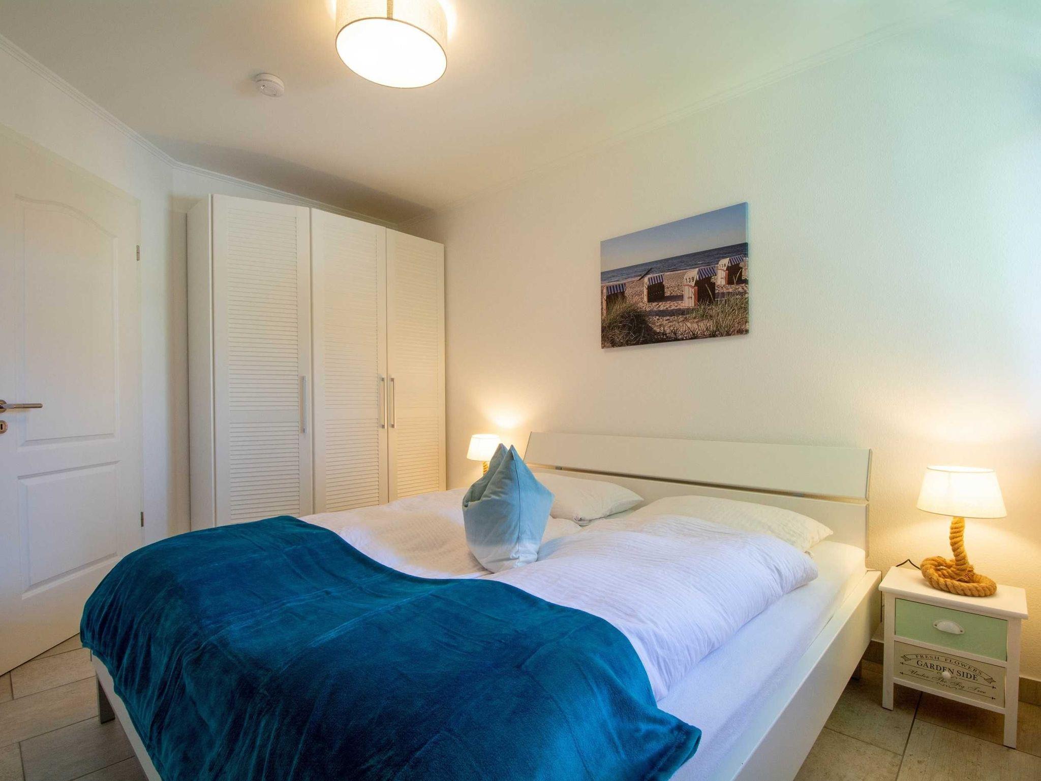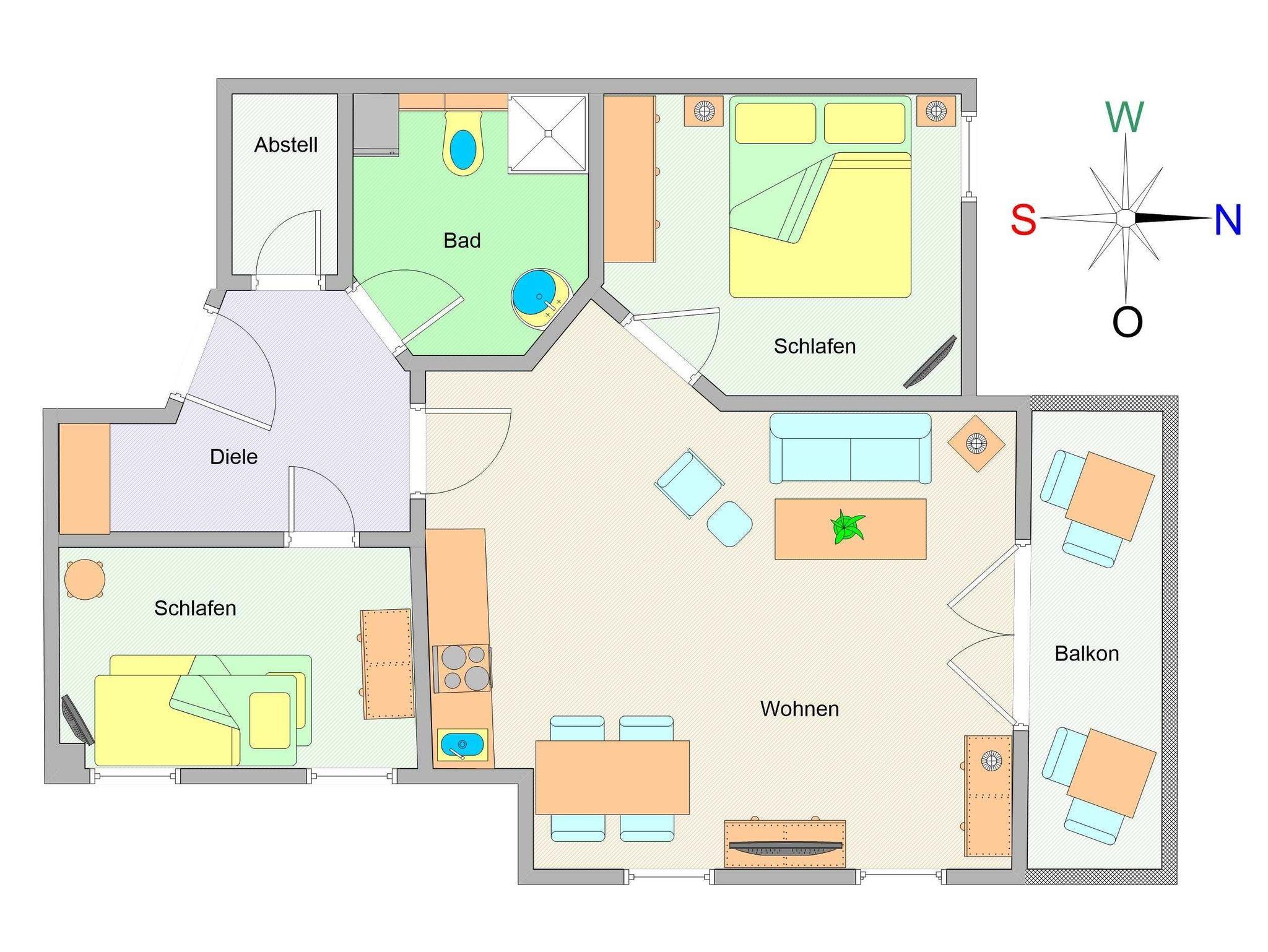 Sie wohnen in einer mit sehr viel Liebe zum Detail eingerichteten 3-Raum-Ferienwohnung von ca. 58 qm Größe, die sich im ersten Obergeschoss befindet. Das Wohnzimmer ist ausgestattet mit Küchenzeile (Ceranfeld, Mikrowelle mit Backofen, Kühlschrank mit Gefrierfach, Geschirrspüler, Wasserkocher, Toaster, Kaffeemaschine), bequemer Wohnlandschaft mit Sessel und Hocker, Essecke, Radio und FlatScreen-TV. Vom Wohnraum aus betreten Sie den Balkon in Richtung Norden, der zum Entspannen sowie zum Frühstück und Abendessen im Sonnenschein einlädt. Die Wohnung verfügt über zwei liebevoll eingerichtete Schlafzimmer: Das erste große Schlafzimmer ist ausgestattet mit einem Doppelbett, einem großen Kleiderschrank sowie einem FlatScreen-TV. Der zweite kleine Schlafraum verfügt über ein ausziehbares Tagesbett (1,60m x 2m), über einen Kleiderschrank sowie ein FlatScreen-TV. Das Bad mit Dusche (90cm x 90cm) und WC vervollständigt das Gesamtbild dieser Wohnung.