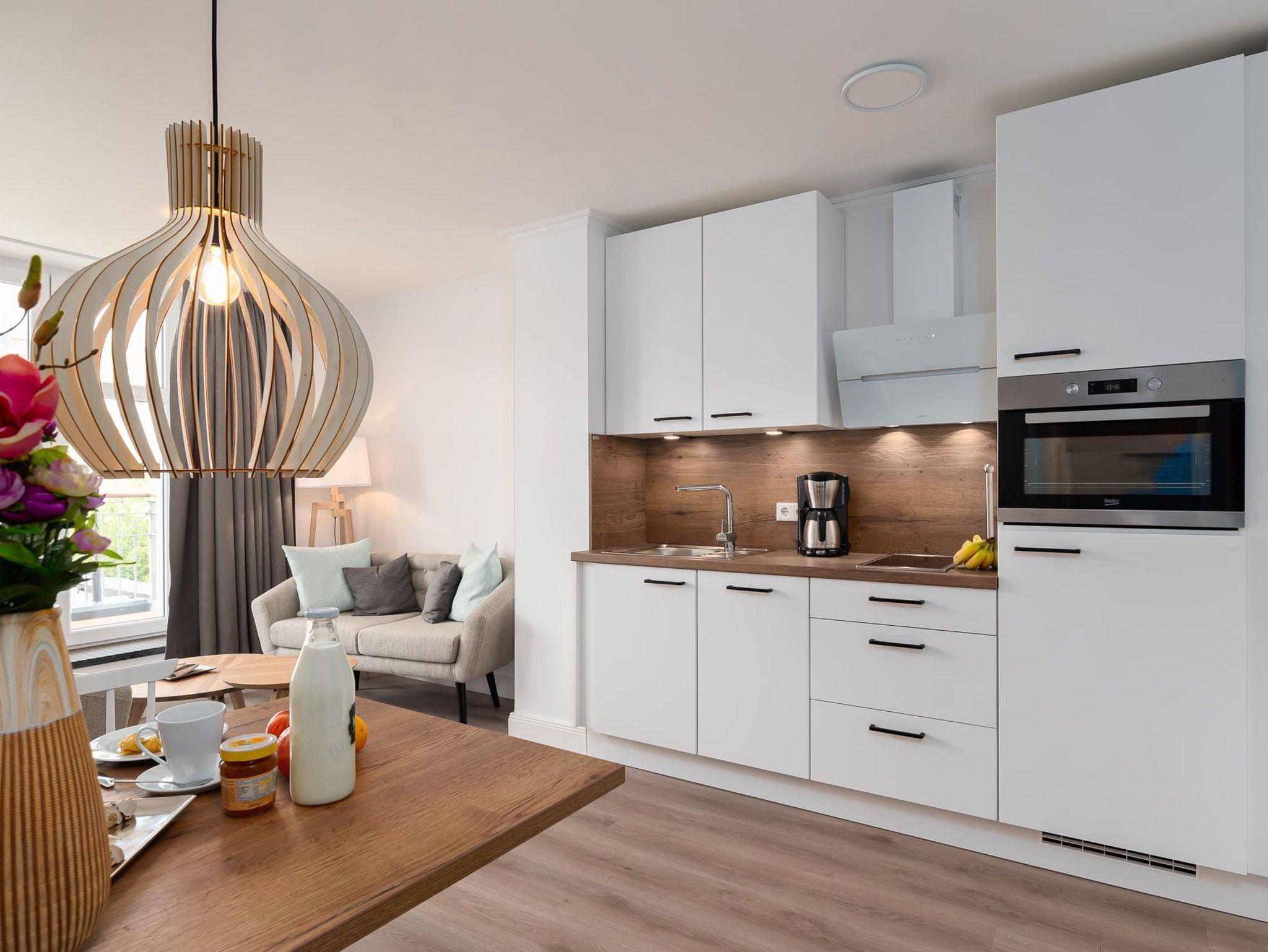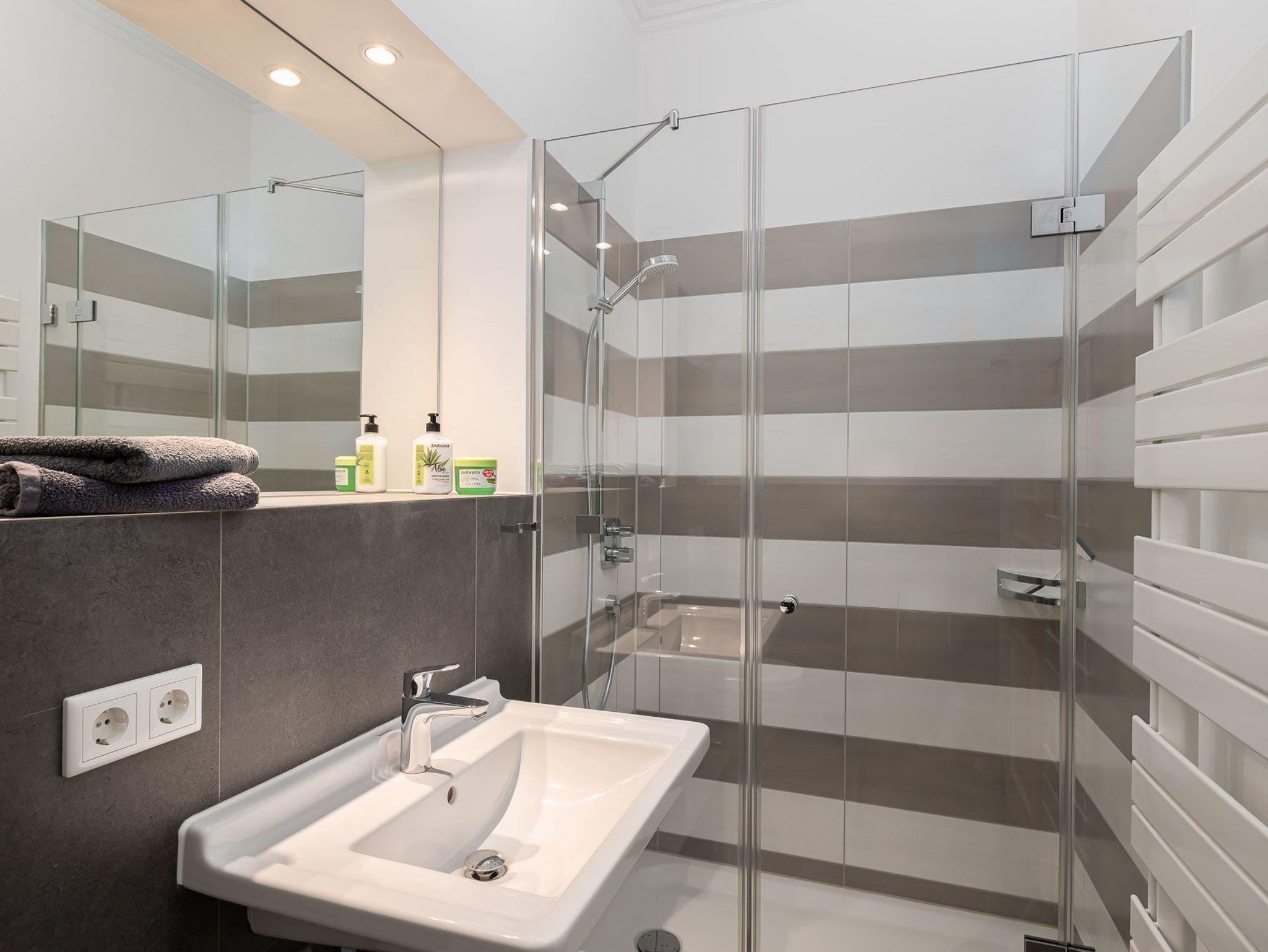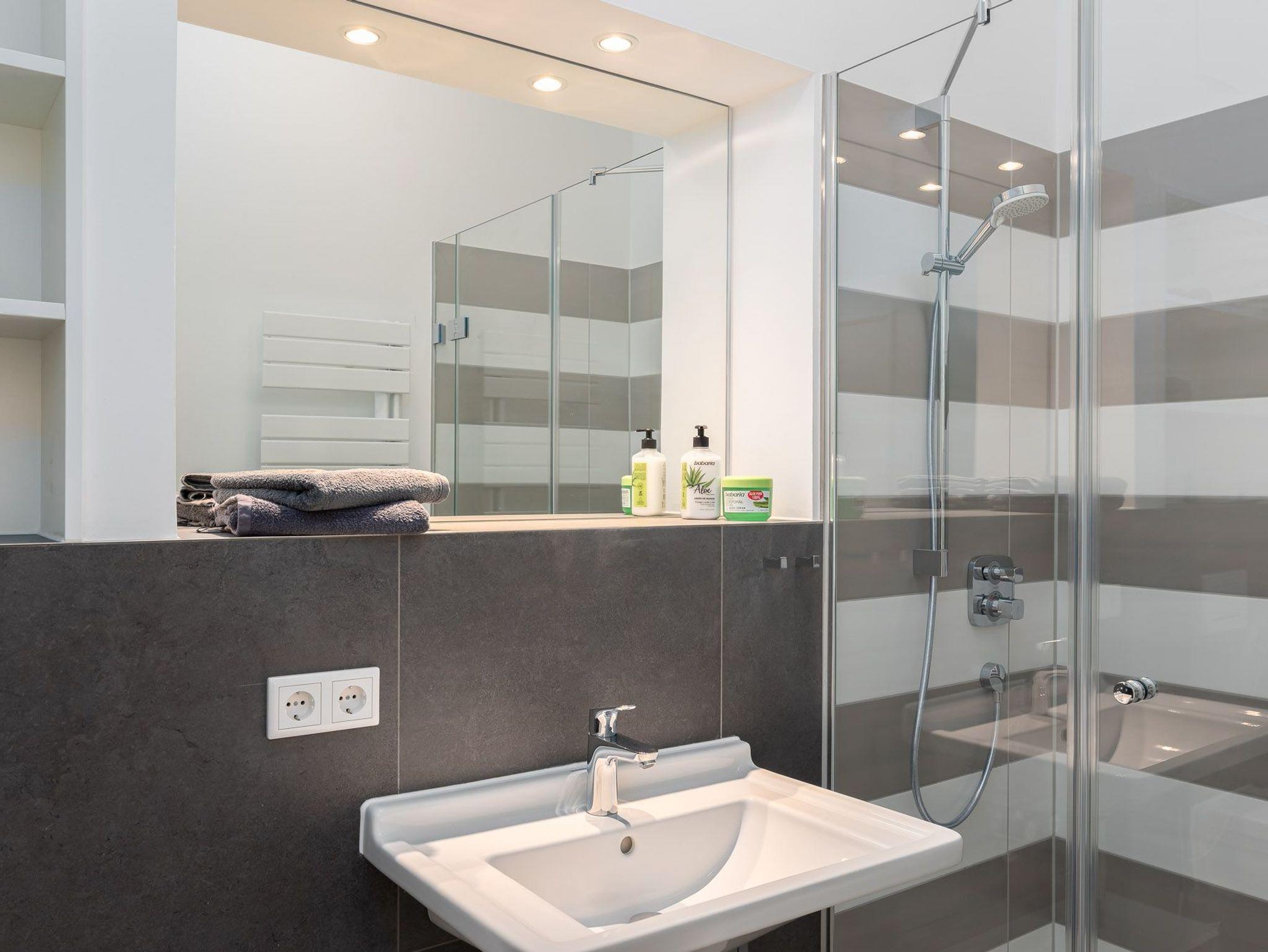 Das Bad verfügt über eine Dusche, einem Haartrockner und einem Handtuchtrockner. Zu Ihrem Apartment gehört ebenfalls ein großer und lichtdurchfluteter Wohn- und Essbereich mit offener Küche.