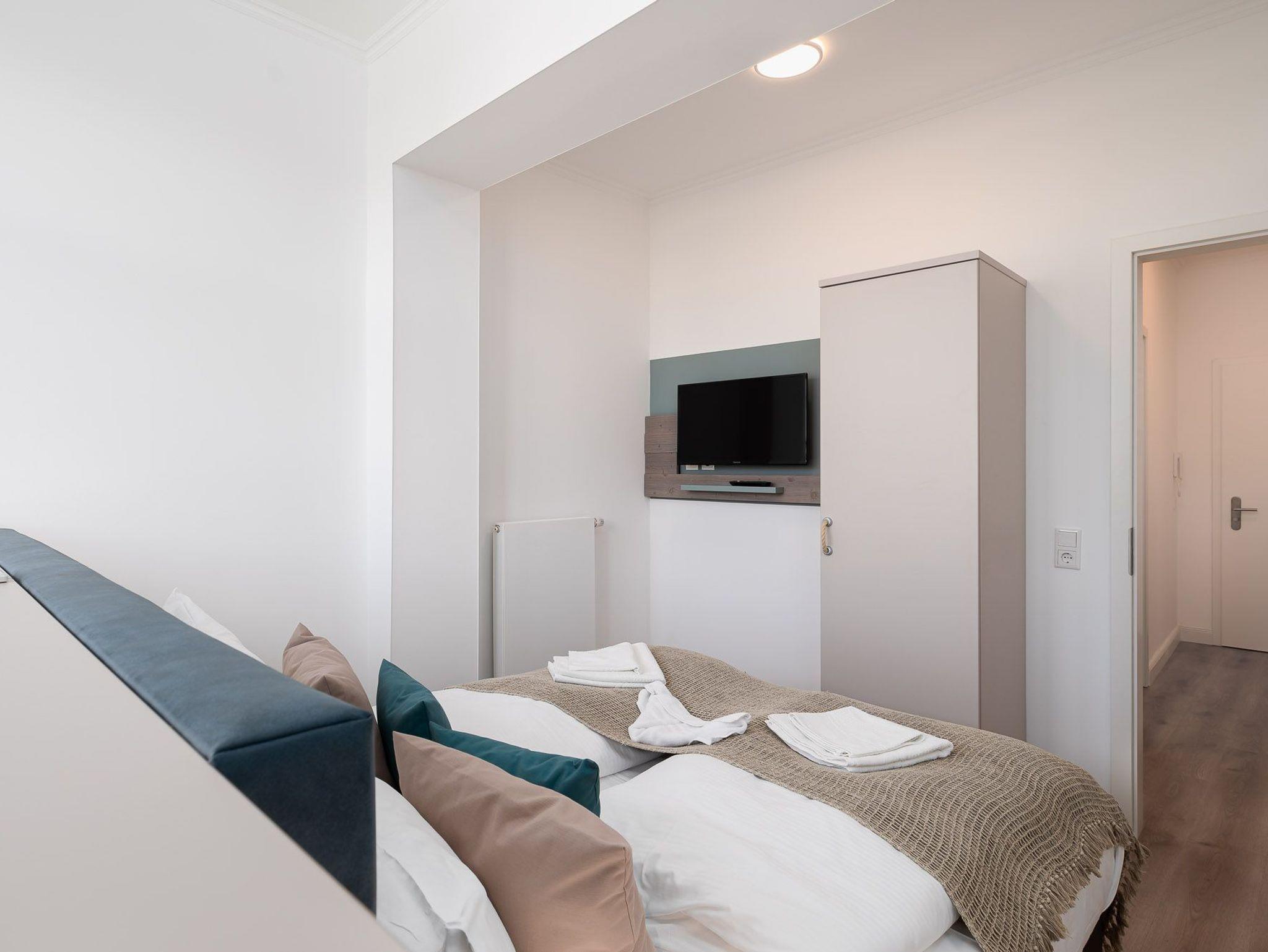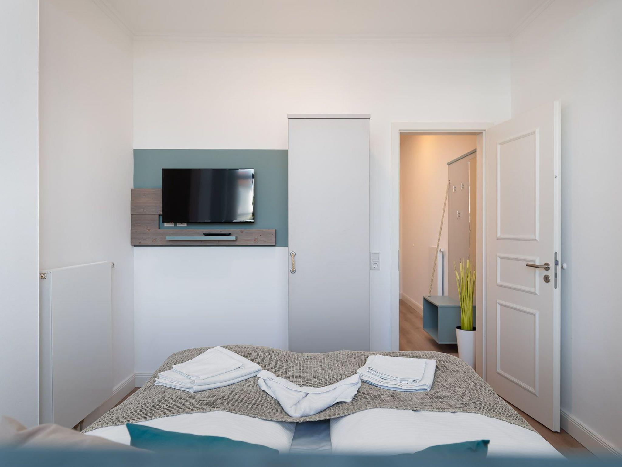 Das Schlafzimmer verfügt über ein 1,60 x 2,00 m Bett, sowie über einen Kleiderschrank und ein TV-Gerät. Für unsere kleinen Gäste können ein Kinderreisebett und ein Kinderhochstuhl bereitgestellt werden (kostenpflichtig zu buchbar).