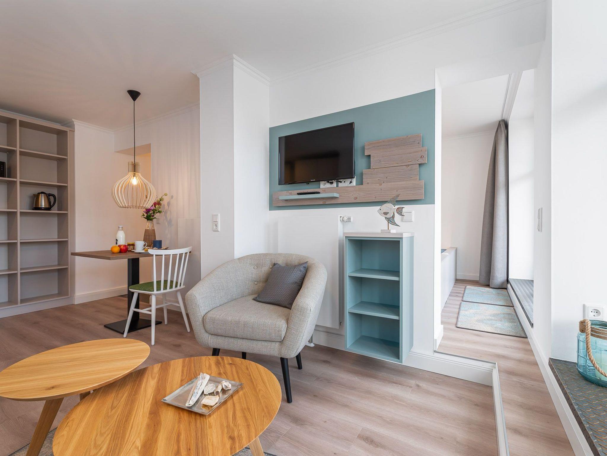Das Apartment bietet mit seinen zwei Zimmern Platz für 2 Personen. Außerdem verfügt es neben seiner Wohnfläche von ca. 44 qm auch über eine Terrasse. Diese ist mit Terrassenmöbeln und einem Sonnenschirm ausgestattet.