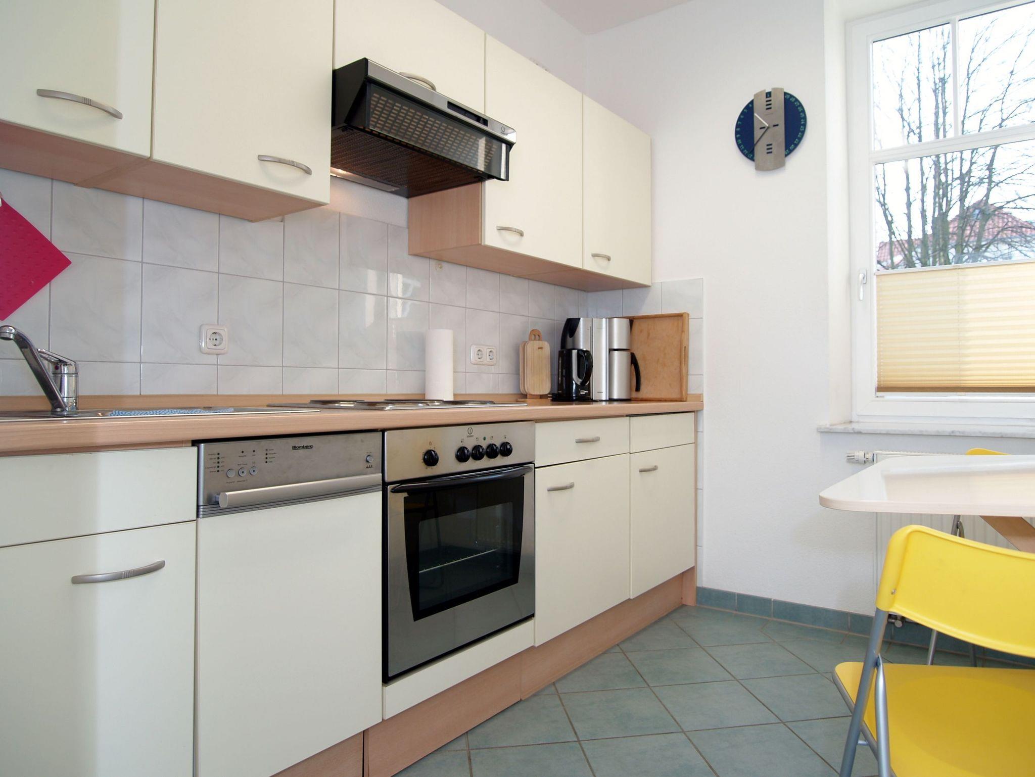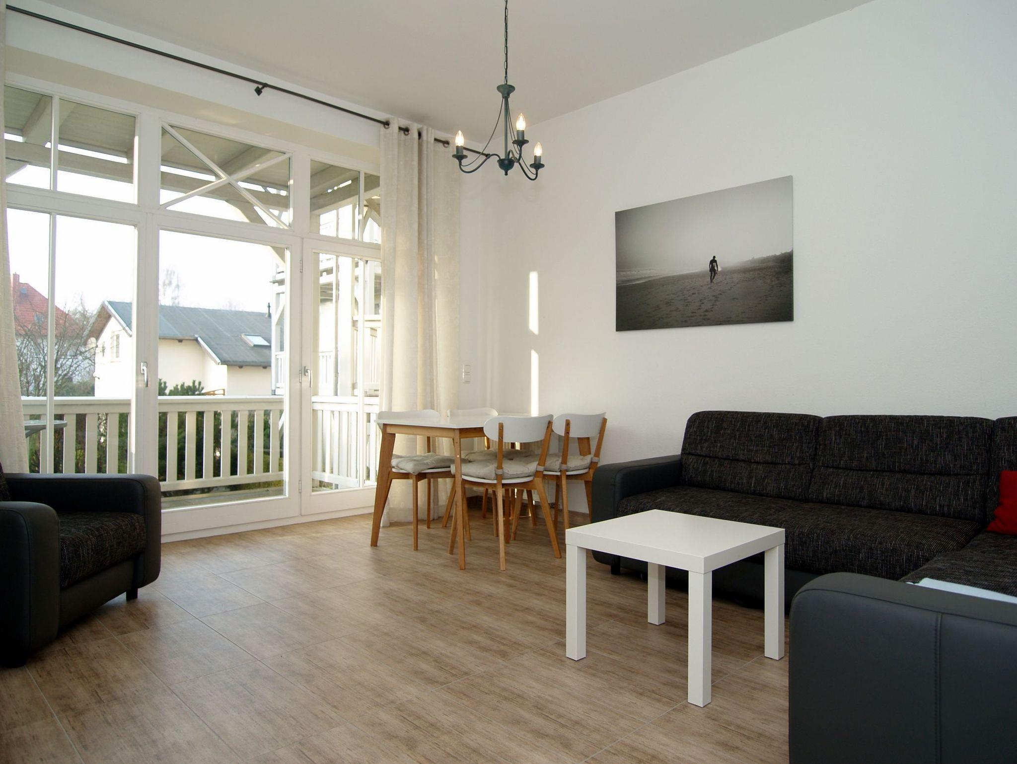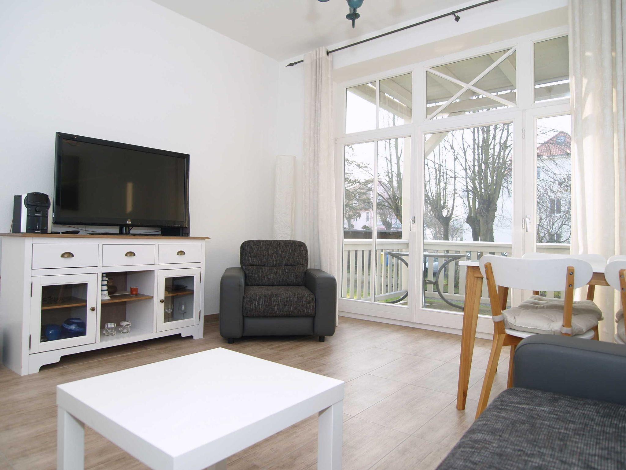 Urlaub machen in einem der schönsten Ostseebäder Kühlungsborns. Hier können Sie entspannen und Ihre Seele baumeln lassen. Es empfängt Sie eine helle freundliche 2-Raum-Ferienwohnung von 60 m² Größe, die sich im Hochparterre der Villa Barbarossa befindet. Der liebevoll eingerichtete Wohnraum ist ausgestattet mit einer modernen Couchgarnitur (Schlafcouch ausziehbar auf 140 cm Breite), 39-Zoll-Flachbild-TV und einer Stereoanlage sowie einem Esstisch mit 4 Stühlen. Vom Wohnbereich betreten Sie den möblierten Süd-Balkon, der zum Sonnenbaden und Relaxen einlädt. Die separate Küche ist ausgestattet mit einem 4-Platten-Herd mit Backofen und Dunstabzug, Geschirrspüler, Kühlschrank, Wasserkocher, Kaffeemaschine, Toaster und allen wichtigen Küchengeräten, die Sie für Ihr perfektes Dinner benötigen. Ein kleiner Esstisch mit 2 Stühlen befindet sich ebenfalls in der gefliesten Küche. Im Schlafzimmer befinden sich ein großes Doppelbett (180 cm x 200 cm) sowie ein großzügiger Kleiderschrank mit Ganzkörperspiegel. Das geflieste Tageslichtbad mit Duschwanne und WC vervollständigt das Gesamtbild dieser Wohnung.