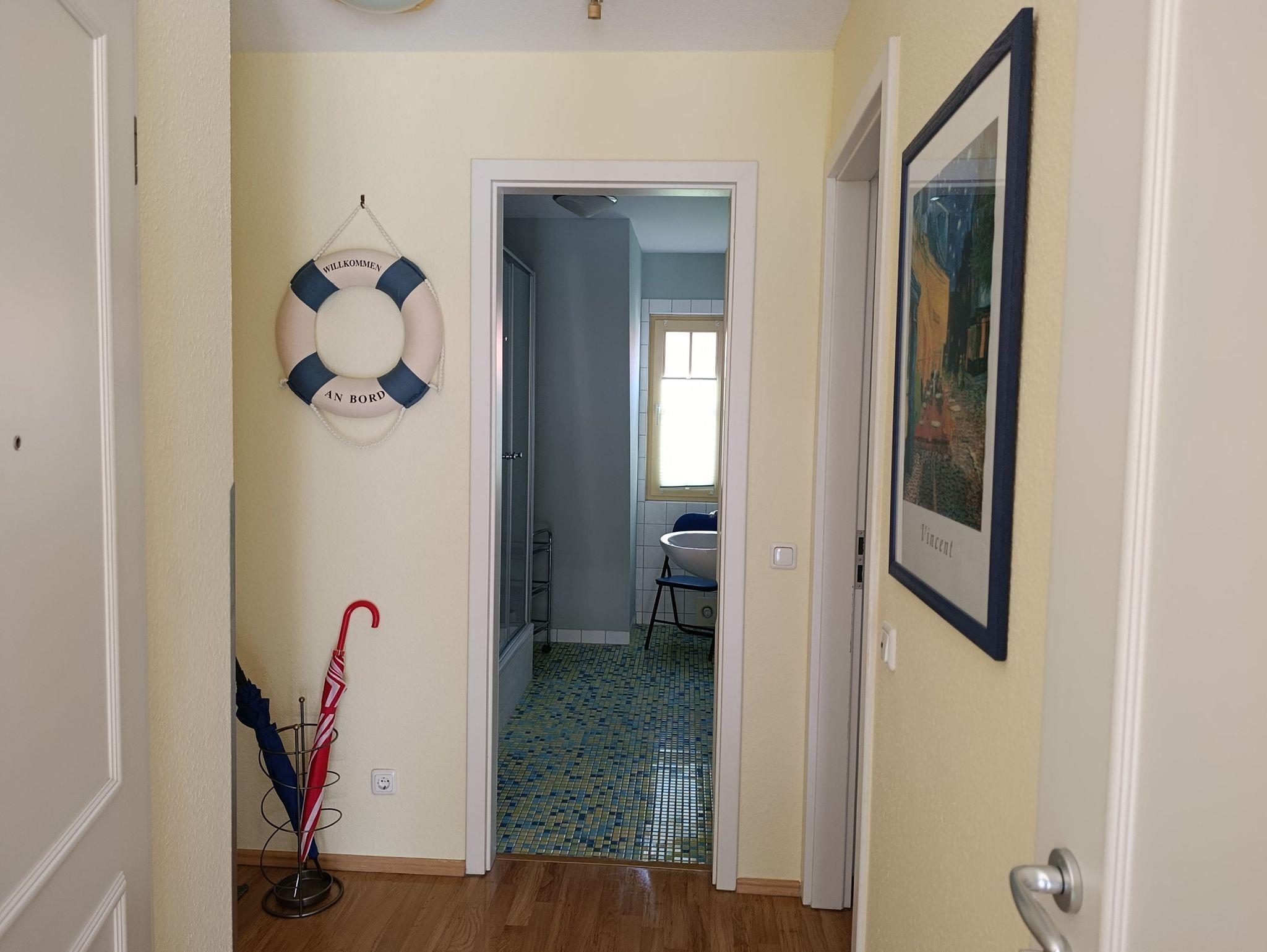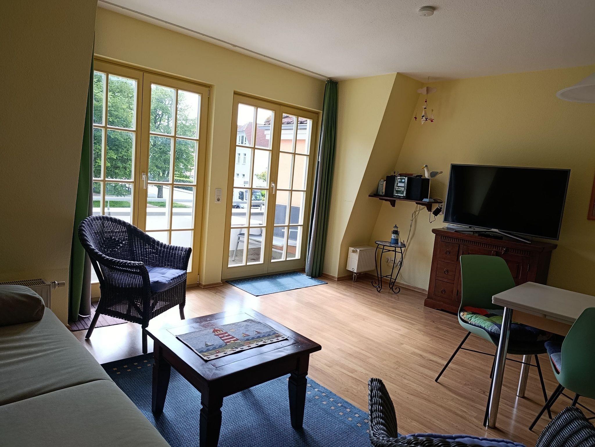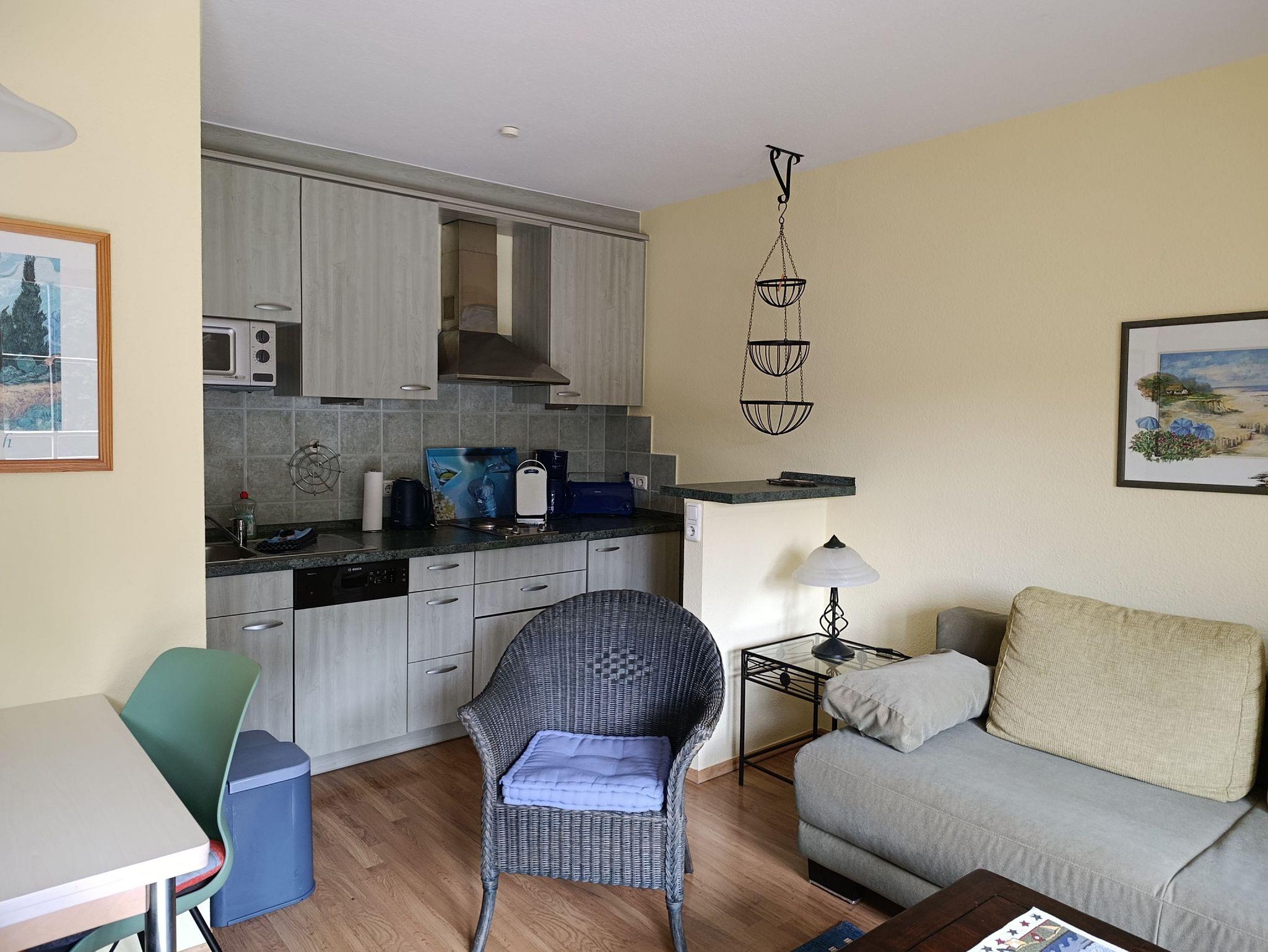 Nur 120 m vom Strand wohnen Sie in einer modern eingerichteten 2-Raum-Ferienwohnung. Die 50 qm große Wohnung liegt in der ersten Etage über der Einkaufspassage. Das Wohnzimmer ist mit einer Schlafcouch, Couchtisch, Anrichte, Regal, Kabel-TV, Radio, Essbereich (Esstisch und 4 Stühle) und Küchenzeile ausgestattet. Vom Ost-Balkon hat man einen wunderbaren Blick auf den Baltic-Park. Im Schlafzimmer stehen ein Doppelbett und ein Kleiderschrank. Die Küchenzeile wurde modern ausgestattet mit Mikrowelle, Kühlschrank, Kaffeemaschine, Zweiplattenkochfeld, Toaster, Geschirrspüler, Wasserkocher und Geschirr. Das Bad mit Dusche und WC komplettiert die Wohnung.