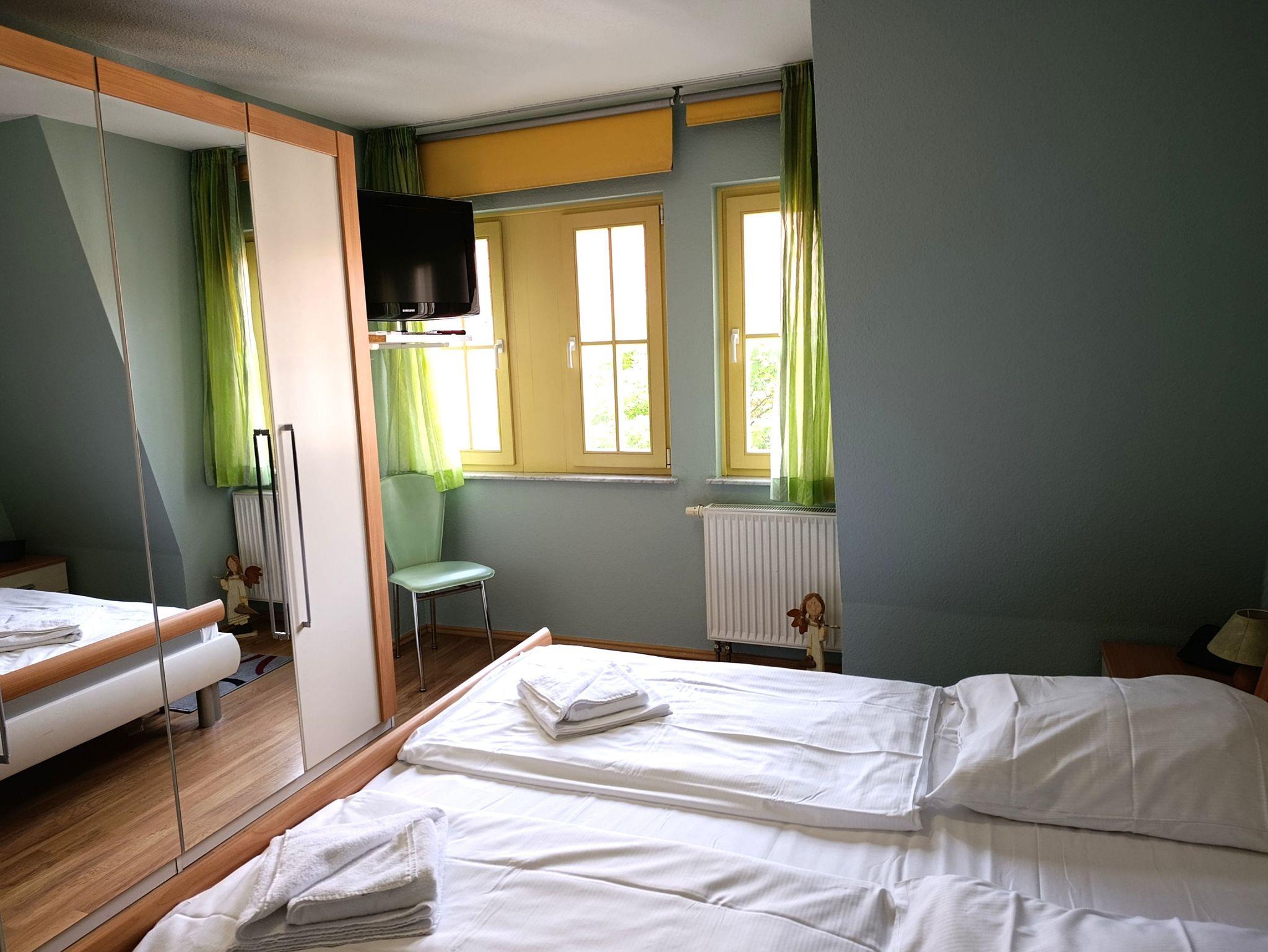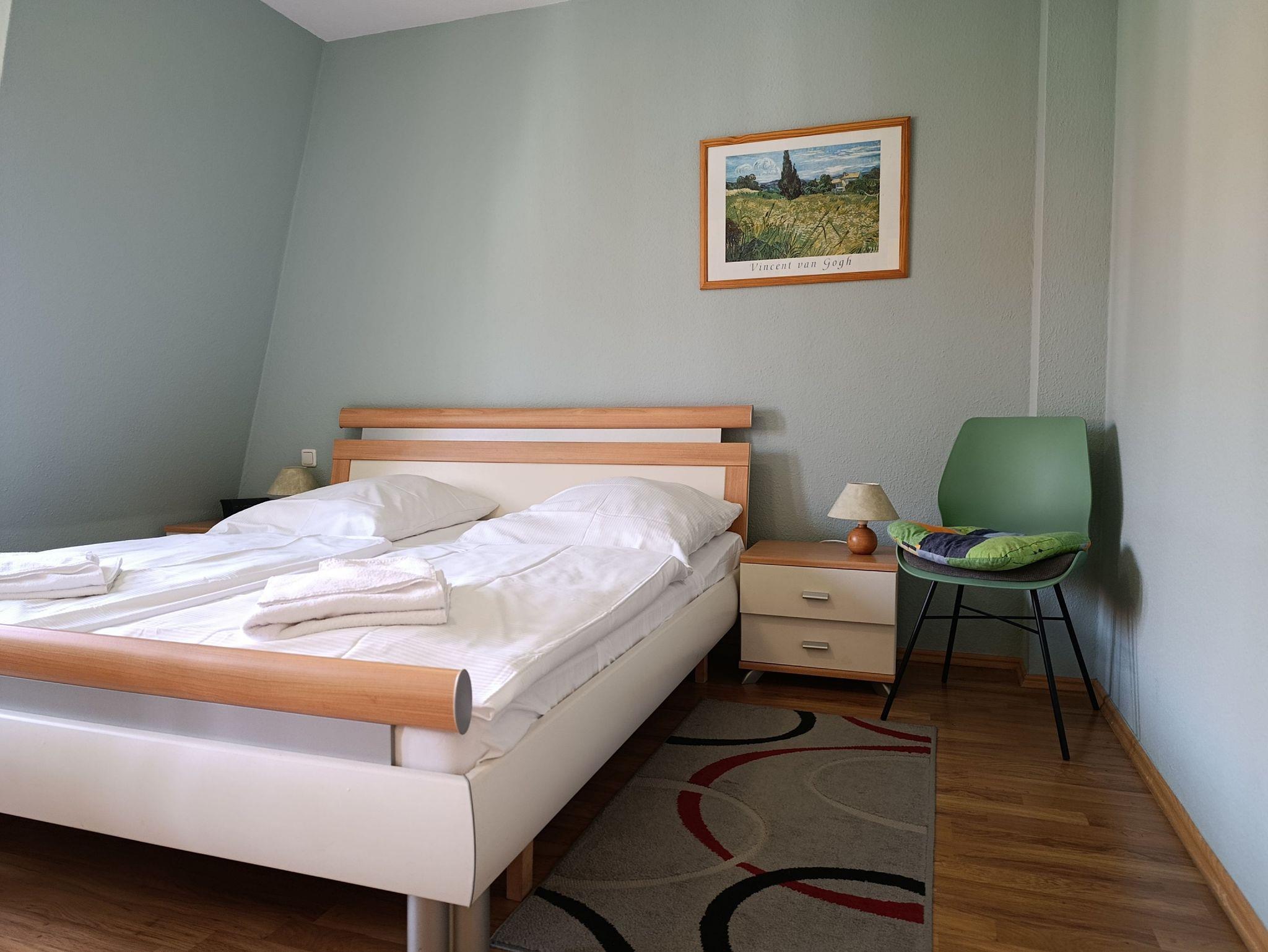 Schlafzimmer mit Doppelbett und Kleiderschrank