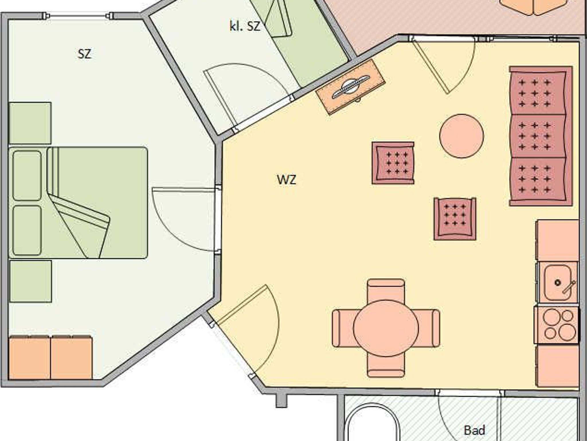 Die Wohnung ist im 1. Obergeschoss gelegen und hat einen Balkon zur Südseite. Die Wohnungsgröße beträgt ca. 45 qm und teilt sich in Wohnzimmer, Küchenzeile, Schlafzimmer, kl. Kinderzimmer, Bad mit Wanne. Im Wohnzimmer befindet sich ein Esstisch mit 4 Stühlen, eine Küchenzeile, Kühlschrank, 2 Kochfelder, Mikrowelle mit Backofen, Tresor, HD-Sat TV und Telefon.