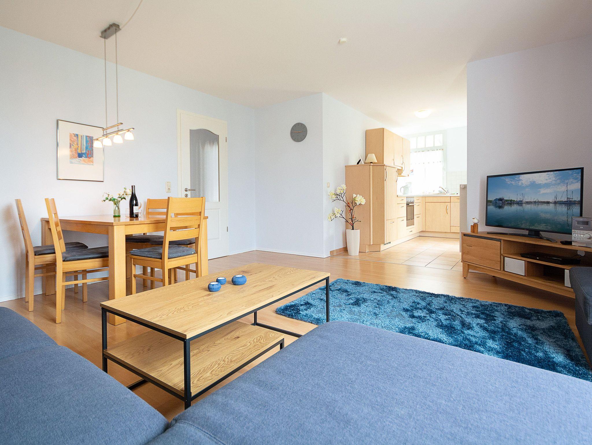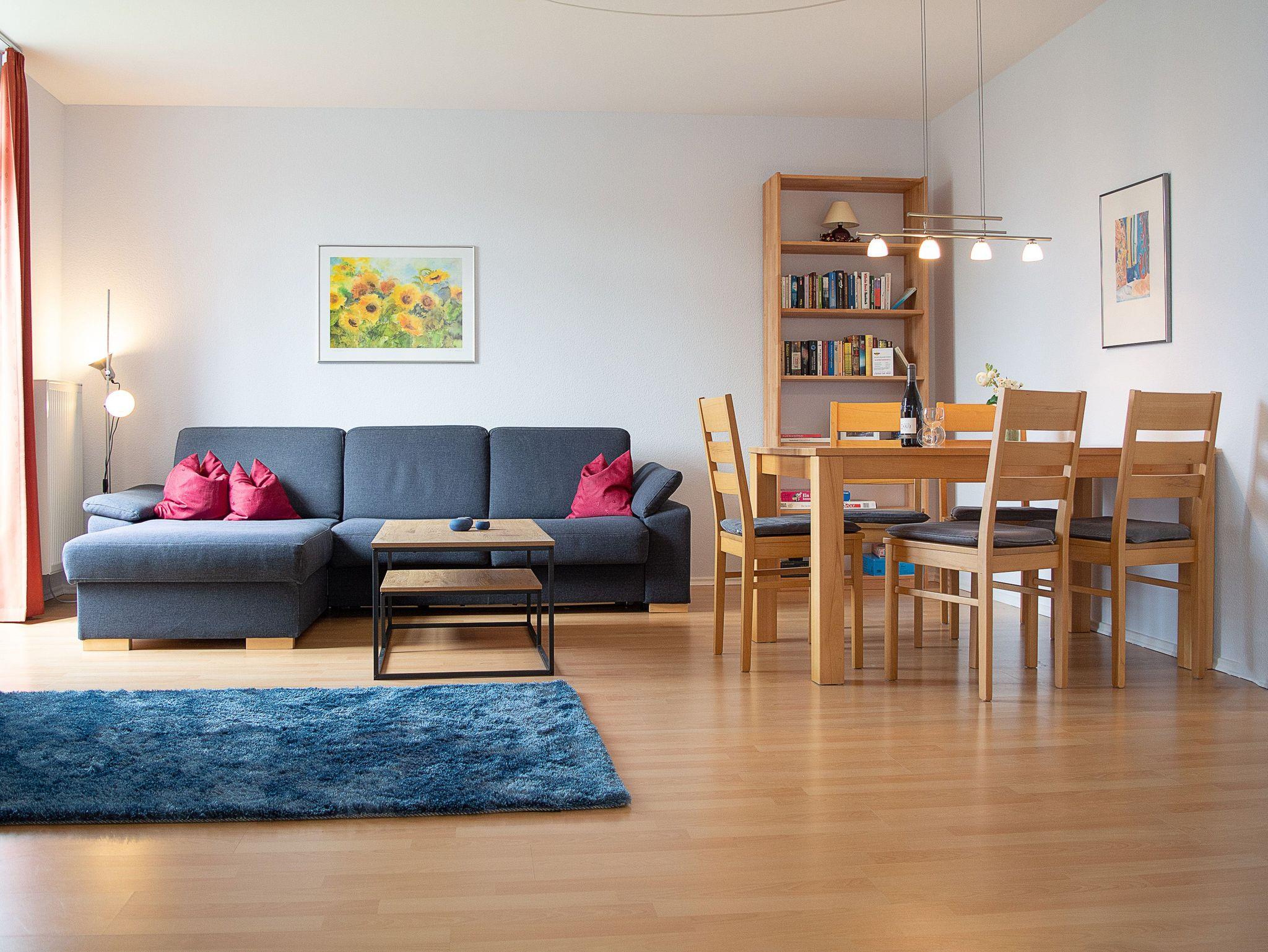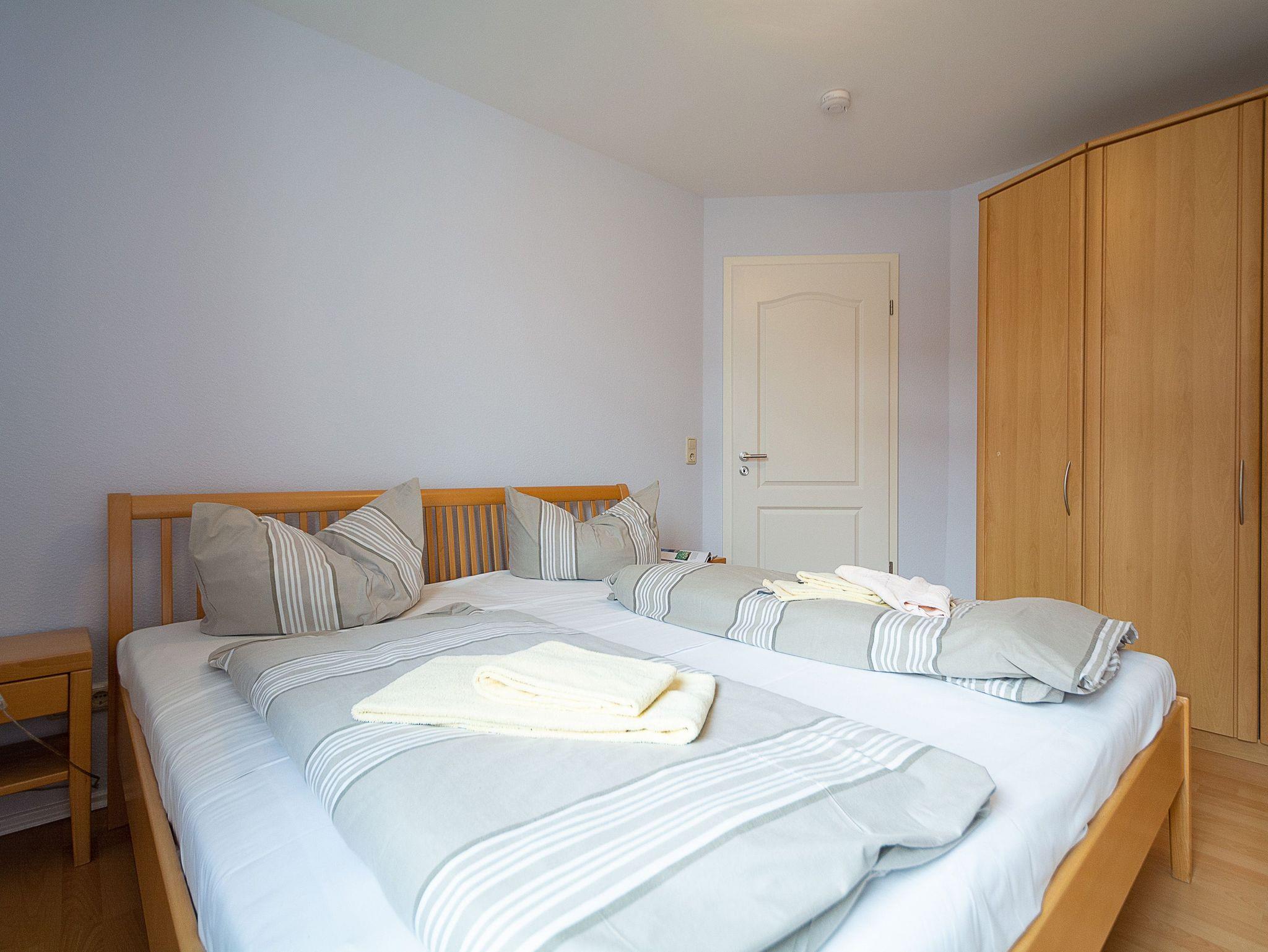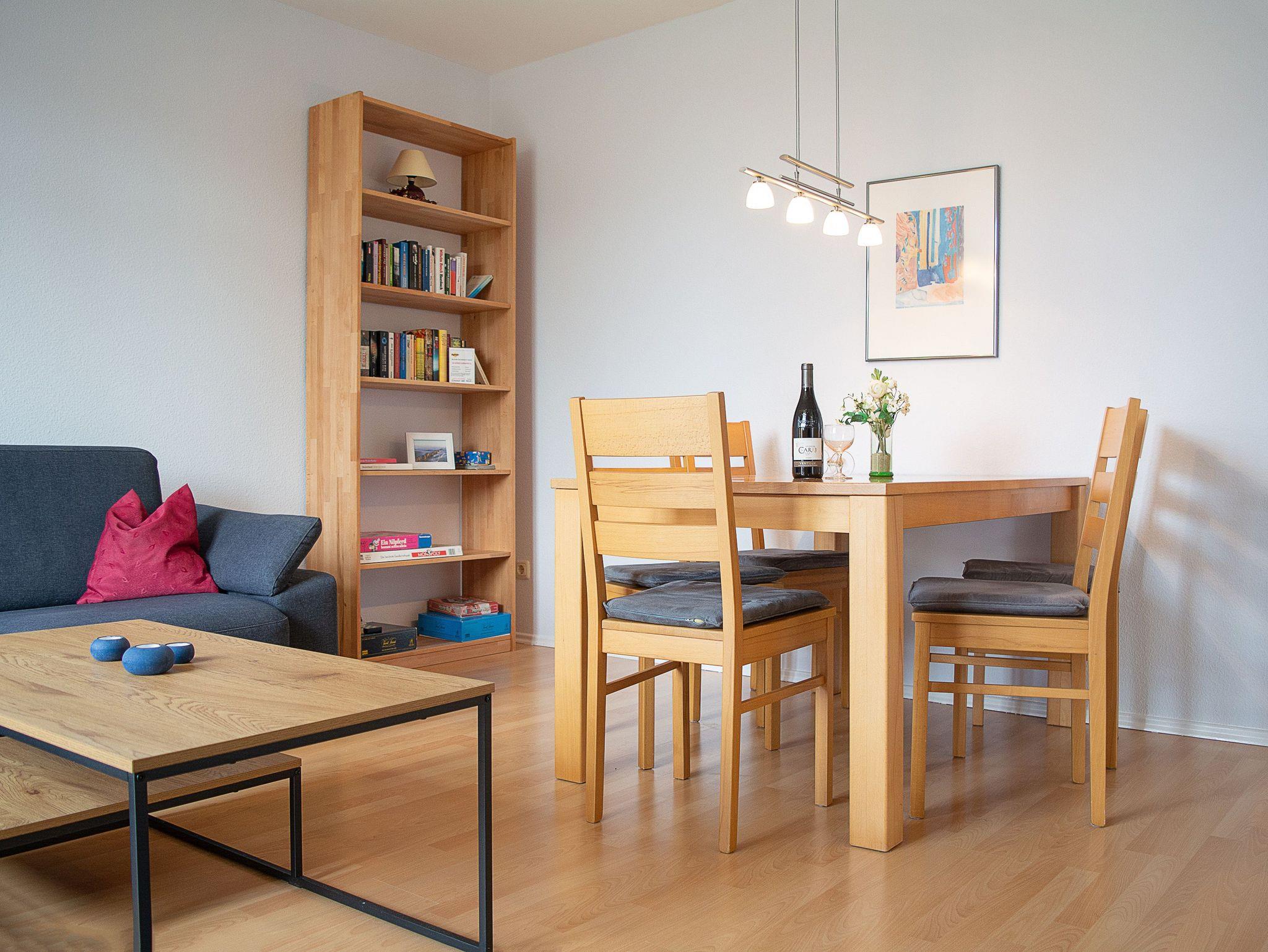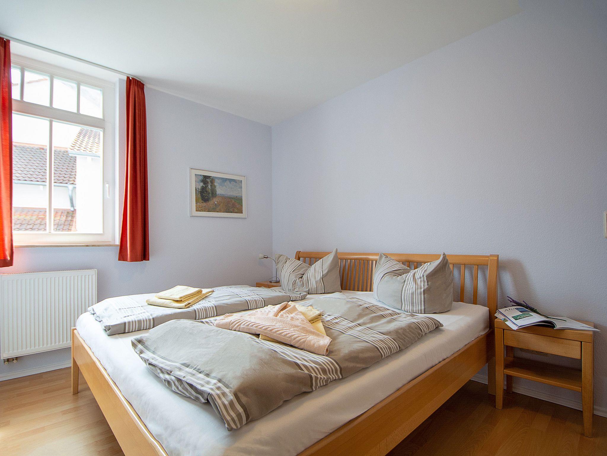 Sie wohnen in einer liebevoll eingerichteten 3-Raum-Wohnung von ca. 70 qm Größe, die im ersten Obergeschoss liegt. Das Wohnzimmer ist ausgestattet mit Küchenzeile (Herd mit Backofen, Geschirrspüler, Kaffeemaschine, Wasserkocher, Toaster), bequemer Sitzgarnitur, Essecke, Stereoanlage, HD Flatscreen TV und BluRay/ DVD Player. Vom Wohnraum aus betreten Sie den Balkon in Richtung Westen, der zum Entspannen einlädt. Ein Schlafzimmer mit Doppelbett und ein Schlafzimmer mit Schlafcouch sowie das Bad mit Dusche und WC vervollständigen das Gesamtbild dieser Wohnung.