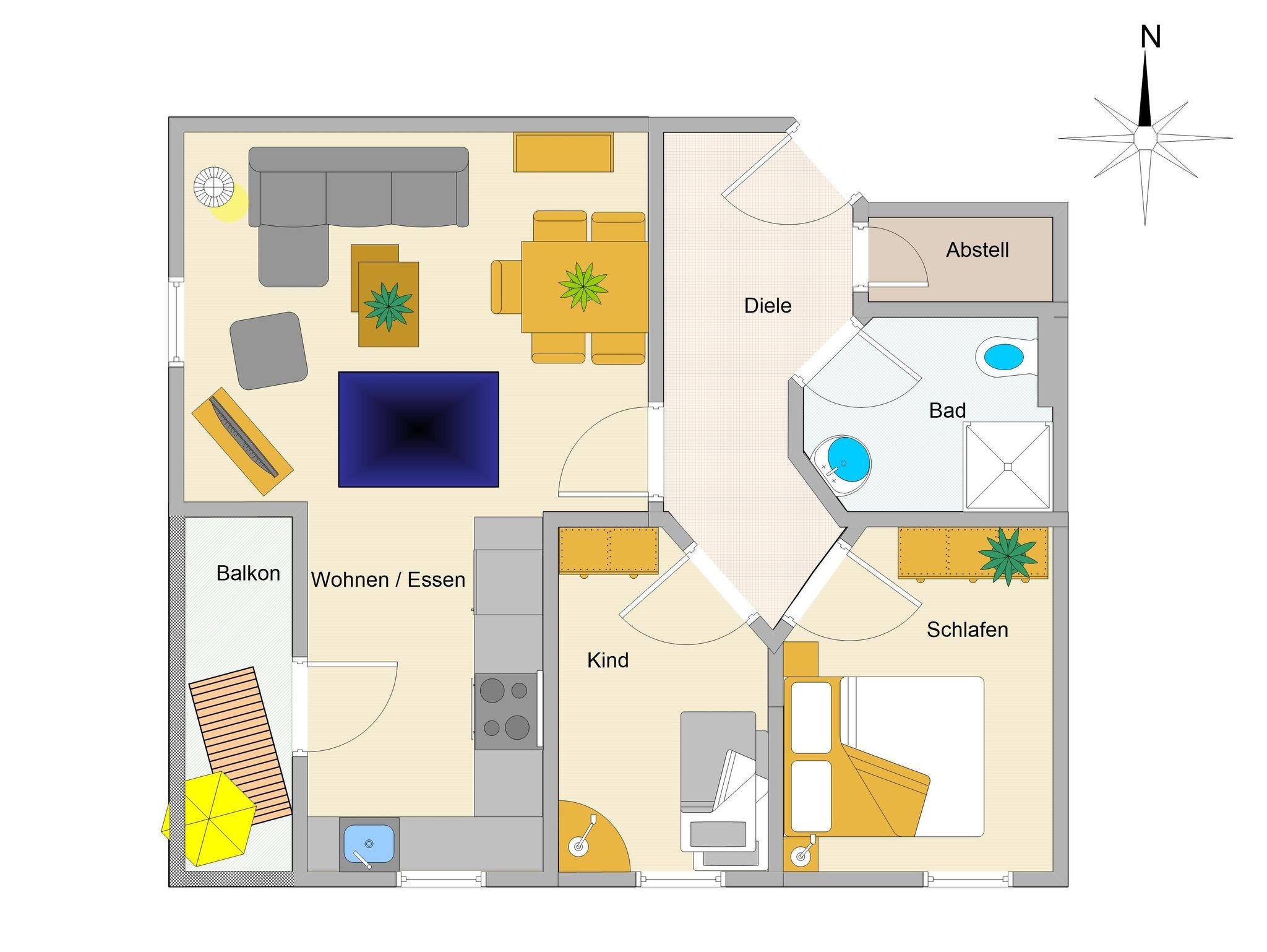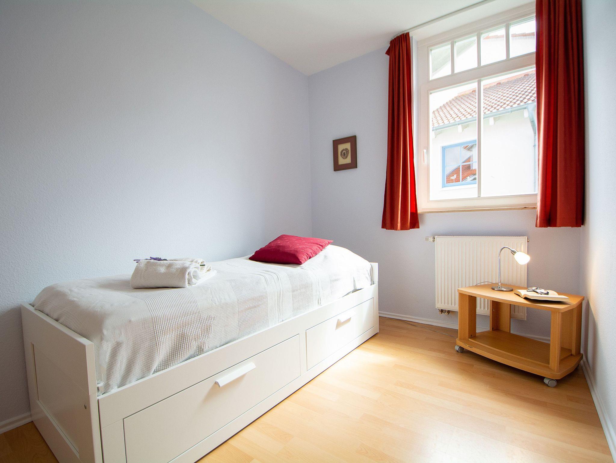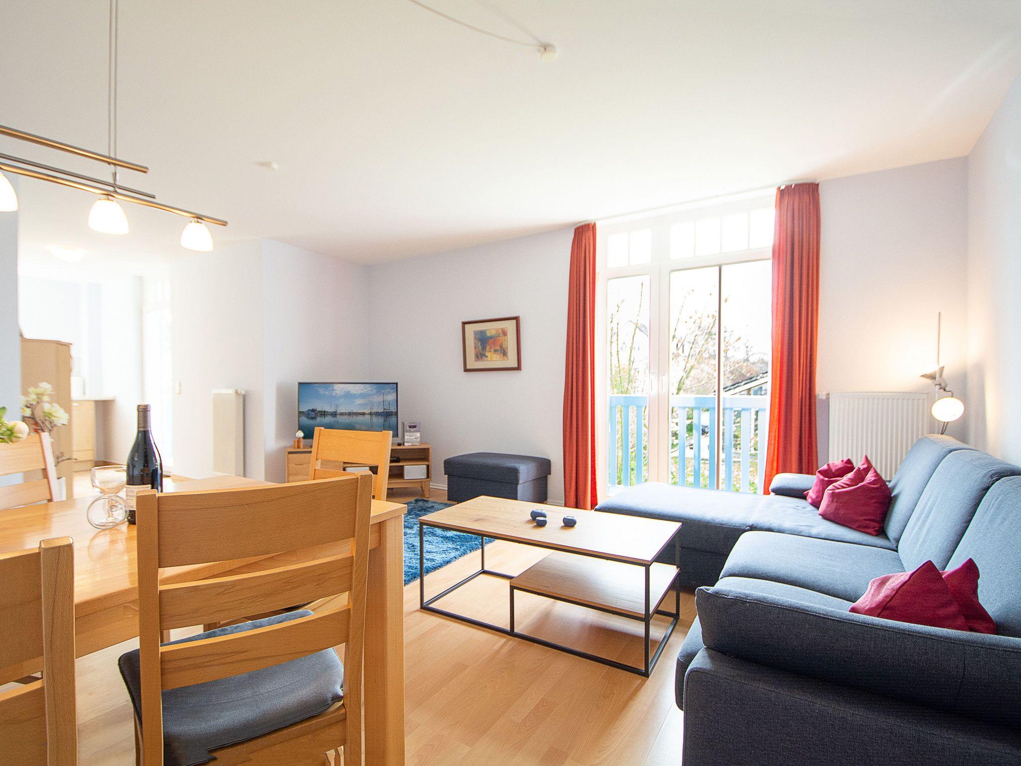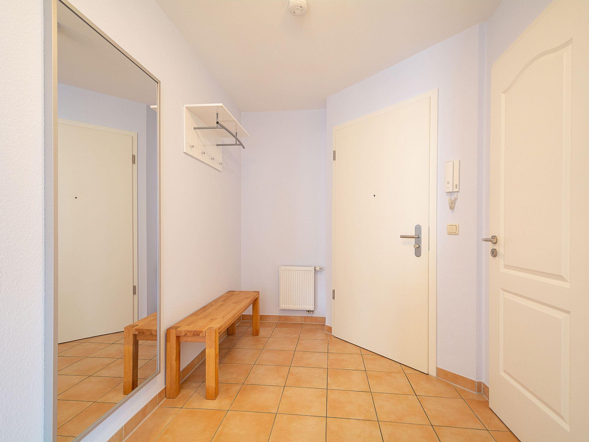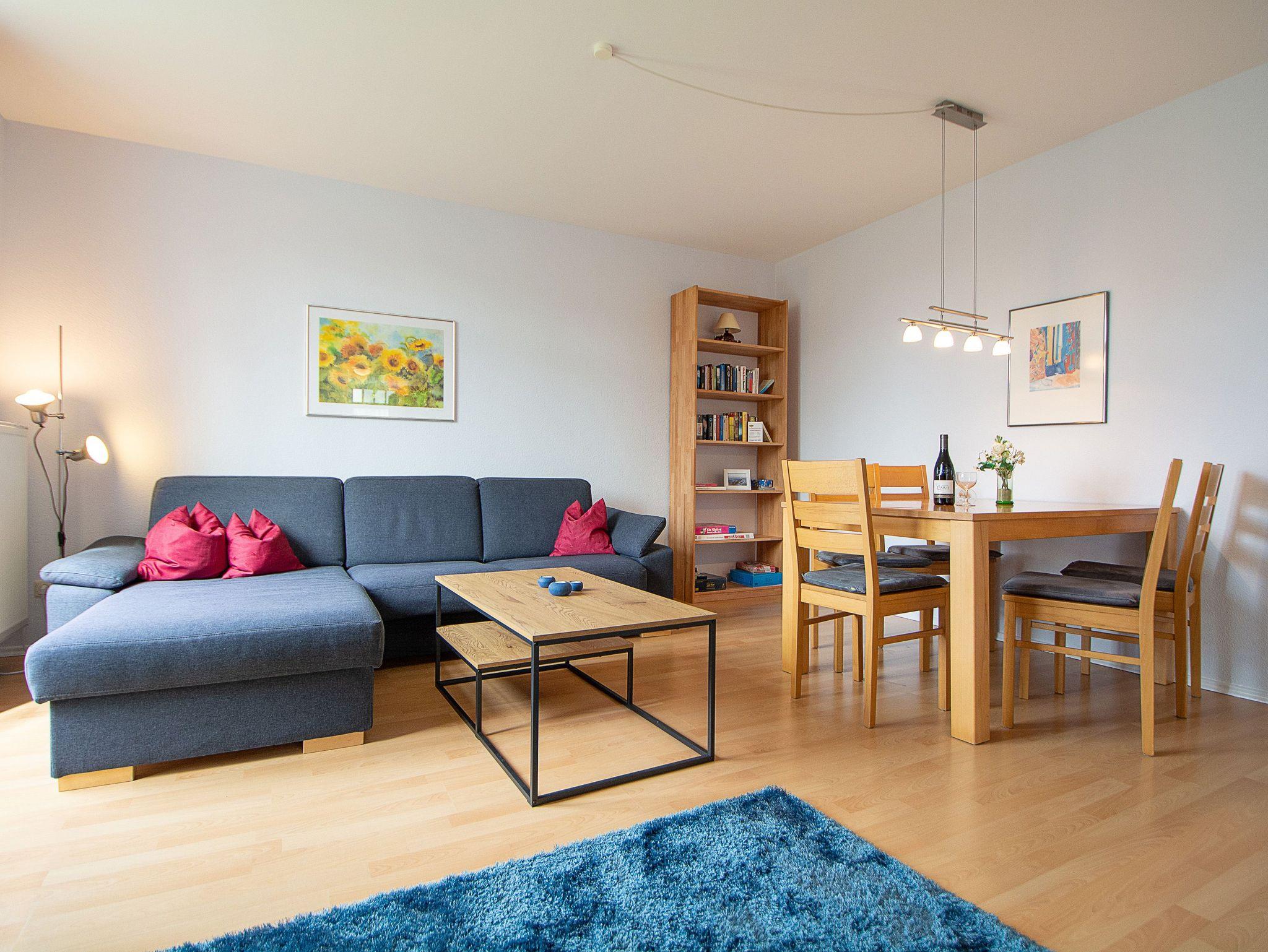 Sie wohnen in einer liebevoll eingerichteten 3-Raum-Wohnung von ca. 70 qm Größe, die im ersten Obergeschoss liegt. Das Wohnzimmer ist ausgestattet mit Küchenzeile (Herd mit Backofen, Geschirrspüler, Kaffeemaschine, Wasserkocher, Toaster), bequemer Sitzgarnitur, Essecke, Stereoanlage, HD Flatscreen TV und BluRay/ DVD Player. Vom Wohnraum aus betreten Sie den Balkon in Richtung Westen, der zum Entspannen einlädt. Ein Schlafzimmer mit Doppelbett und ein Schlafzimmer mit Schlafcouch sowie das Bad mit Dusche und WC vervollständigen das Gesamtbild dieser Wohnung.