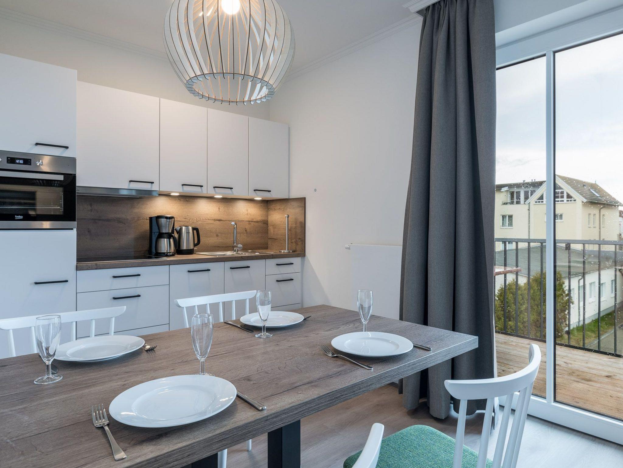 Das Bad verfügt über eine Dusche, einem Haartrockner und einem Handtuchtrockner. Zu Ihrem Apartment gehört ebenfalls ein großer und lichtdurchfluteter Wohn- und Essbereich mit offener Küche.