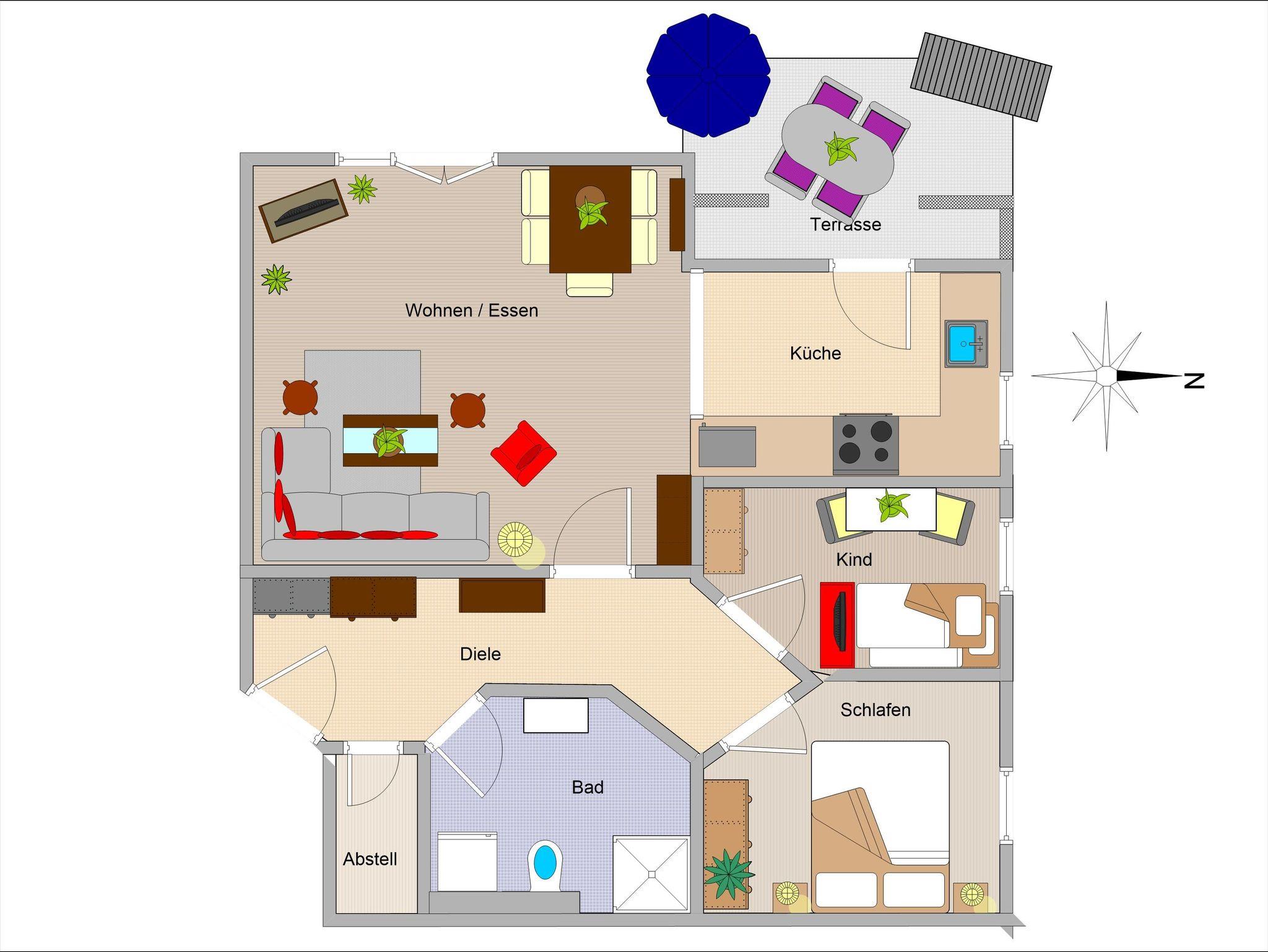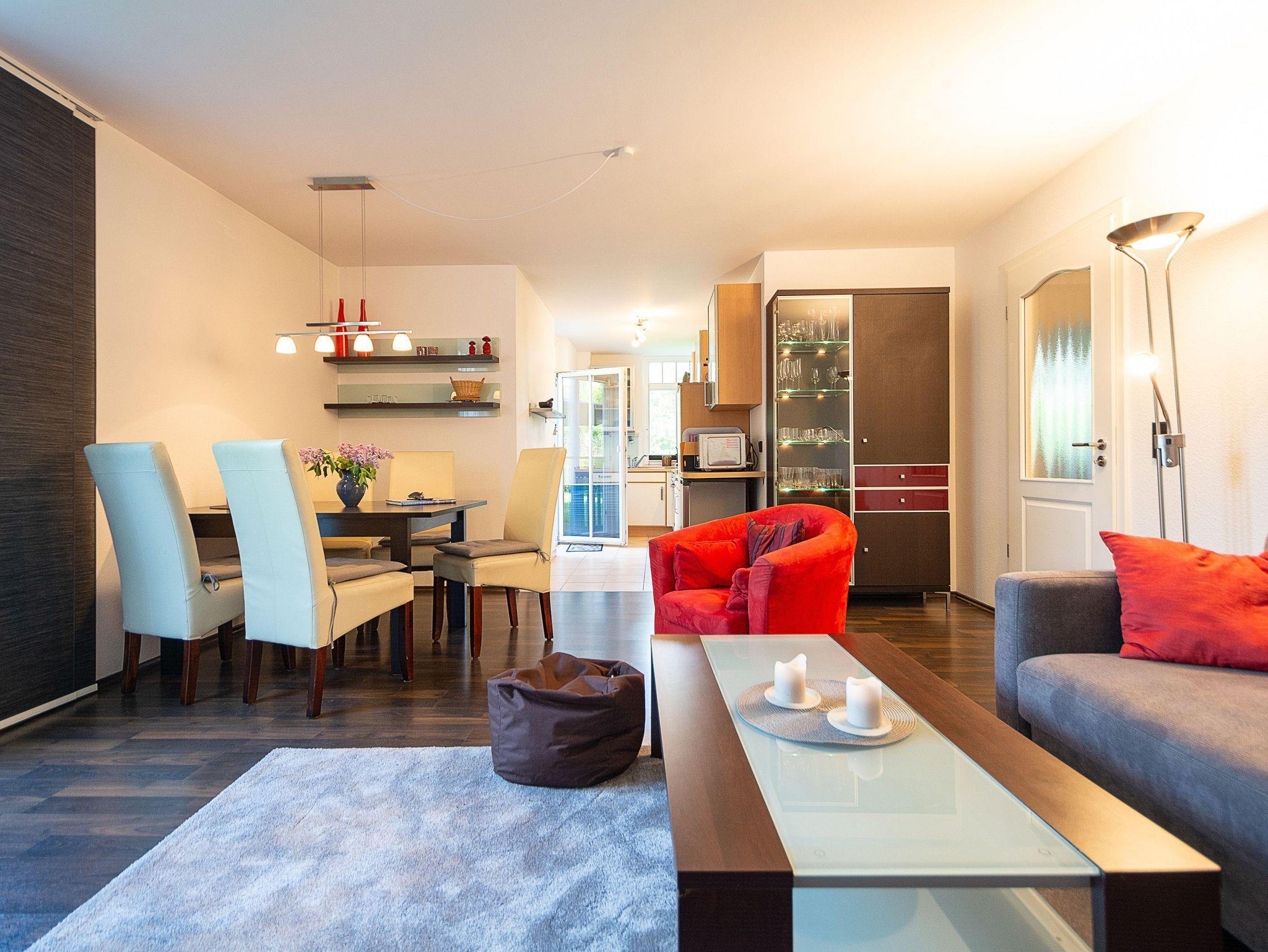 Herzlich willkommen in der liebevoll eingerichteten Wohnung Nr. 02 in der Villa Strandbrise. Es empfängt Sie eine moderne 3-Raum-Ferienwohnung, die auf 68qm Platz für 2 bis 4 Personen bietet. Der freundliche Wohnbereich ist ausgestattet mit einer gemütlichen Wohnlandschaft, Flachbild-TV und Musikanlage sowie einem Esstisch. Anschließend befindet sich die offene Küchenzeile, die mit allen wichtigen Küchengeräten und -utensilien ausgestattet ist, die Sie für Ihr perfektes Dinner benötigen: 4-Platten-Cerankochfeld mit Dunstabzug, Backofen, Geschirrspüler, Kühlschrank und Tiefkühlschrank sowie Mikrowelle, Kaffeemaschine, Wasserkocher, Toaster und Eierkocher sind in der mit viel Liebe zum Detail ausgestatteten Küche vorhanden. Von der Küche betreten Sie die durch ein Fliegengitter gesicherte Terrasse. Die großzügig gestaltete Terrasse mit anschließender Grünfläche ist ausgestattet mit einem großen Sonnenschirm sowie Tisch, Stühle und einem Liegestuhl. Hier können Sie relaxen, Sonnenbaden oder den Abend zu einem Glas Wein ausklingen lassen. Das erste Schlafzimmer bietet ein bequemes Doppelbett und einen großen Kleiderschrank für Ihre Urlaubsgarderobe. Im zweiten Schlafzimmer befinden sich ein Etagenbett, ein kleiner Kleiderschrank, ein Flachbild-TV sowie ein ausklappbarer Schreibtisch mit zwei Stühlen. Im gefliesten Bad mit Dusche und WC befinden sich eine Waschmaschine und ein Trockner.