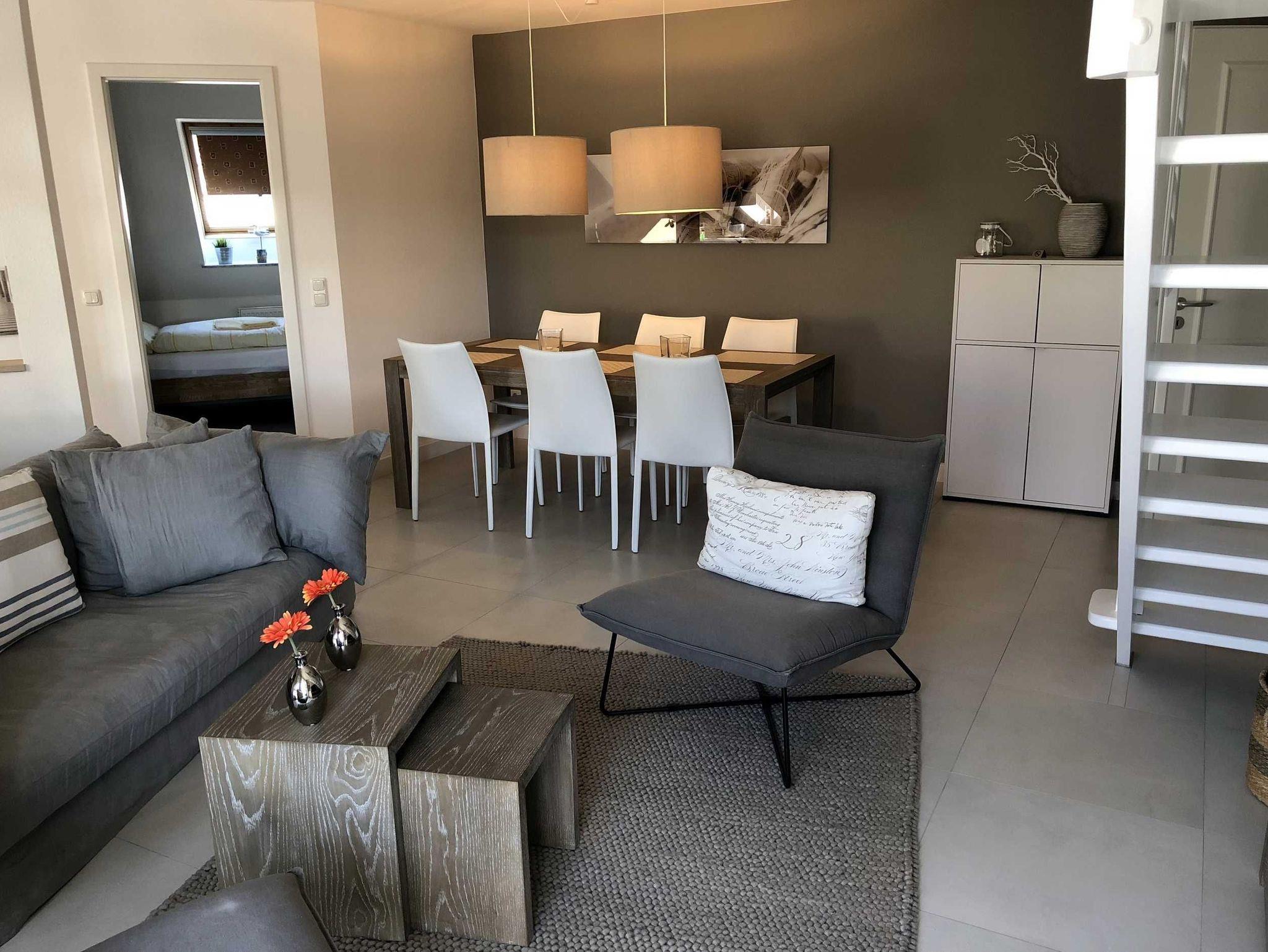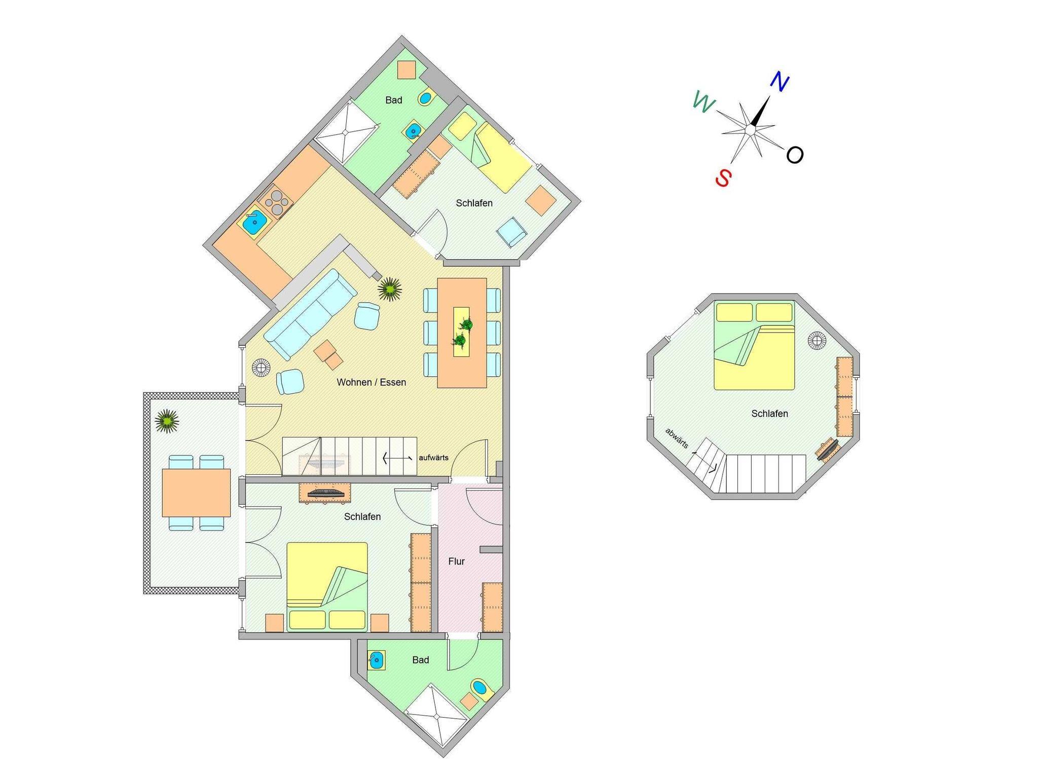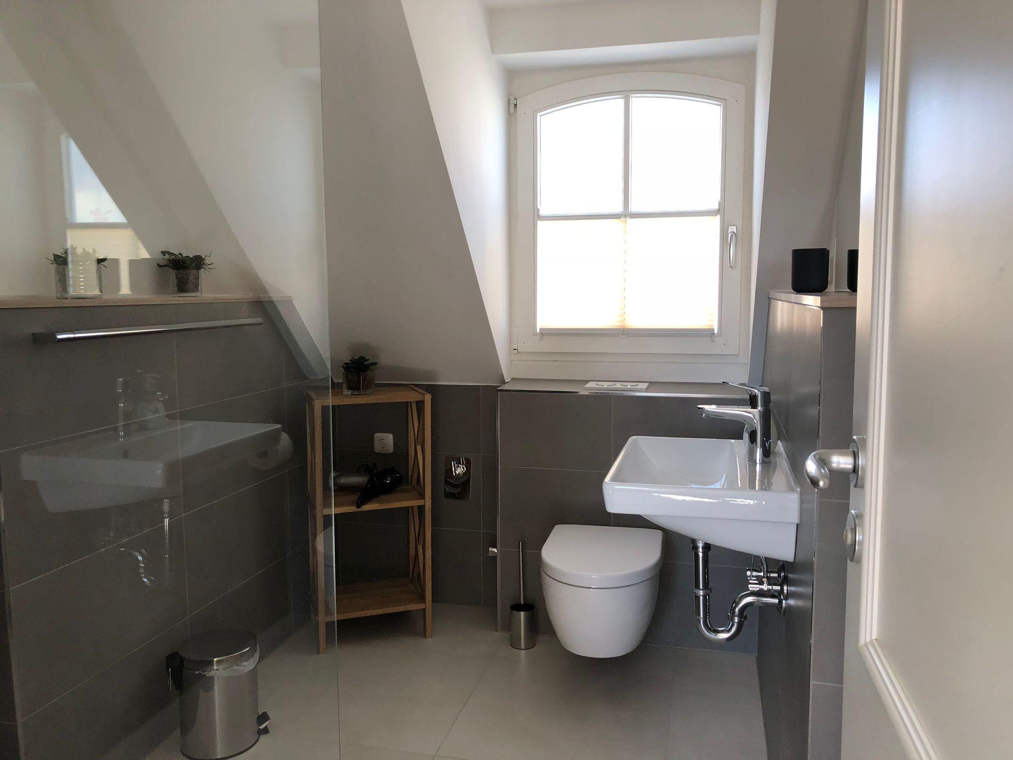 Sie wohnen in einer ca. 80 m² großen 4-Raum-Maisonettewohnung, die sich im 2. Obergeschoss der Villa Barbarossa befindet. Das Wohnzimmer ist ausgestattet mit einer gemütlichen Sitzecke, einem 39-Zoll-Flachbild-Fernseher, einer Essecke und der offenen Küchenzeile (Geschirrspüler, Backofen, Mikrowelle, Kühlschrank mit Gefrierfach und vielen weiteren Küchenutensilien). In der Wohnung befinden sich 3 Schlafzimmer. Das erste Schlafzimmer ist mit einem Doppelbett (180 cm x 200 cm) und Kleiderschrank ausgestattet, das zweite Schlafzimmer verfügt über ein Einzelbett (90 cm x 200 cm) sowie einen weiteren Kleiderschrank und einem Sitzbereich. Das dritte Schlafzimmer befindet sich im Türmchen und ist über eine Treppe vom Wohnzimmer aus erreichbar. Hier befindet sich ein weiteres Doppelbett (180 cm x 200 cm) sowie ein weiterer Fernseher (31 Zoll). Die beiden Bäder mit Dusche und WC vervollständigen das Gesamtbild dieser geschmackvollen und hochwertigen Wohnung.