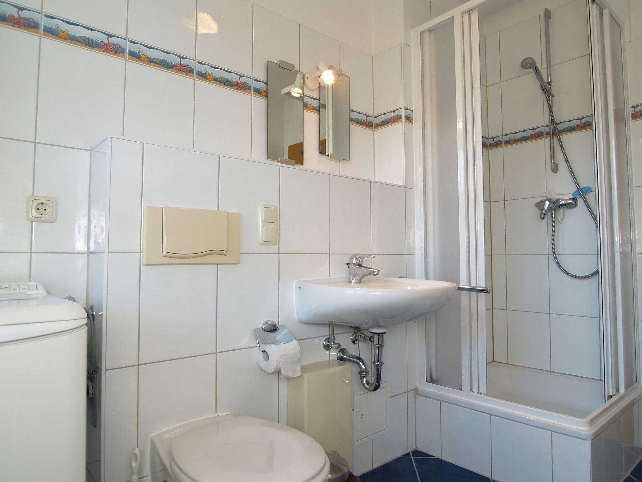 Das geflieste Tageslichtbad mit einer Dusche, Waschbecken und WC sowie einer Waschmaschine vervollständigt das Gesamtbild dieser Wohnung.