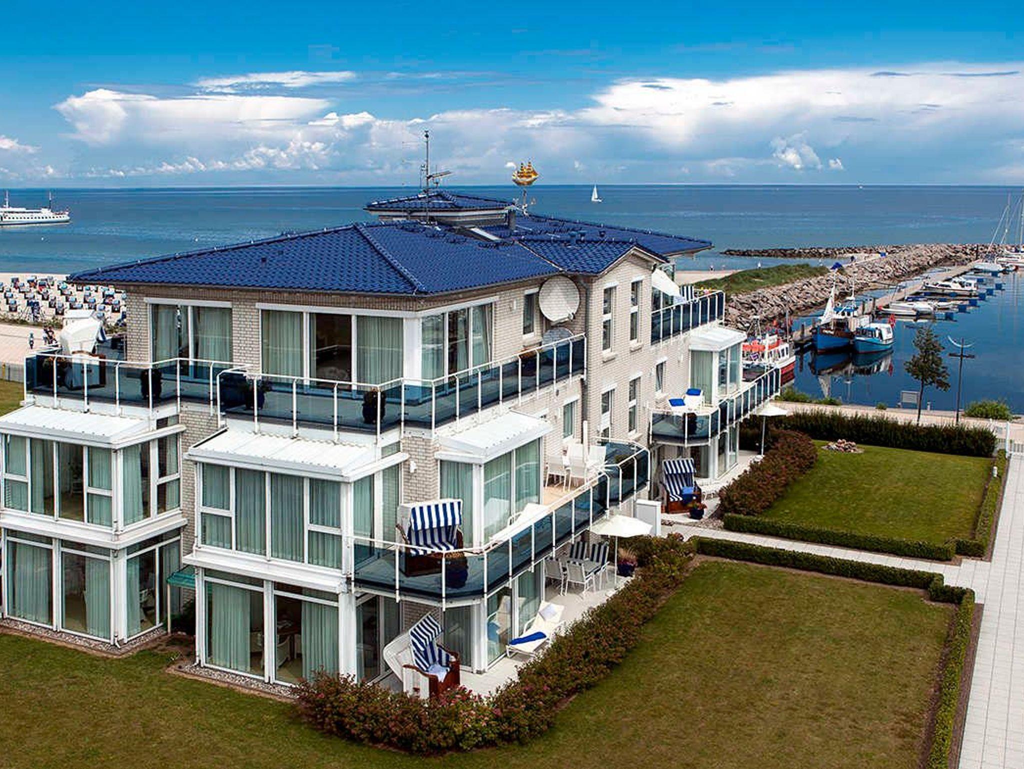 Von der Terrasse aus gelangen Sie in wenigen Schritten zum Hafen - oder quer über die Promenade direkt zum feinsandigen Badestrand, der hier 100 m breit ist. Ideal für Familien und Großeltern!