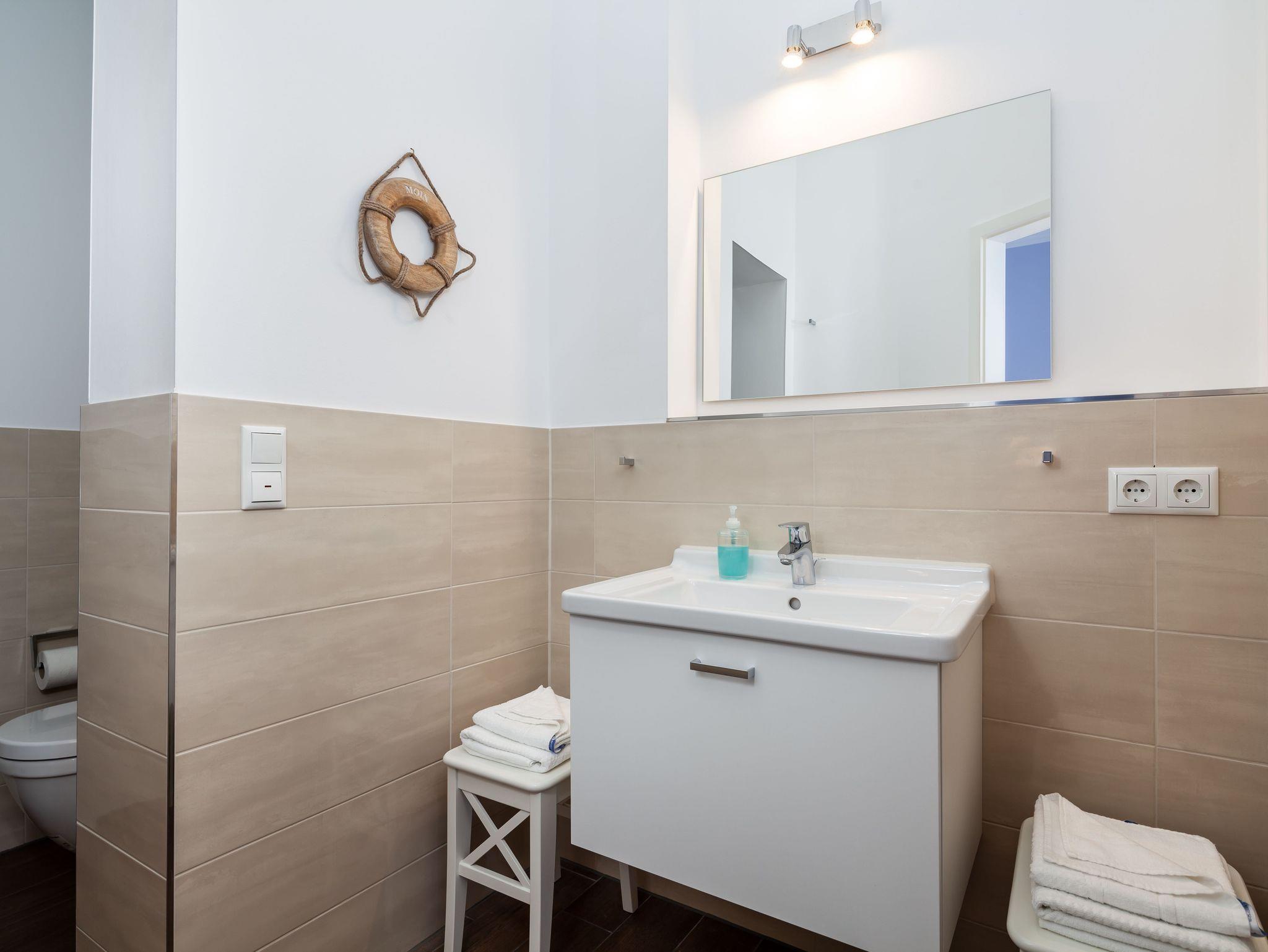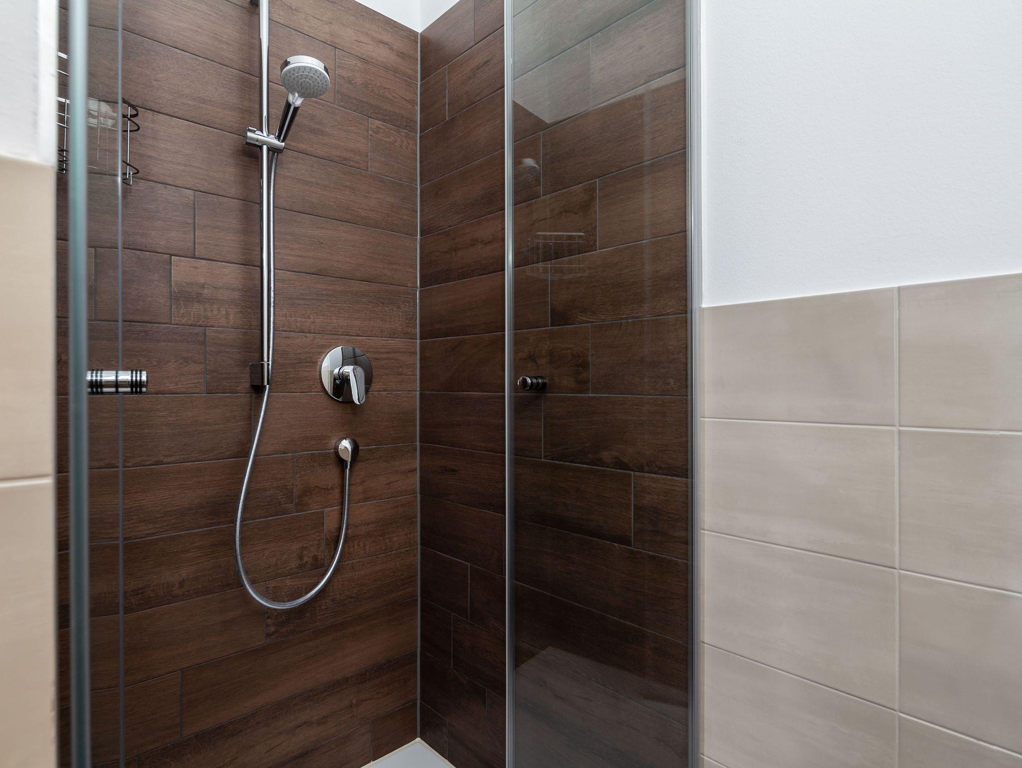 Badezimmer mit ebenerdiger Dusche, WC und Anrichte