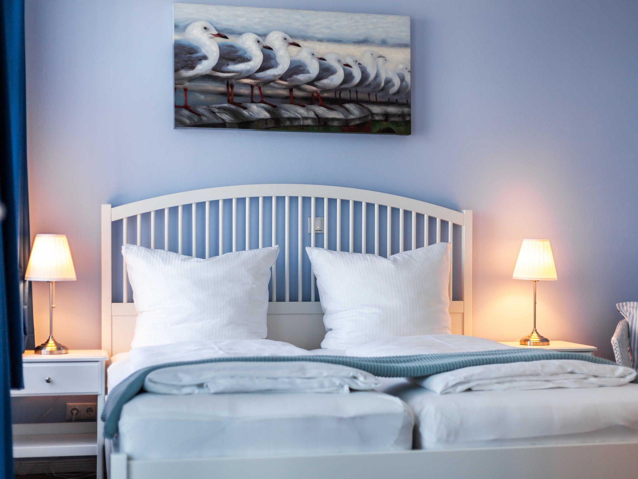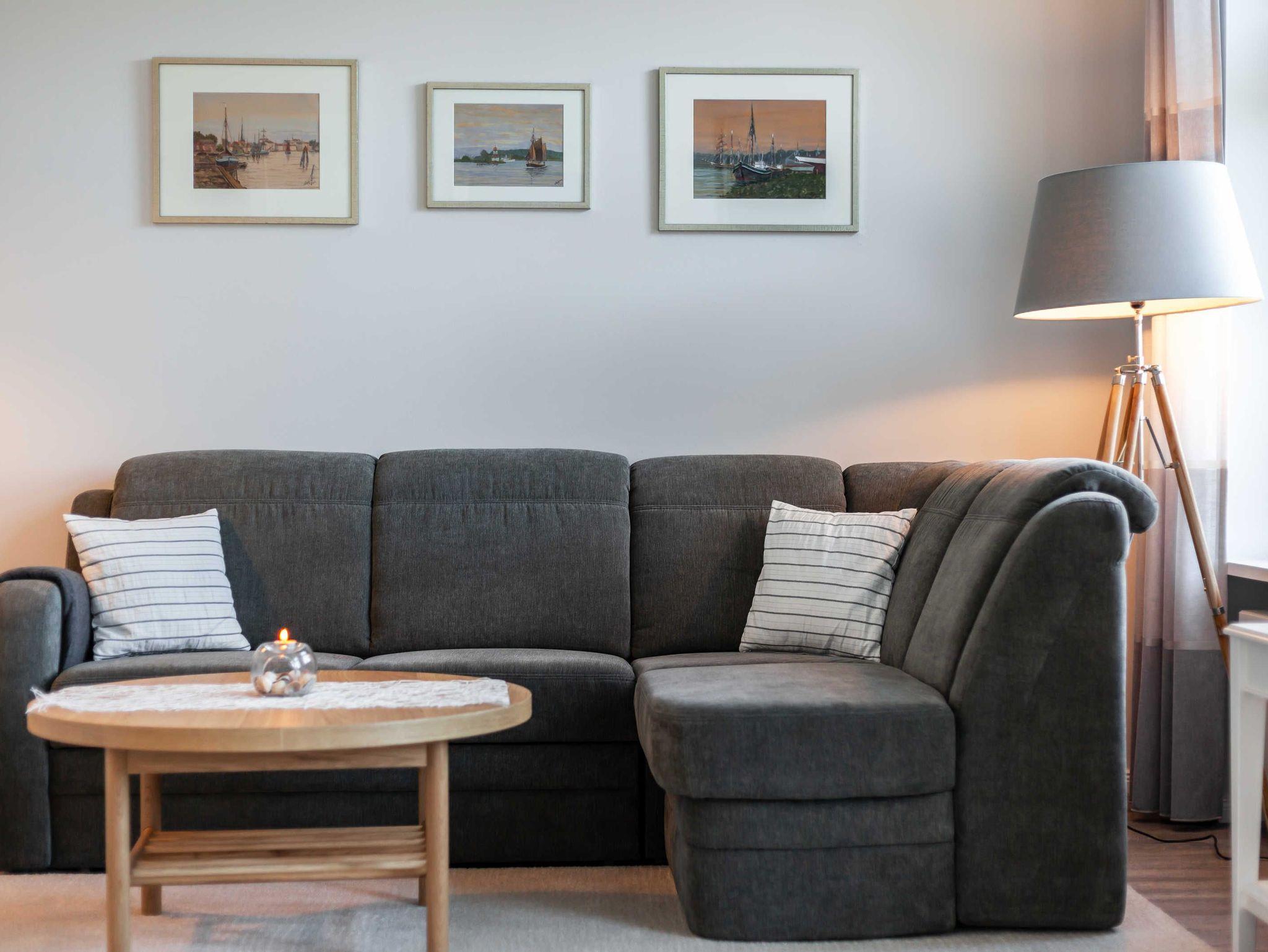 Nur 150 m vom Strand wohnen Sie in einer 2-Raum-Ferienwohnung. Die 45 qm große Wohnung liegt in der 1. Etage. Das Wohnzimmer ist mit einer Couch, Couchtisch, Sessel, Anrichte, mit Kabel-TV, Radio, Essbereich (Tisch und Stühle) und Küchenzeile ausgestattet. Der Balkon mit Tisch und Stühle geht zur Nordseite. Im Schlafzimmer stehen ein Doppelbett und ein Kleiderschrank. Die Küchenzeile wurde ausgestattet mit Mikrowelle, Kühlschrank, Kaffeemaschine, Ceran-Kochfeld,Toaster und Wasserkocher. Das Bad mit Dusche und WC komplettiert die Wohnung.