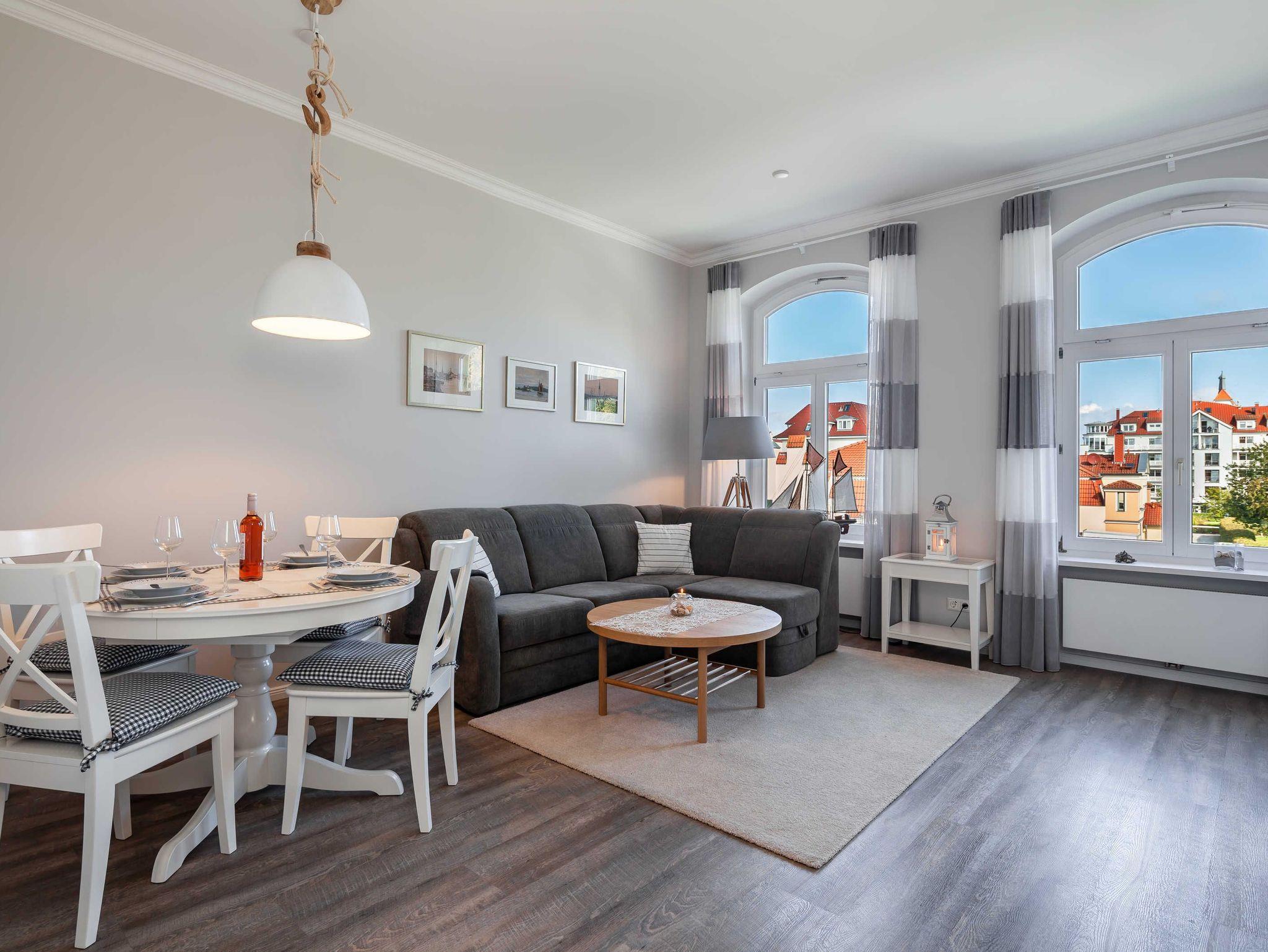 Wohnzimmer mit Schlafcouch, Esstisch, Küchenzeile, Kabel-TV, Radio und passwortgeschützes WLan