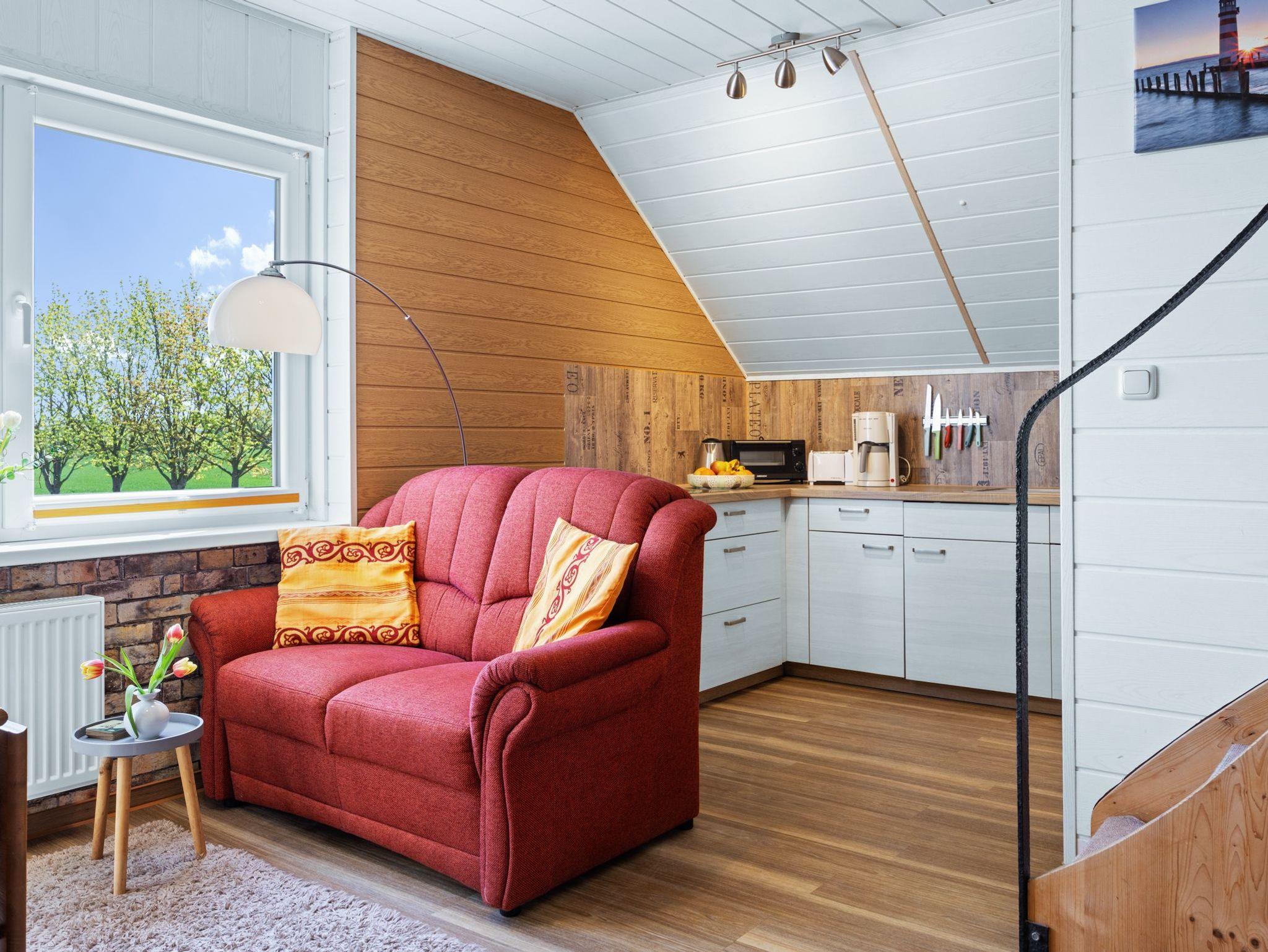 Helle und freundliche 2- Zimmer Ferienwohnung über 2 Etagen. Wohnzimmer mit Couchecke, TV und Esstisch. Küchenzeile mit 2- Plattenherd, Kühlschrank, Kaffeemaschine, Wasserkocher und Toaster. Bad mit Dusche und WC. Eine Treppe führt in das Schlafzimmer im OG (geschlossener Raum) mit Doppelbett (1,80 x 2m) und Kleiderkommode. Aus der Ferienwohnung lässt sich ein herrlicher Blick auf das Ostseebad Kühlungsborn genießen.