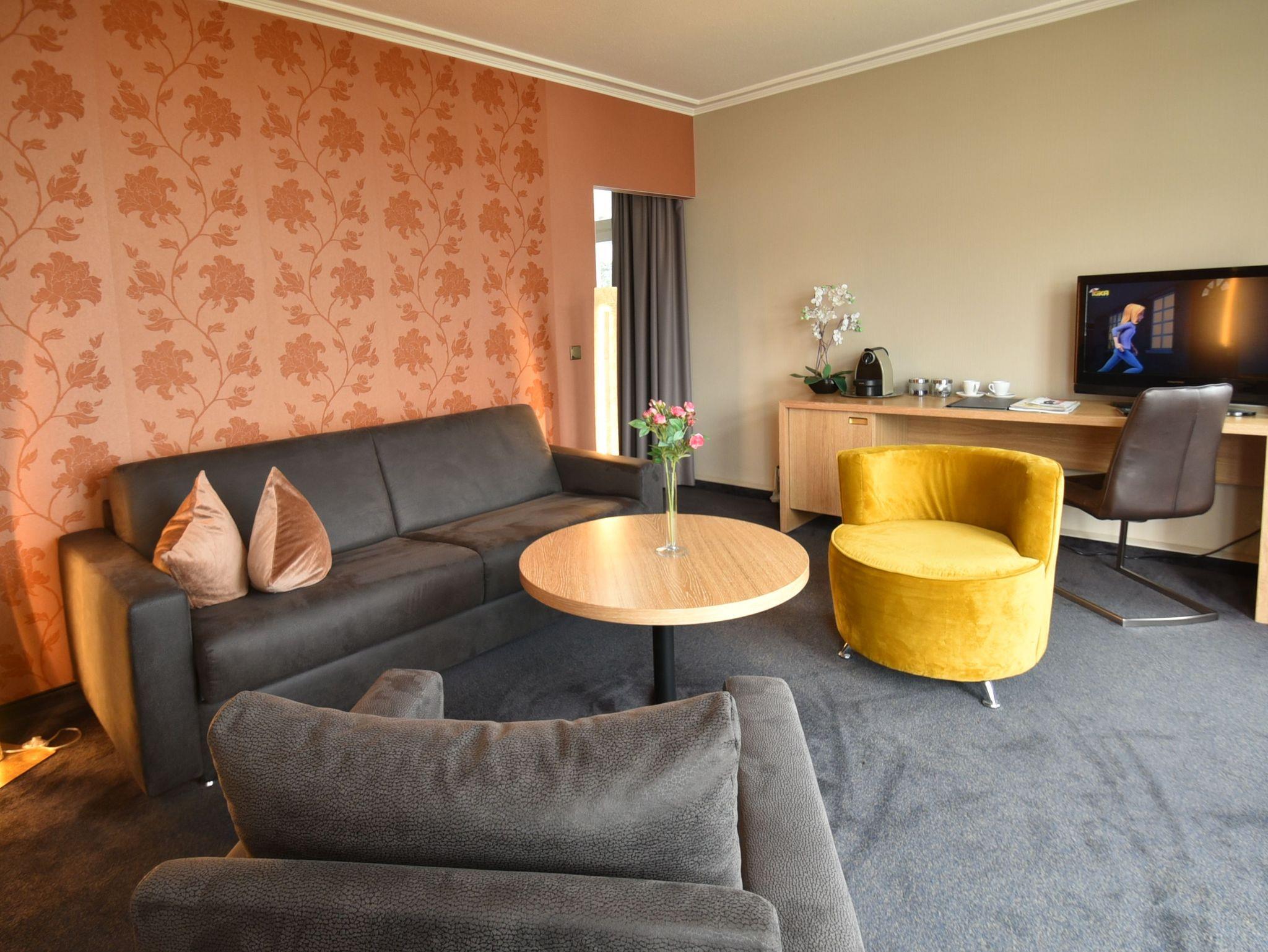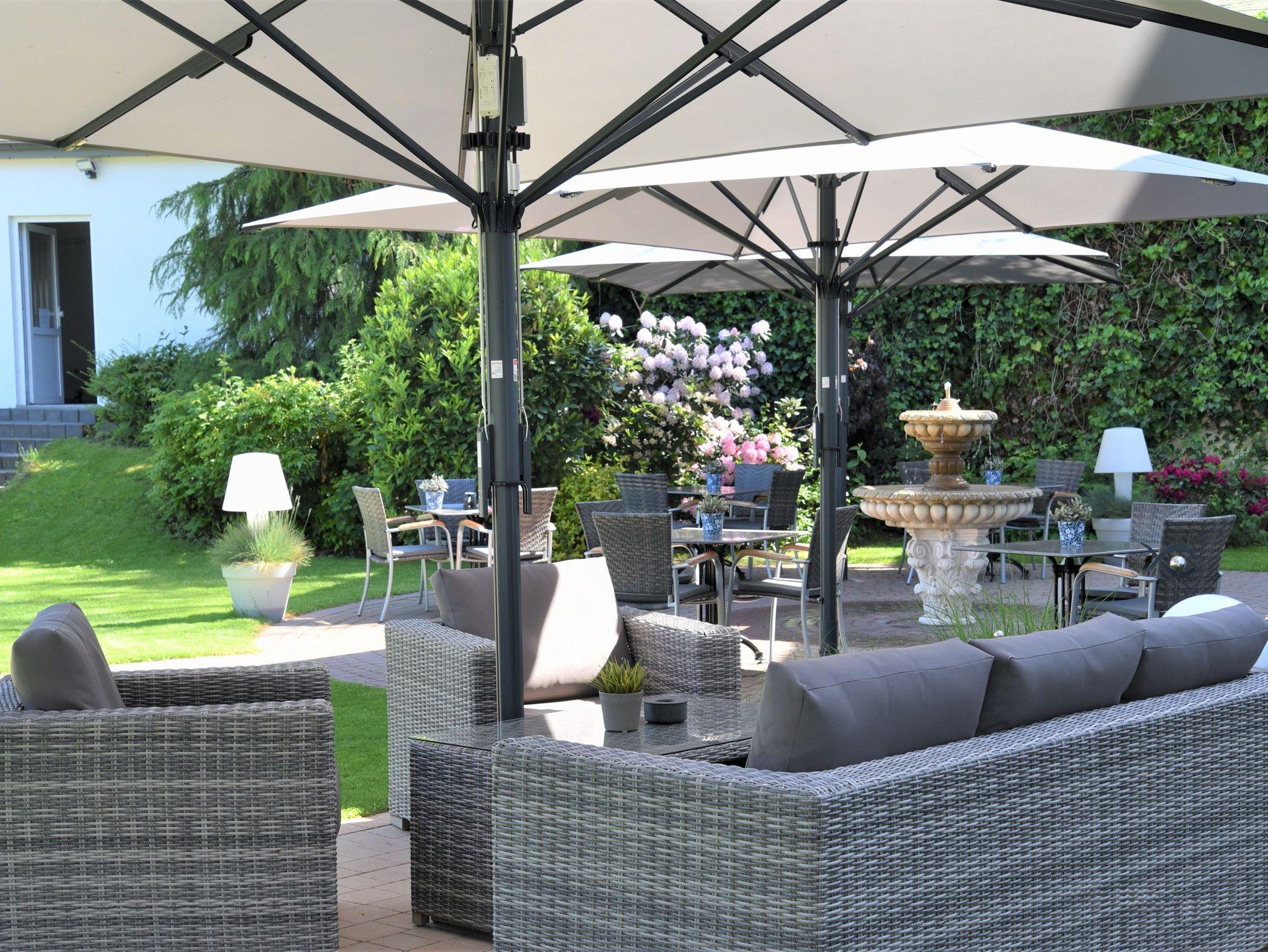 geräumige Doppelzimmer, ausgestattet mit Boxspringbetten, Schreibtisch mit Sessel, teilweise Balkon mit Gartenblick, Minibar, größtenteils separates WC, Bad mit Dusche oder Wanne.
