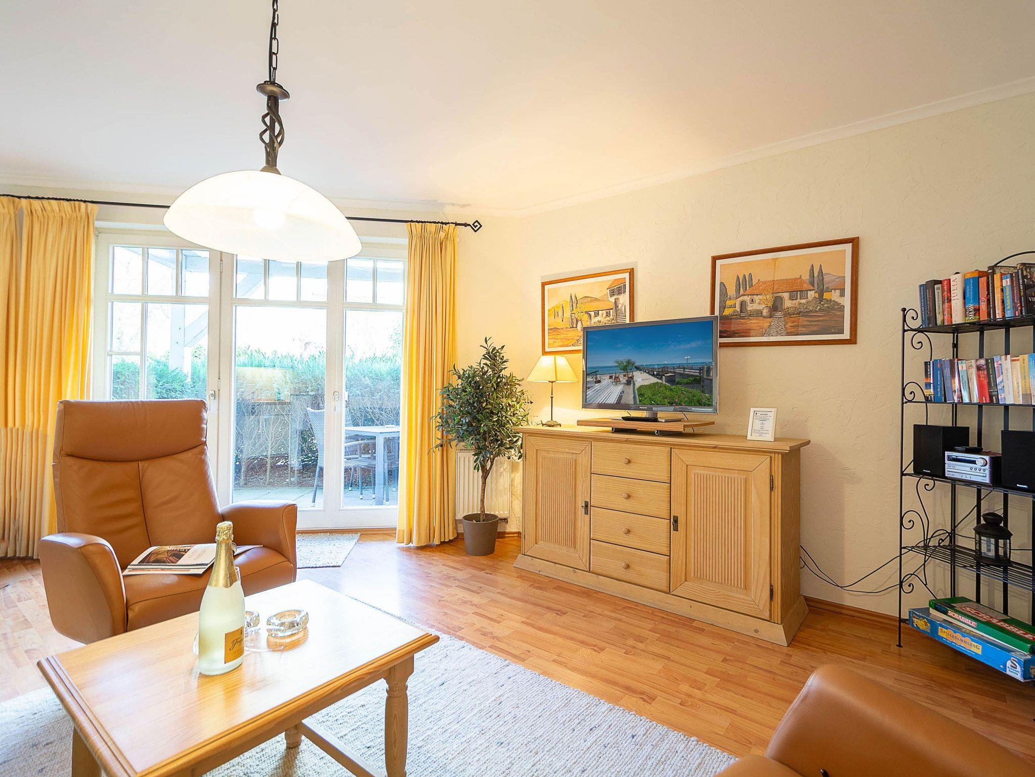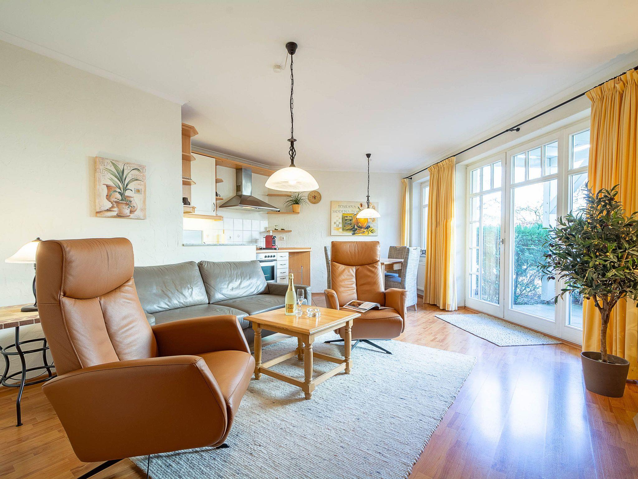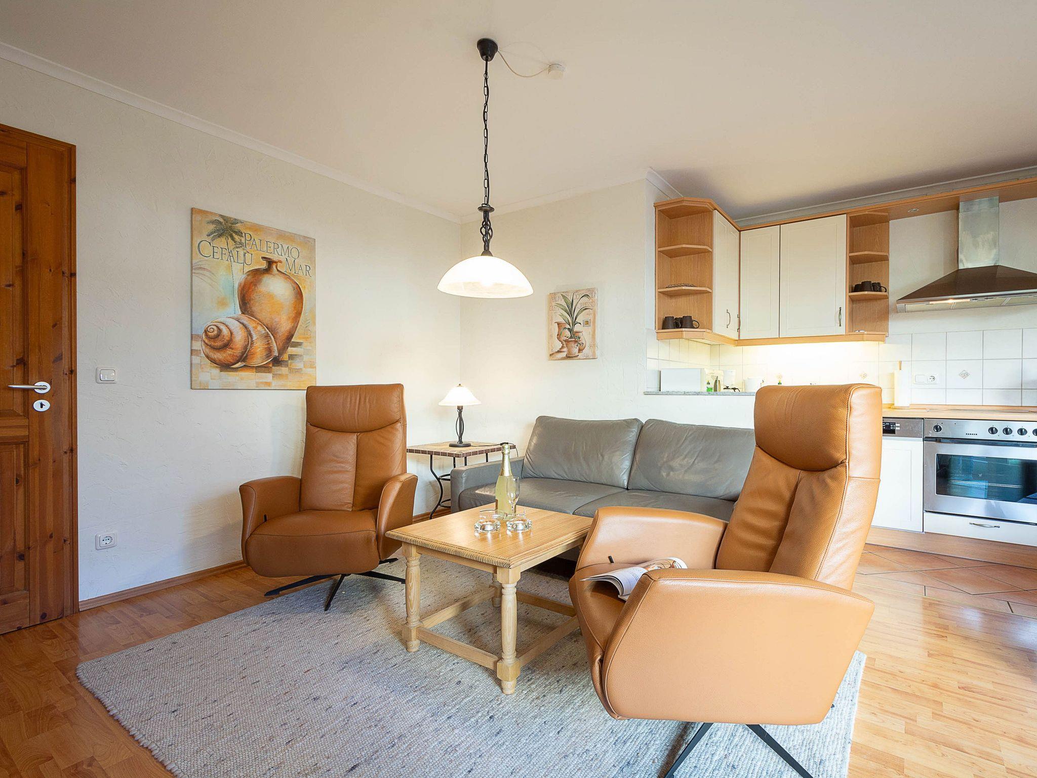 Sie wohnen in einer 62m² großen 3-Raum-Ferienwohnung, die sich im Erdgeschoss der Villa Barbarossa befindet. Der freundliche offene Wohnraum ist ausgestattet mit einer Couchgarnitur, einem Esstisch sowie einem 36-Zoll-Flachbild-TV und DVD-Player. Angrenzend befindet sich die voll ausgestattete Küchenzeile, die über alle wichtigen Küchengeräte und -utensilien verfügt. Ein 4-Zonen-Ceranfeld mit Backofen und Dunstabzug, ein Geschirrspüler, eine Mikrowelle sowie ein Kühlschrank mit Gefrierfach befinden sich in der Küche. Eine Kaffeemaschine, ein Wasserkocher, ein Toaster sowie ausreichend Geschirr vervollständigen die Kücheneinrichtung. Vom Wohnraum aus betreten Sie die möblierte nach Norden ausgerichtete Terrasse. Ein Schlafzimmer mit Doppelbett (180 cm x 200 cm), ein Schlafzimmer mit Einzelbett (90 cm x 200 cm) und weiterem Flachbild-TV (31 Zoll) sowie das Bad mit Dusche und WC vervollständigen das Gesamtbild dieser Wohnung.