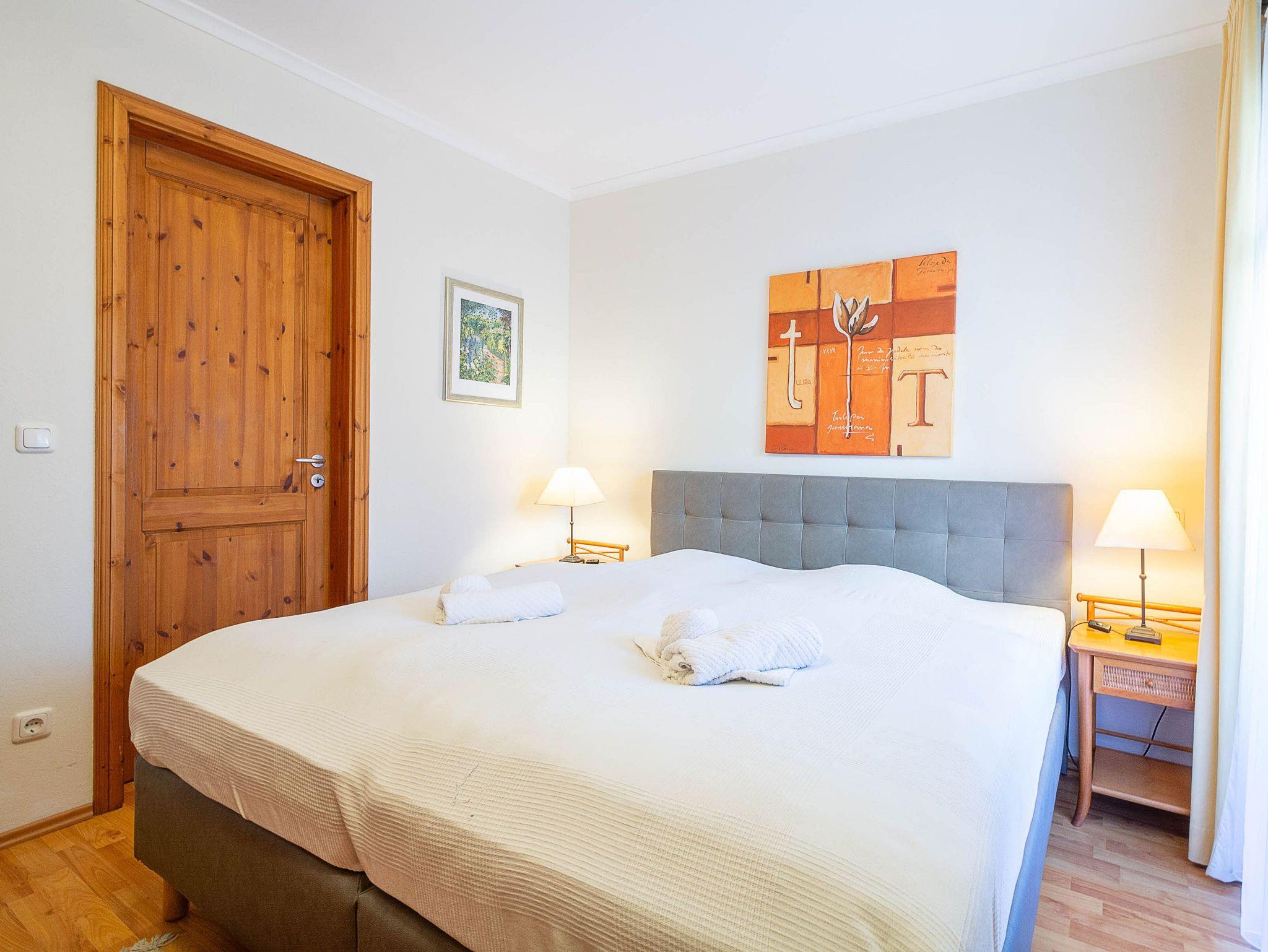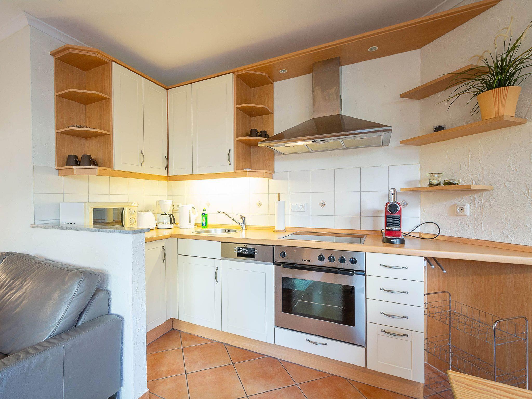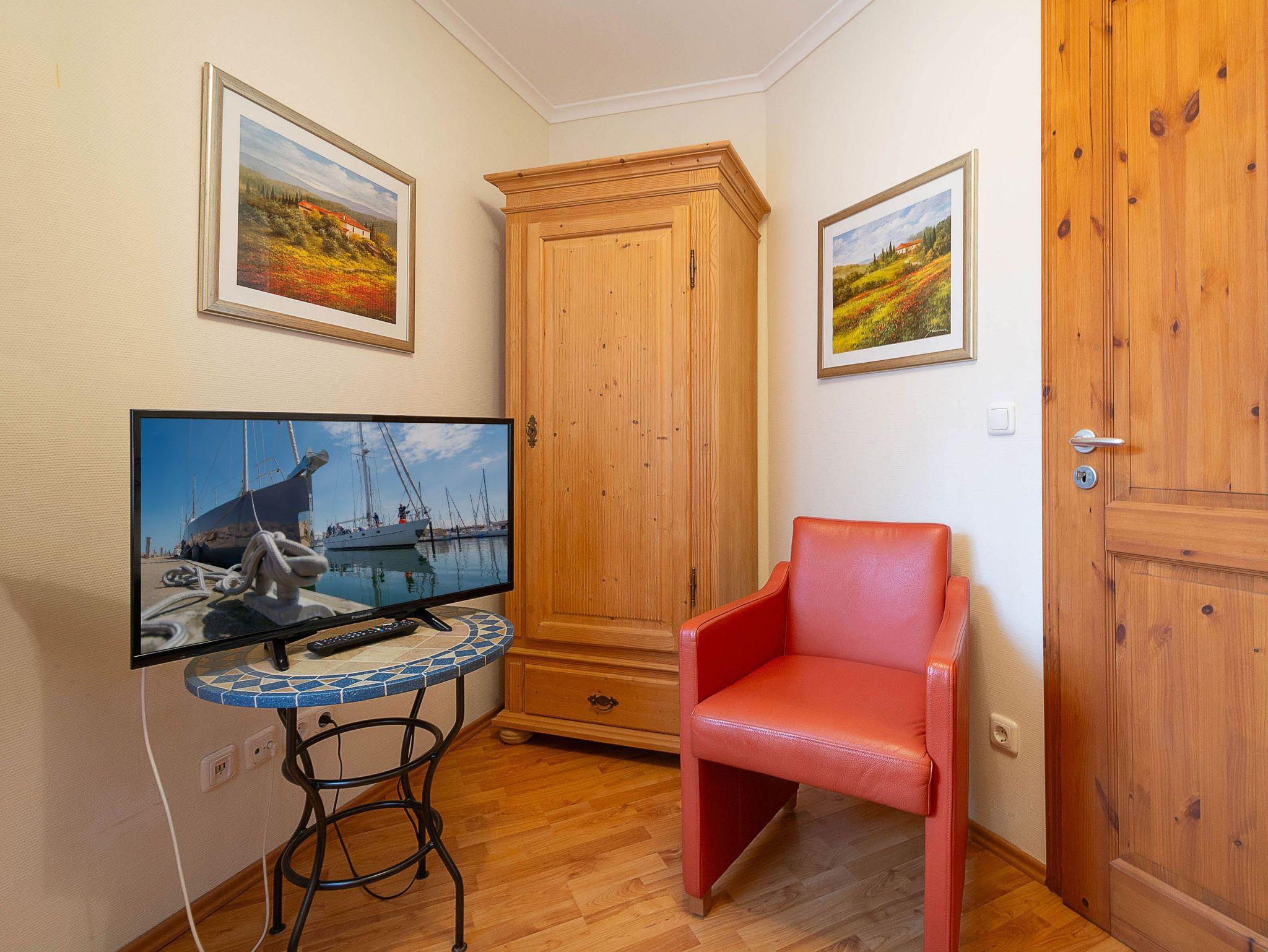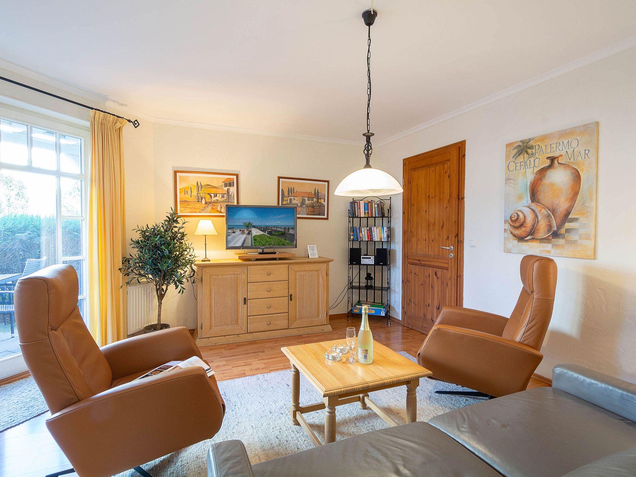 Sie wohnen in einer 62m² großen 3-Raum-Ferienwohnung, die sich im Erdgeschoss der Villa Barbarossa befindet. Der freundliche offene Wohnraum ist ausgestattet mit einer Couchgarnitur, einem Esstisch sowie einem 36-Zoll-Flachbild-TV und DVD-Player. Angrenzend befindet sich die voll ausgestattete Küchenzeile, die über alle wichtigen Küchengeräte und -utensilien verfügt. Ein 4-Zonen-Ceranfeld mit Backofen und Dunstabzug, ein Geschirrspüler, eine Mikrowelle sowie ein Kühlschrank mit Gefrierfach befinden sich in der Küche. Eine Kaffeemaschine, ein Wasserkocher, ein Toaster sowie ausreichend Geschirr vervollständigen die Kücheneinrichtung. Vom Wohnraum aus betreten Sie die möblierte nach Norden ausgerichtete Terrasse. Ein Schlafzimmer mit Doppelbett (180 cm x 200 cm), ein Schlafzimmer mit Einzelbett (90 cm x 200 cm) und weiterem Flachbild-TV (31 Zoll) sowie das Bad mit Dusche und WC vervollständigen das Gesamtbild dieser Wohnung.