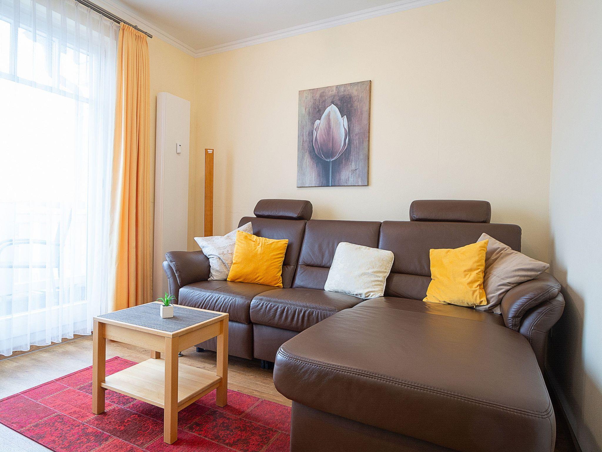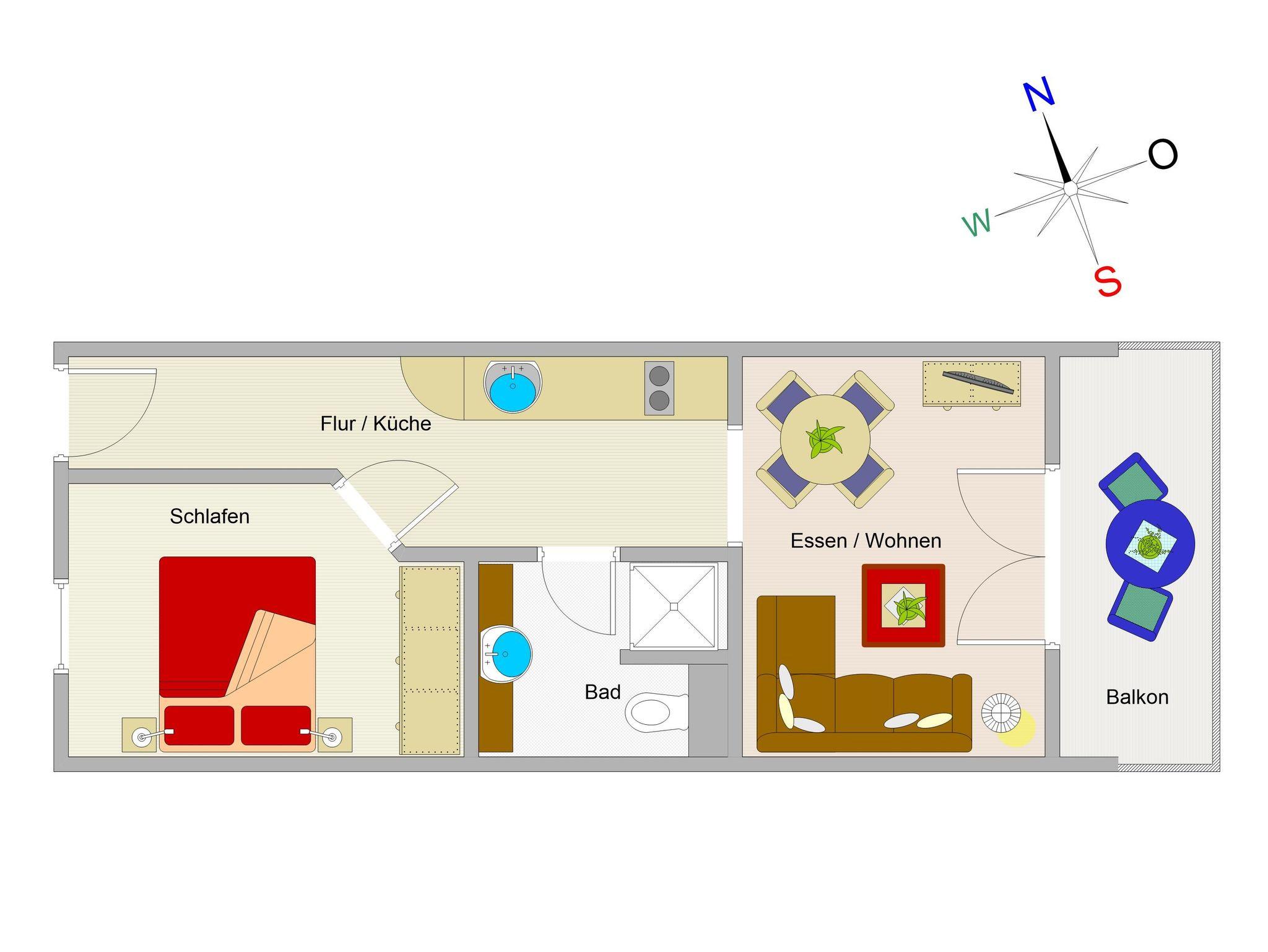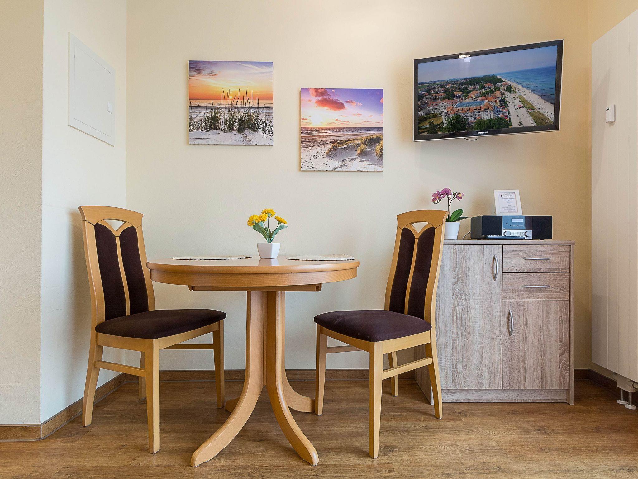 Herzlich Willkommen in unserer liebevoll eingerichteten Ferienwohnung Nr. 4.03 im Haus Meeresblick. Die gemütliche 2-Raum-Ferienwohnung von etwa 40qm Größe befindet sich auf der Ost-Seite des Hauses Meeresblick im vierten Obergeschoss und ist hervorragend für 2 Personen geeignet. Die Wohnung bietet all jenen Komfort, den der anspruchsvolle Gast für seinen erholsamen Urlaub erwartet. Es begrüßt Sie ein freundlicher offener Wohn- und Essbereich mit Lederecksofa mit Canapé sowie 32 Zoll-LED-Fernseher mit Kabelempfang und Kabel-Radio. Die offene Küchenzeile ist mit allen wichtigen Küchengeräten ausgestattet, die Sie für Ihr „perfektes Dinner“ benötigen: Geschirrspüler, Kühlschrank mit Eisfach, 2 Platten-Kochfeld, Mikrowelle, Kaffeemaschine, Toaster, Wasserkocher sowie reichlich Geschirr, Gläser, Besteck und Kochutensilien sind vorhanden. Vom Wohnbereich betreten Sie den möblierten Ost-Balkon mit herrlichem seitlichem Ausblick über die Strandpromenade auf die Ostsee. Von hier können Sie Ihr Frühstück in der Morgensonne genießen. Im Schlafzimmer befinden sich ein Doppelbett in massiver Kernbuche sowie mit Komforthöhe, 180 x 200 cm Liegefläche und Kaltschaummatrazen sowie ein Kleiderschrank. Das moderne Duschbad ist funktionell eingerichtet u.a. mit flacher Duschwanne, Waschbecken, großem Spiegel sowie einem Fön.